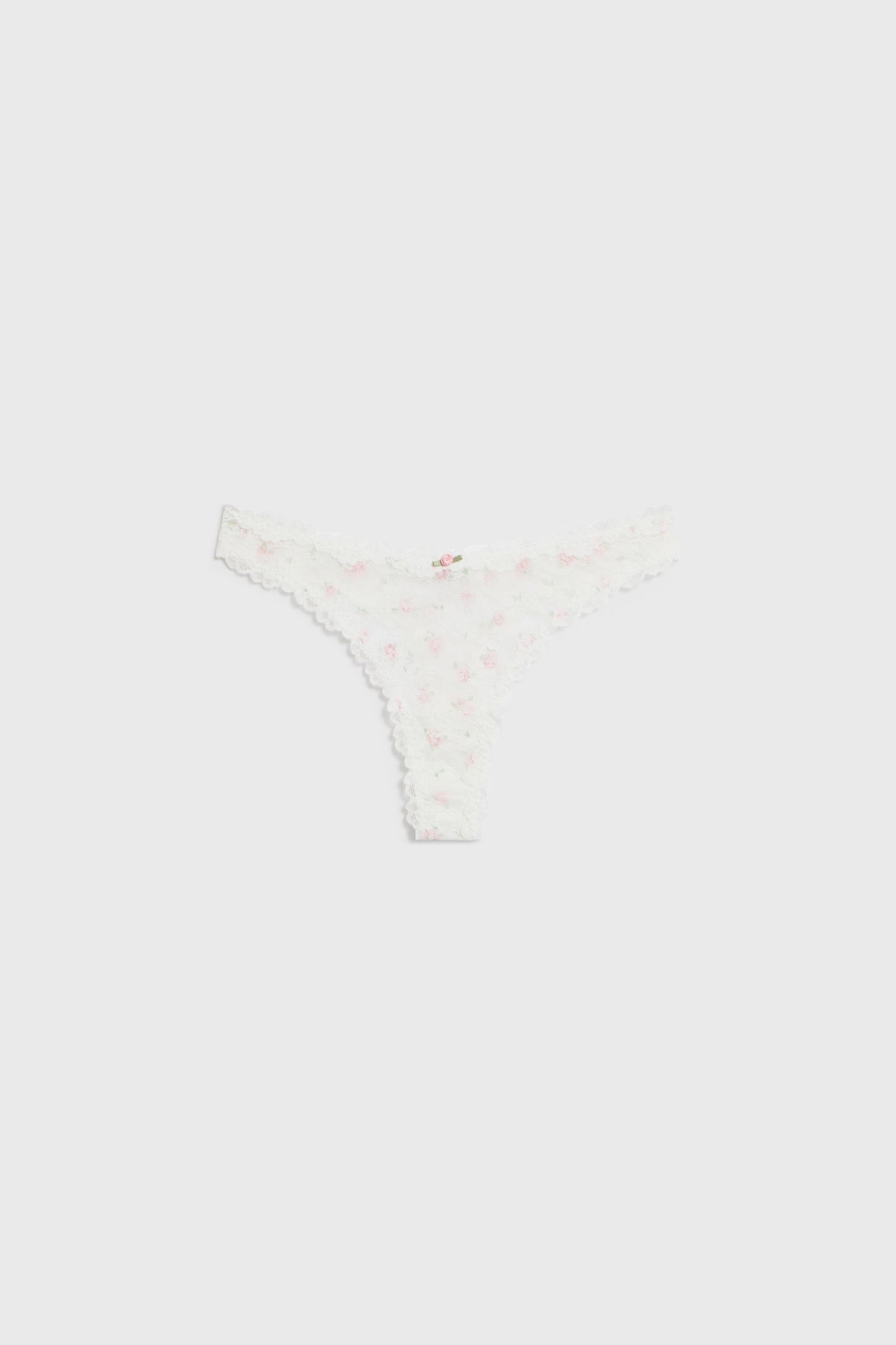 Thong briefs in lace with a small rose and bow at front. The garment has soft hygiene gusset.