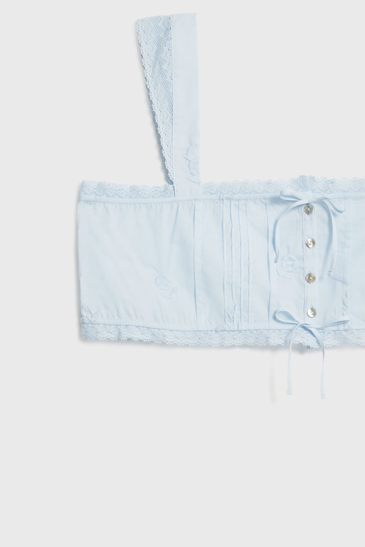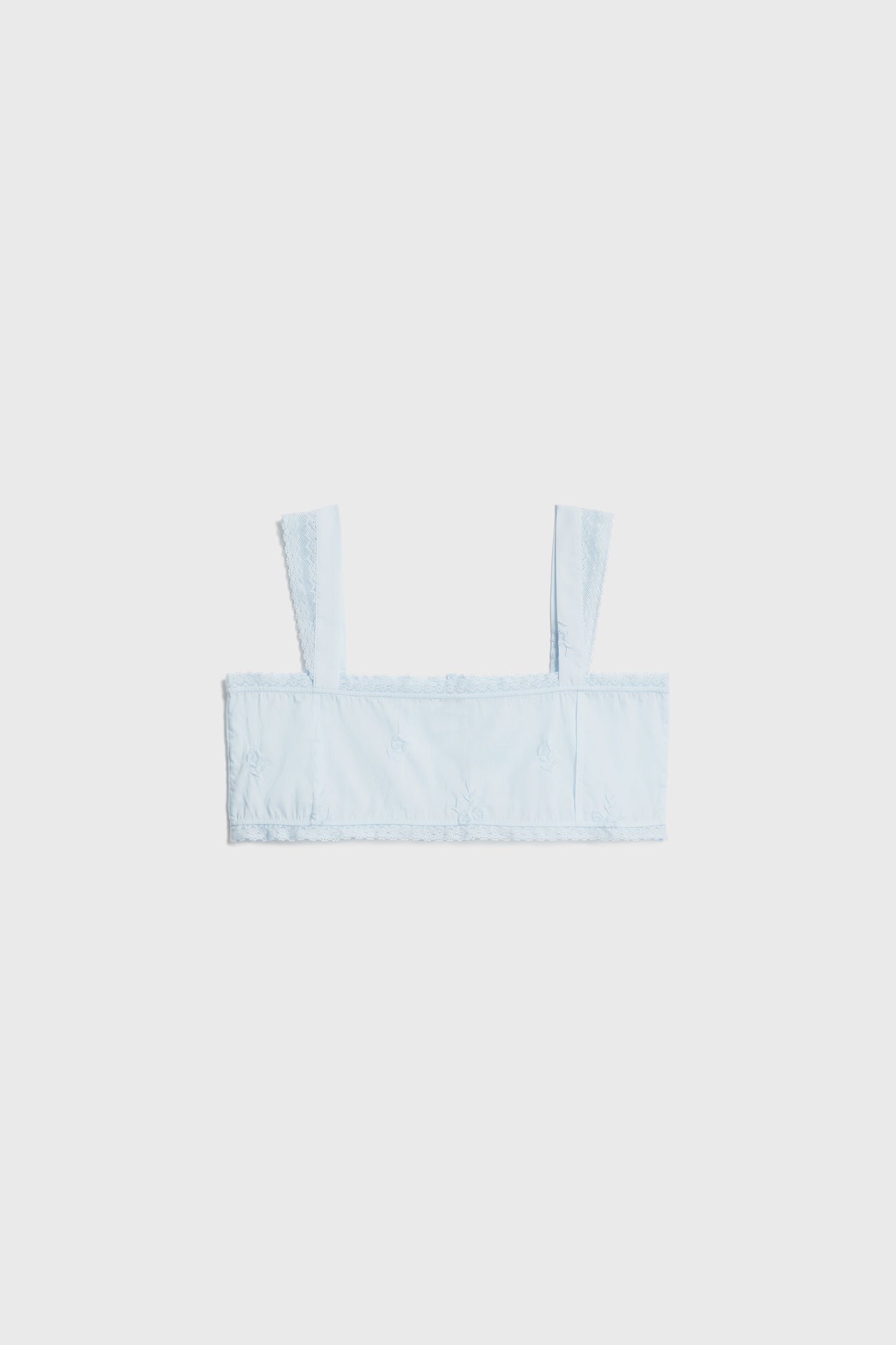 Fitted crop top in soft cotton weave. Embroidered floral motif and delicate lace trims. Wide shoulder straps, square neckline, and pearly buttons. Smocked edges with ties.