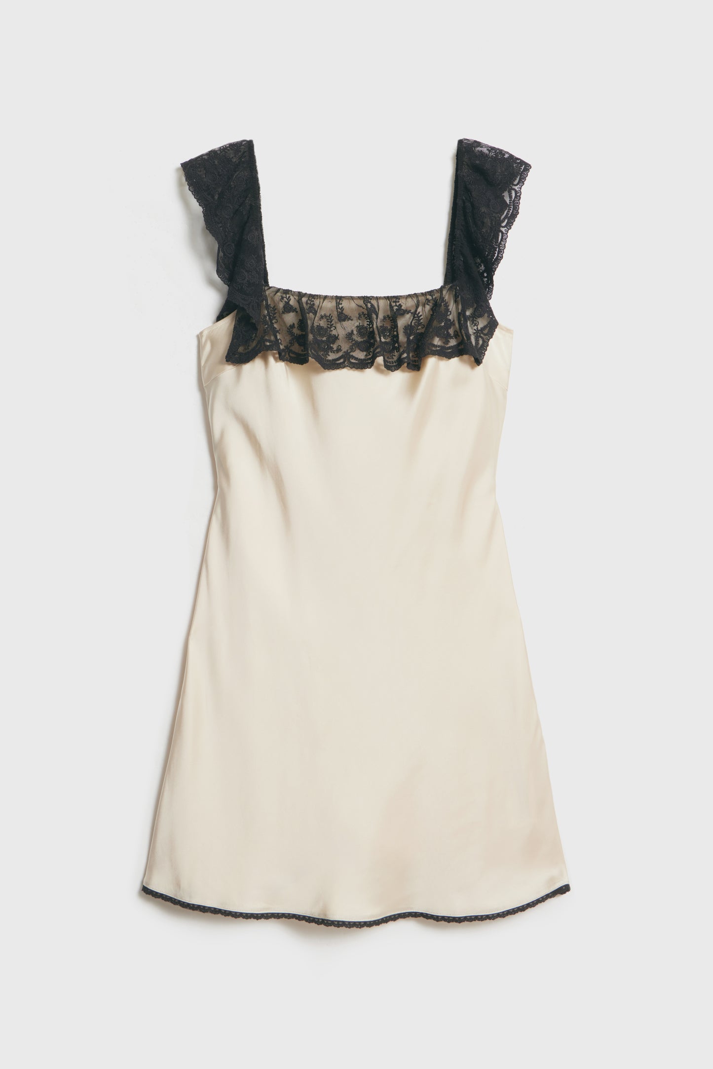 Mini dress in soft satin made of viscose. Elastic shoulder straps, square neckline, and decorative flounces in contrast lace.