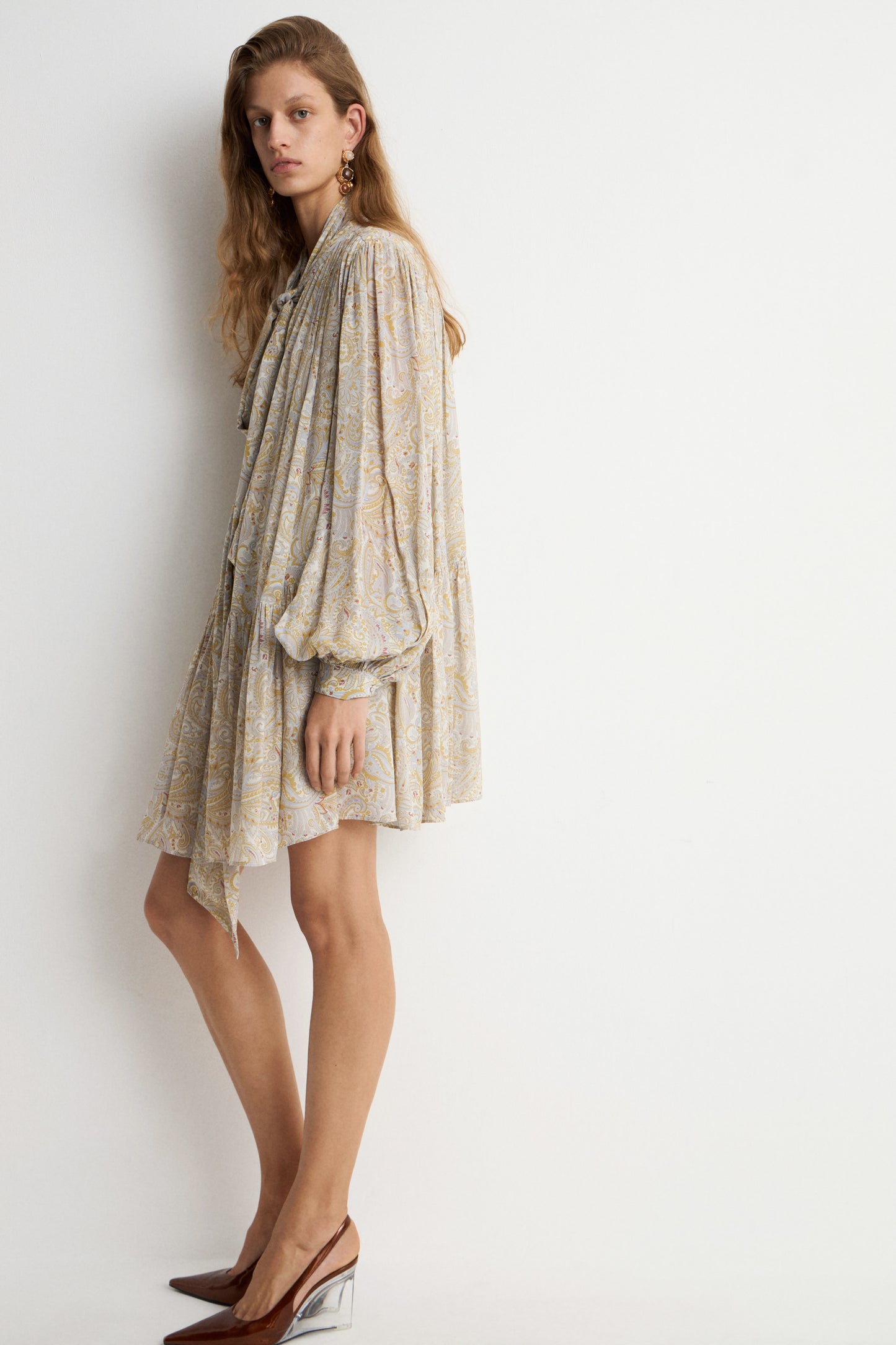Draped mini dress with a lavallière-neck bow detail and long sleeves. Designed with covered buttoned front. Lined.