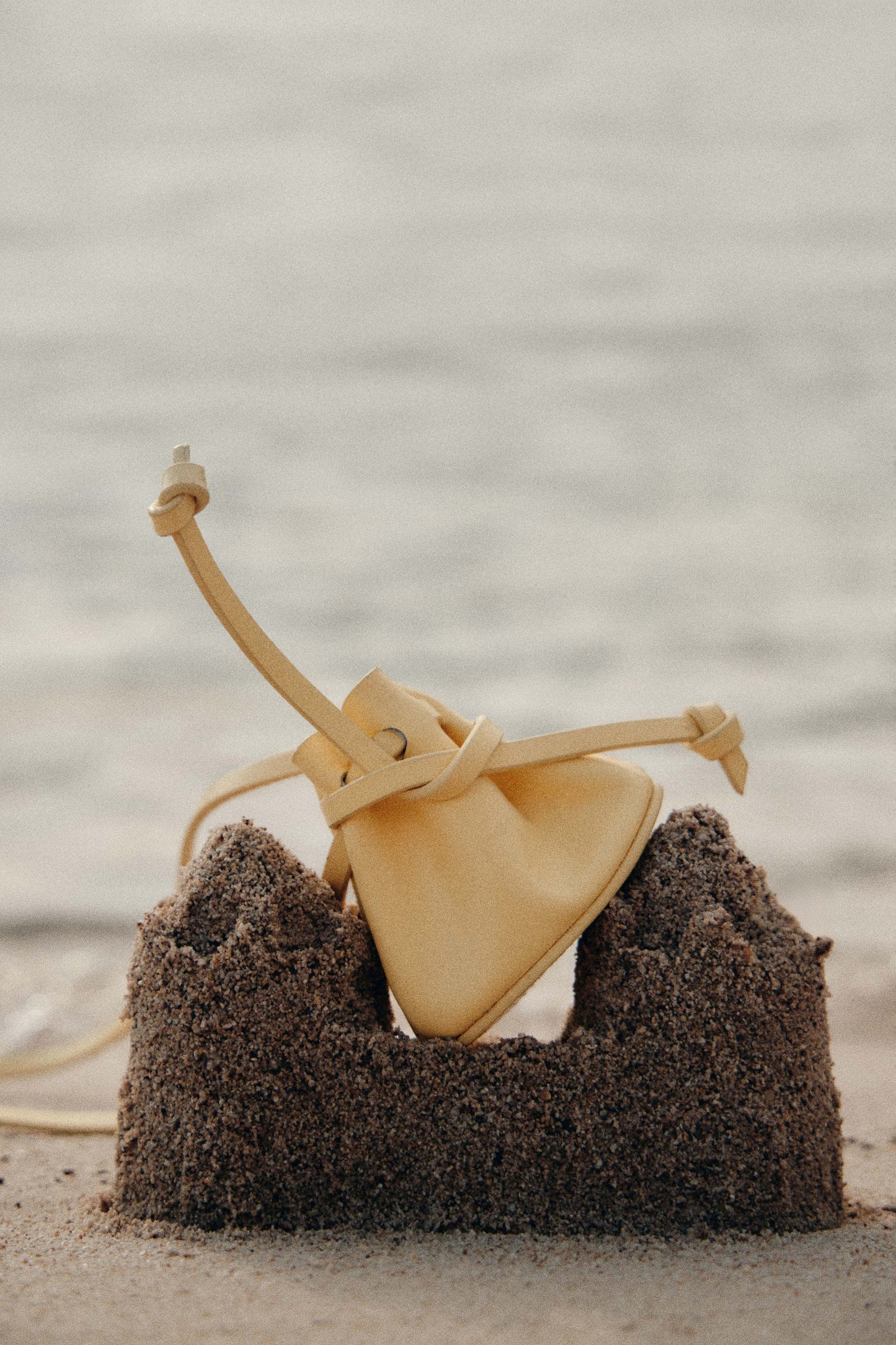 Small bag made from leather. Detailed with a long shoulder crossbody strap. Drawstring closure. Size: 8,5 х 4,3 х 8 cm (length х width х height).