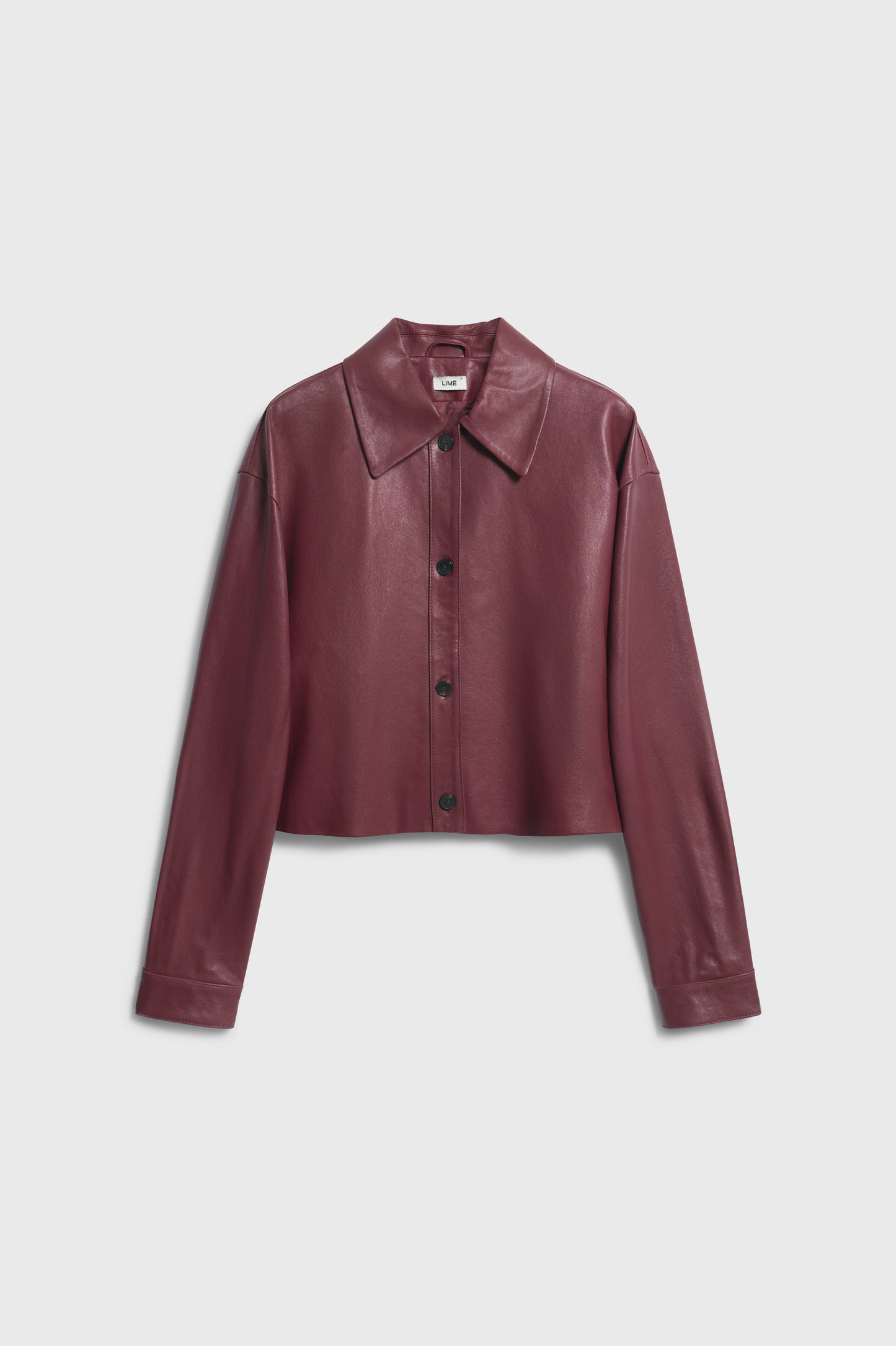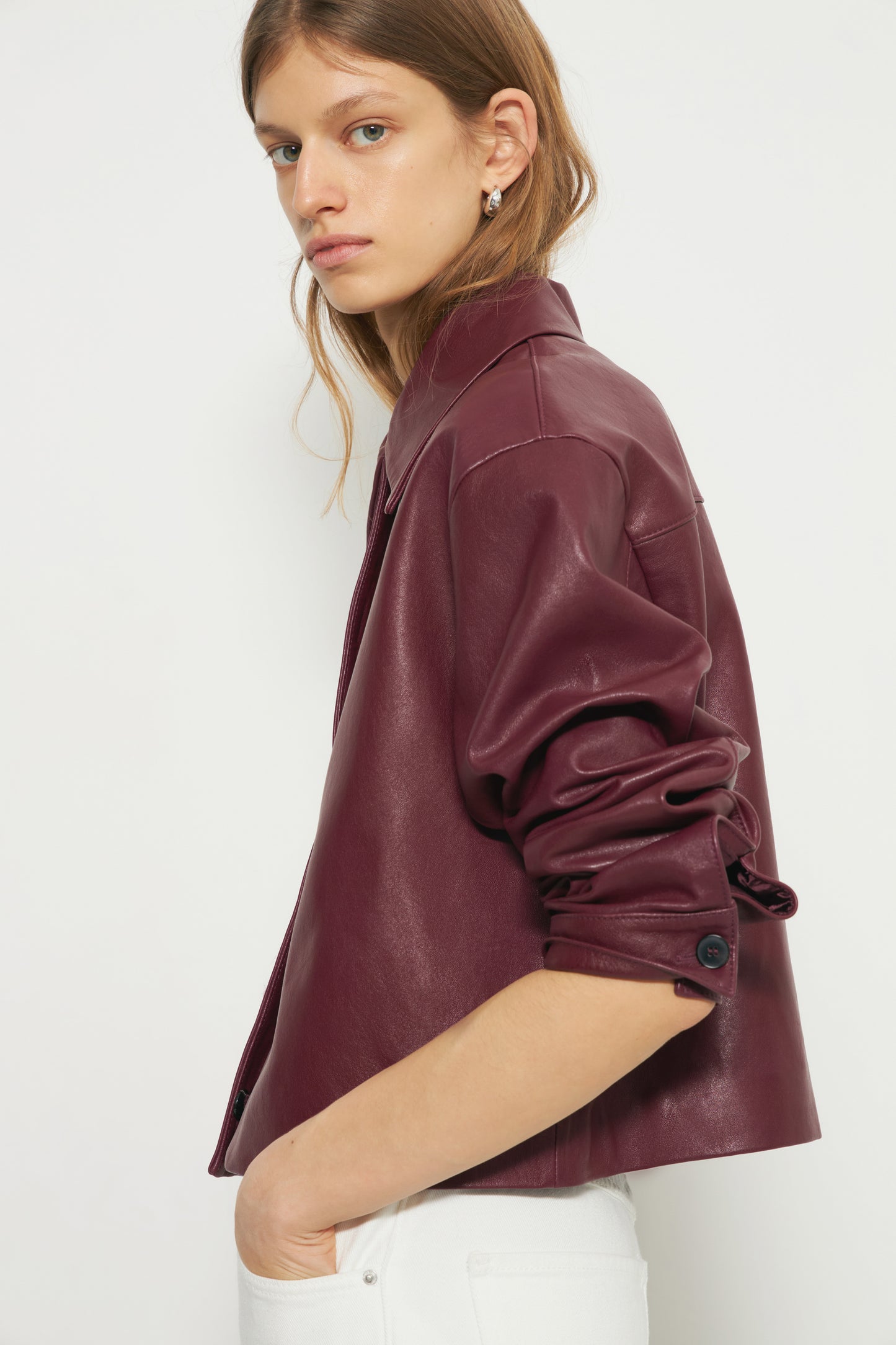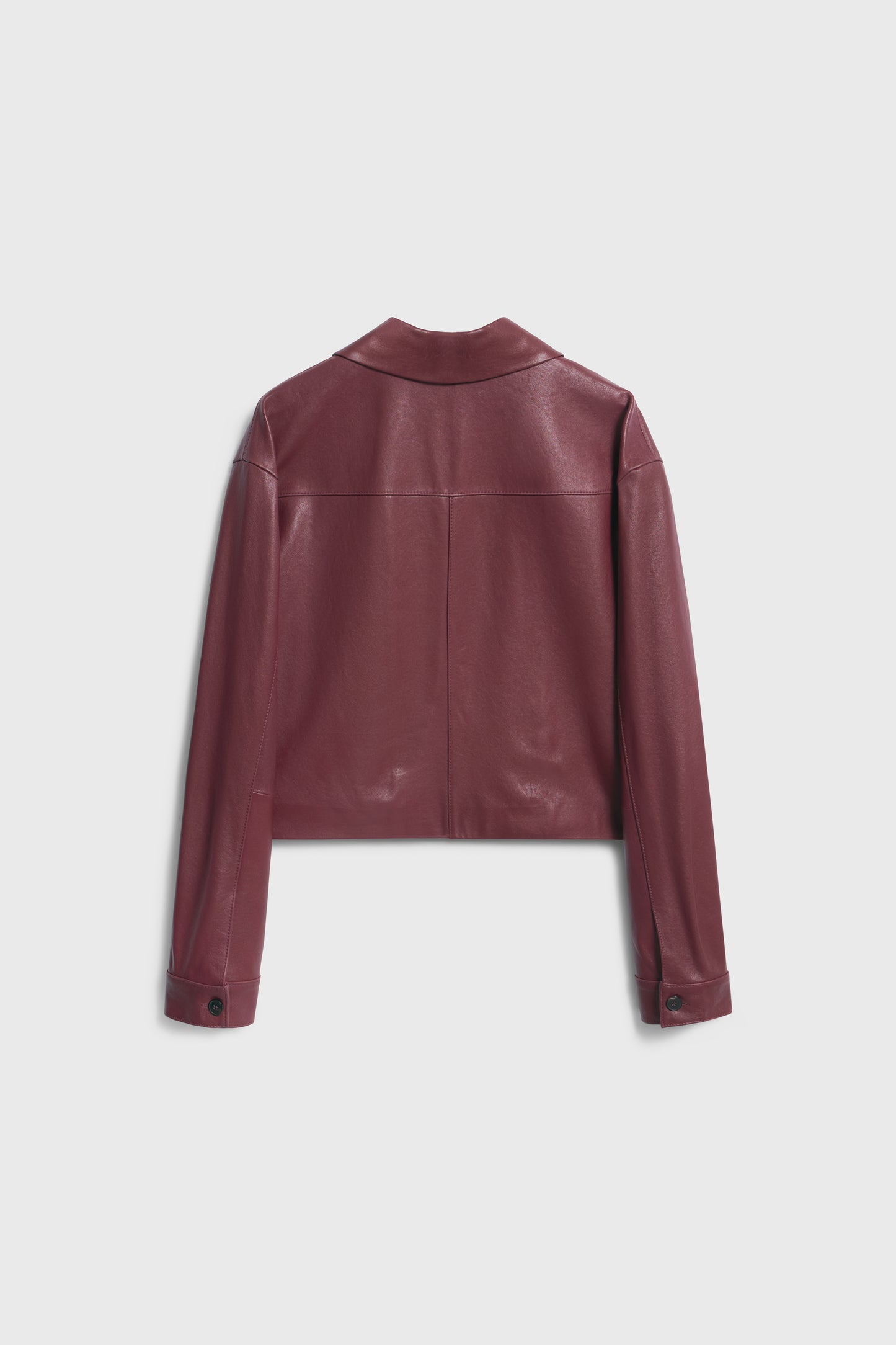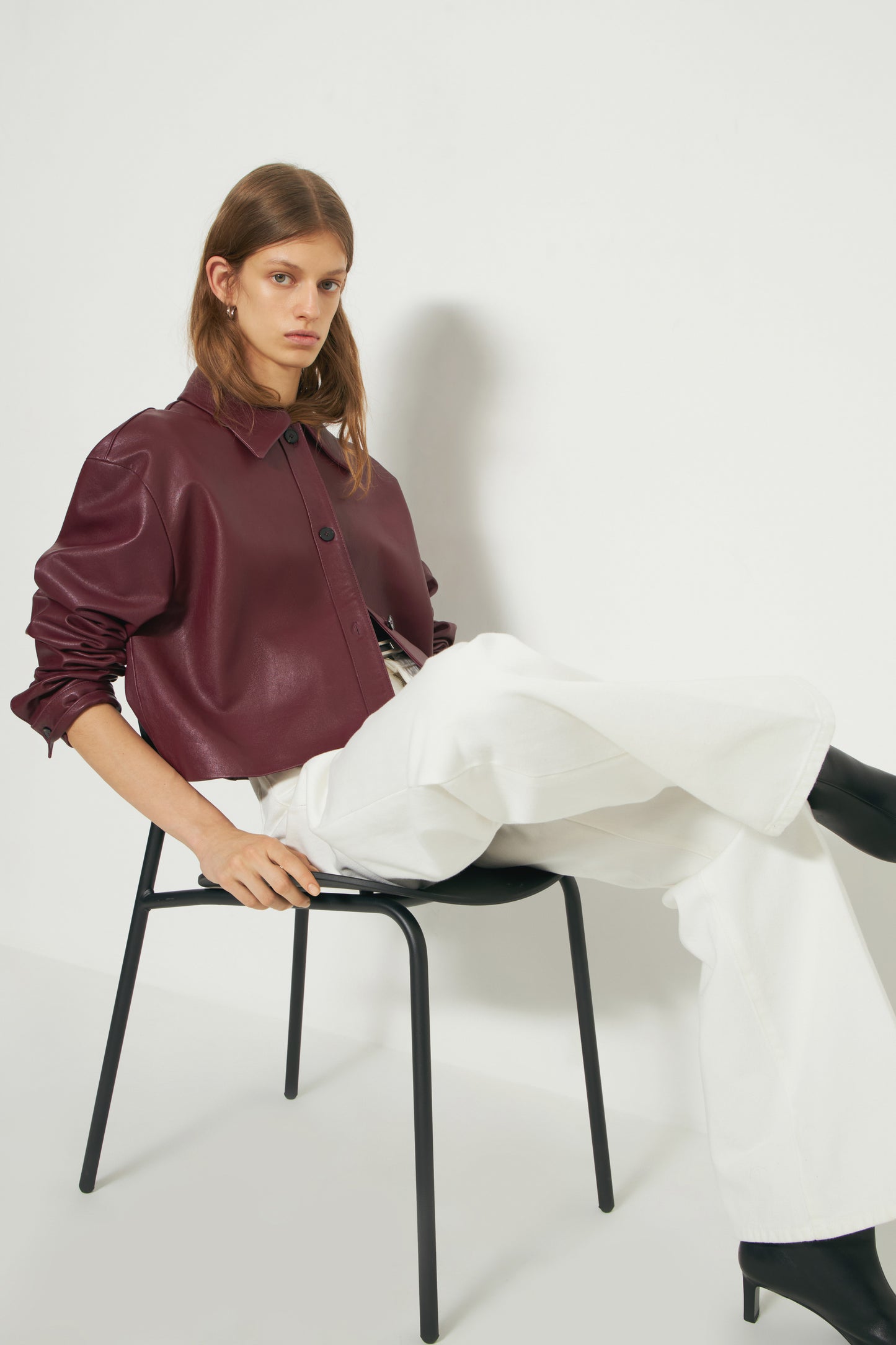 Collared oversize shirt in leather. Cuffed long sleeves. Cropped. Jersey viscose linings. Button-up front.