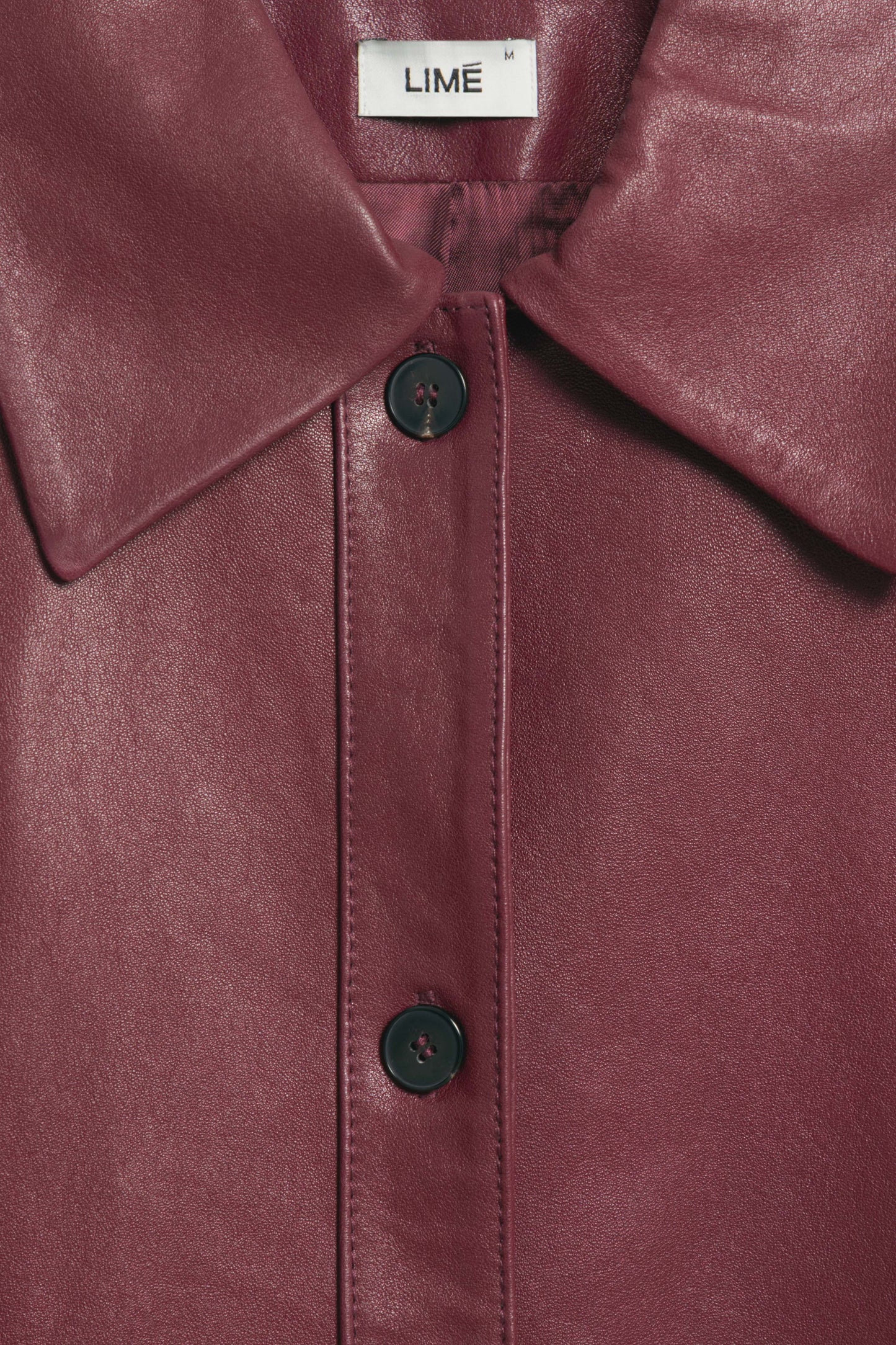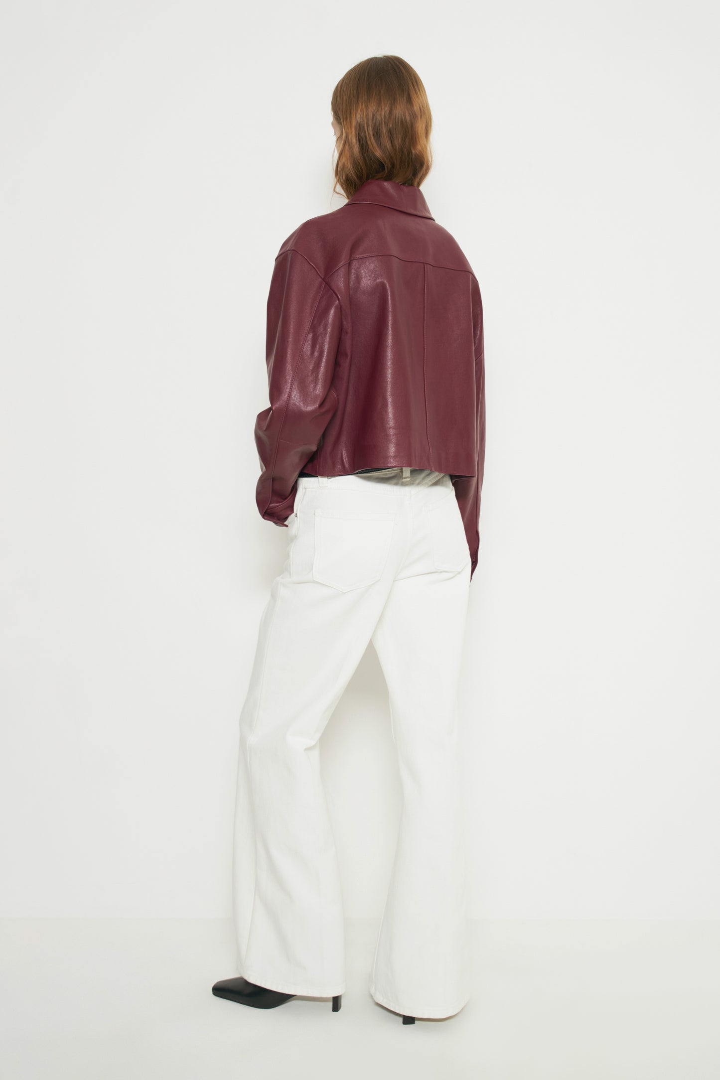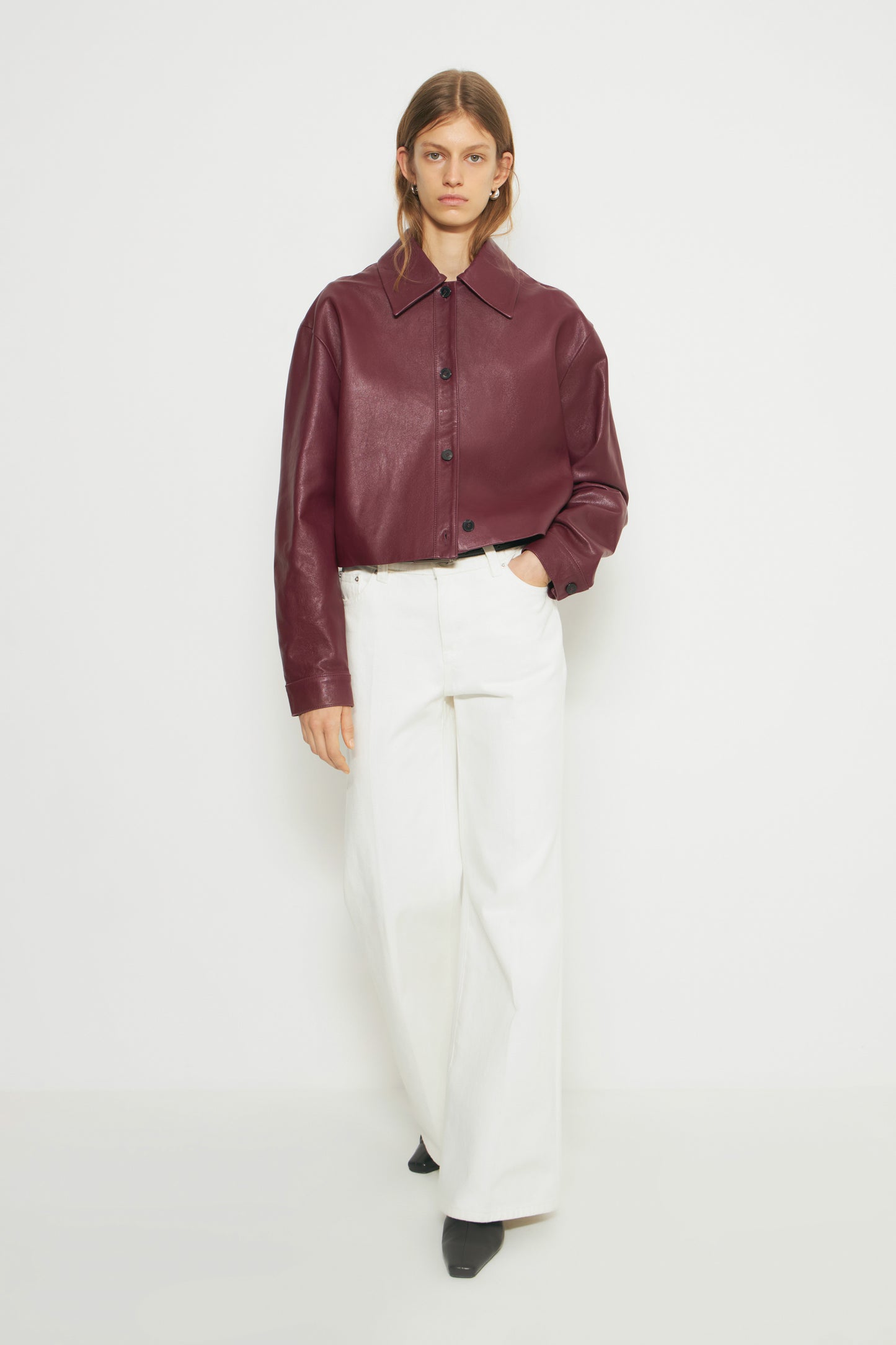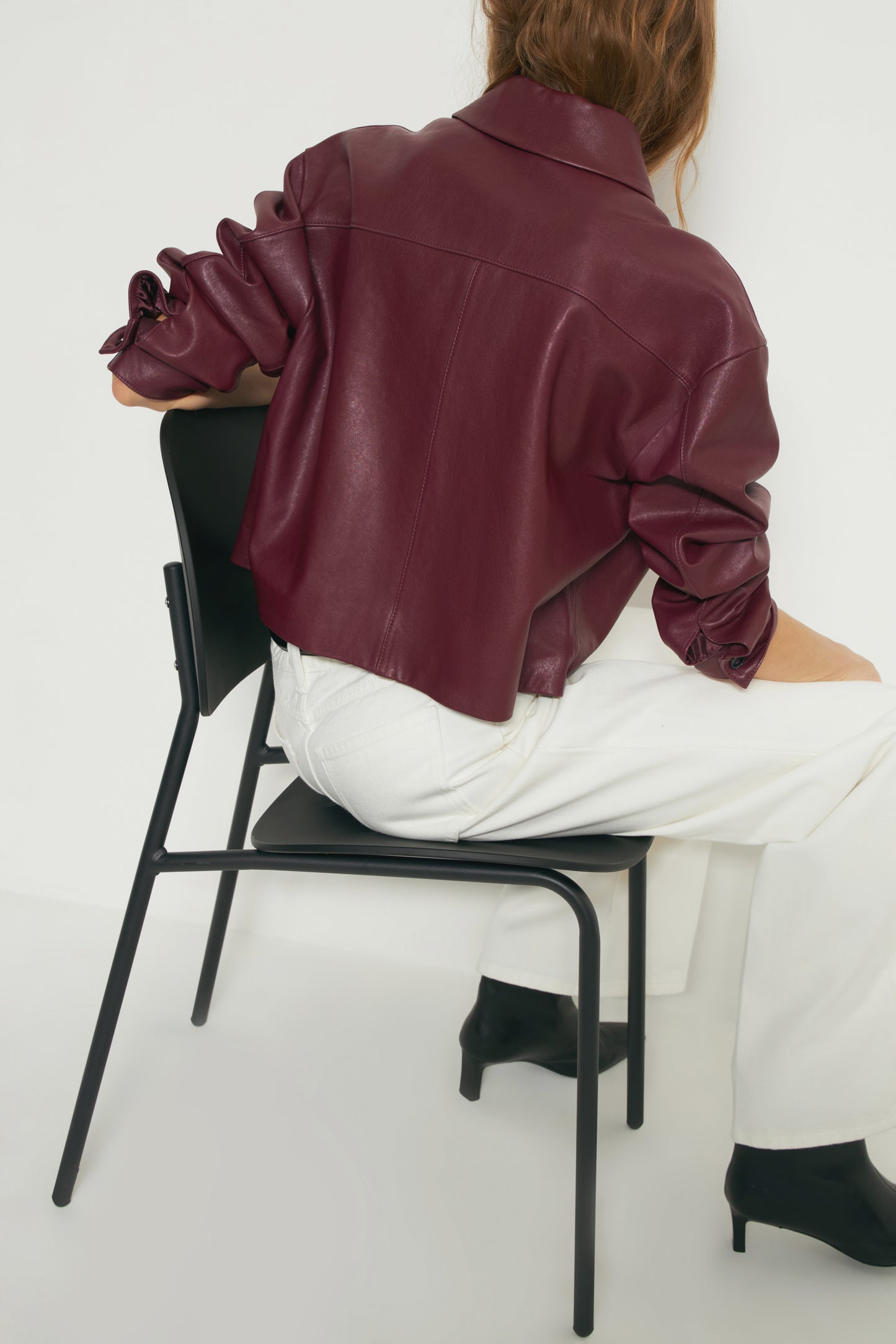 Collared oversize shirt in leather. Cuffed long sleeves. Cropped. Jersey viscose linings. Button-up front.