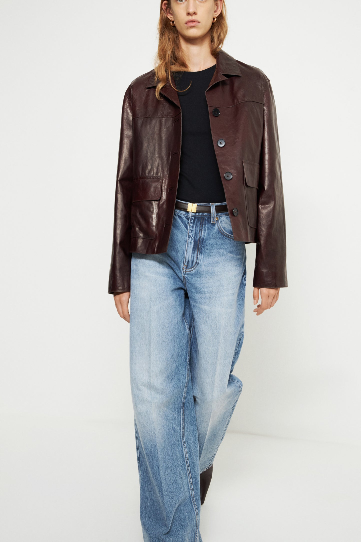 High-waist jeans with five pockets. Wide-leg design. Front zip fly and top button fastening. Embroidered logo made from a leather.