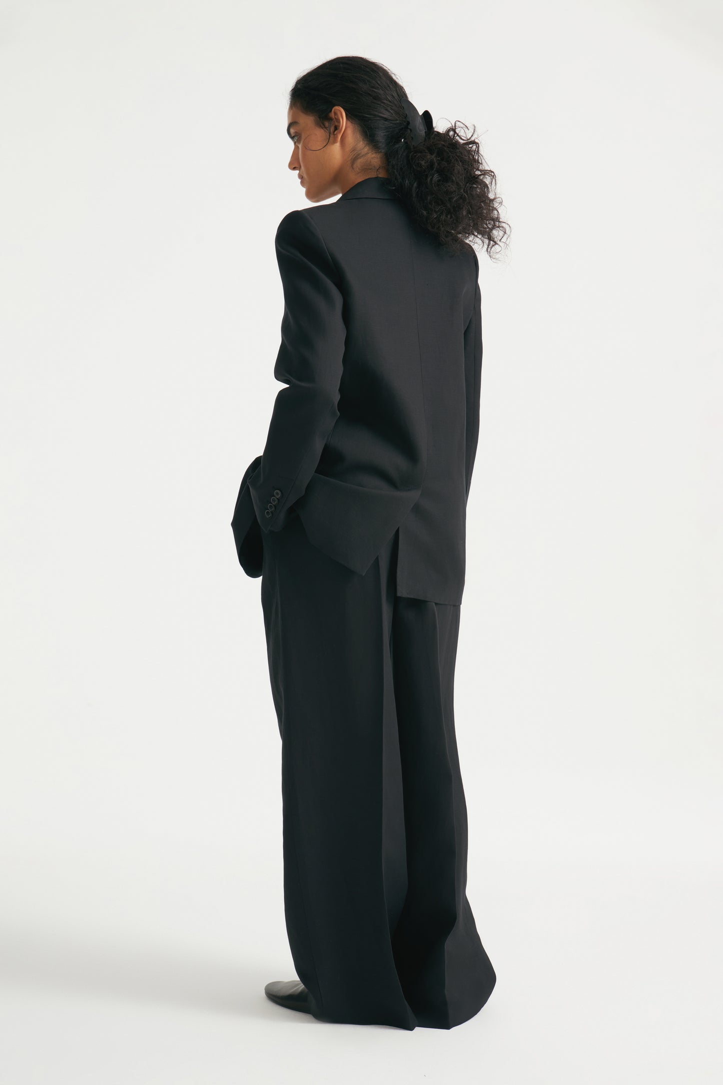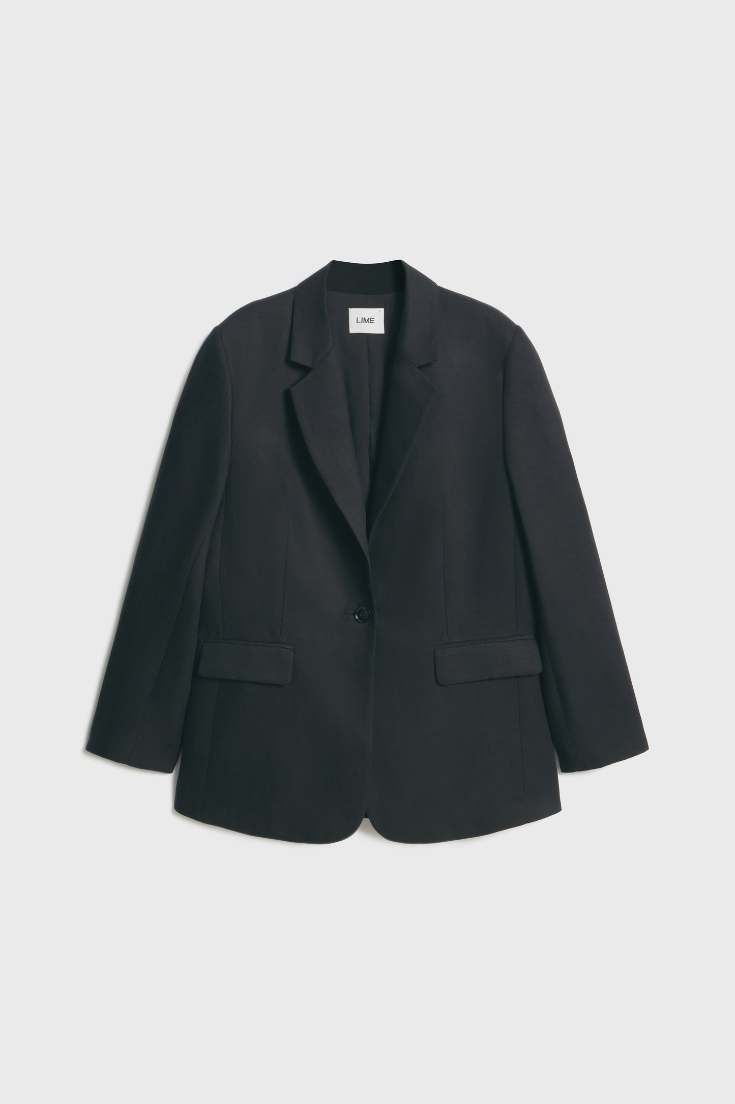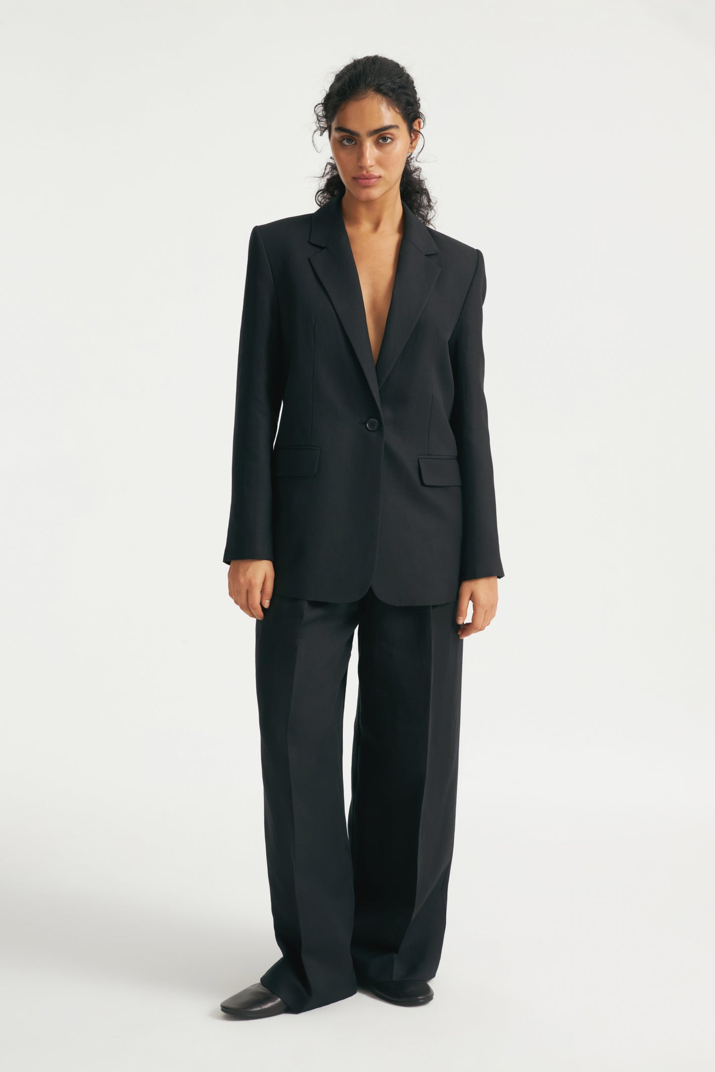 Straight blazer made of lyocell and linen blend. Featuring a lapel collar and long sleeves with shoulder pads. Front pockets with flaps. Matching lining. Single-breasted button fastening on the front.
