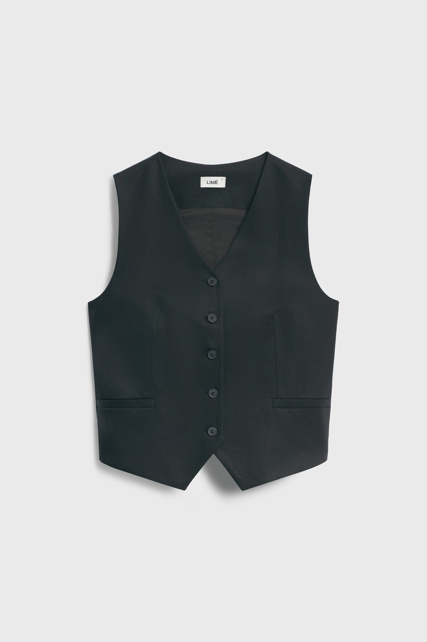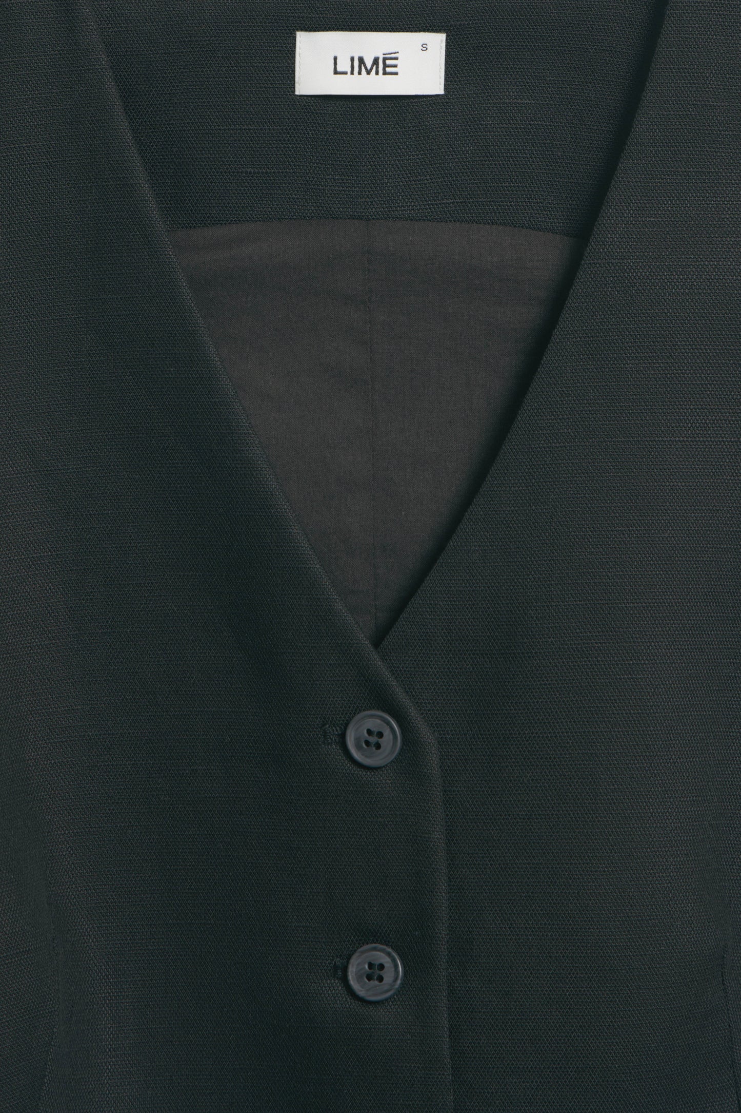 Single-breasted waistcoat with a V-shaped neckline and buttons down the front made from a lyocell and linen blend. Fake welt pockets at the front. Pointed hems. Cotton lining. Straight fit.