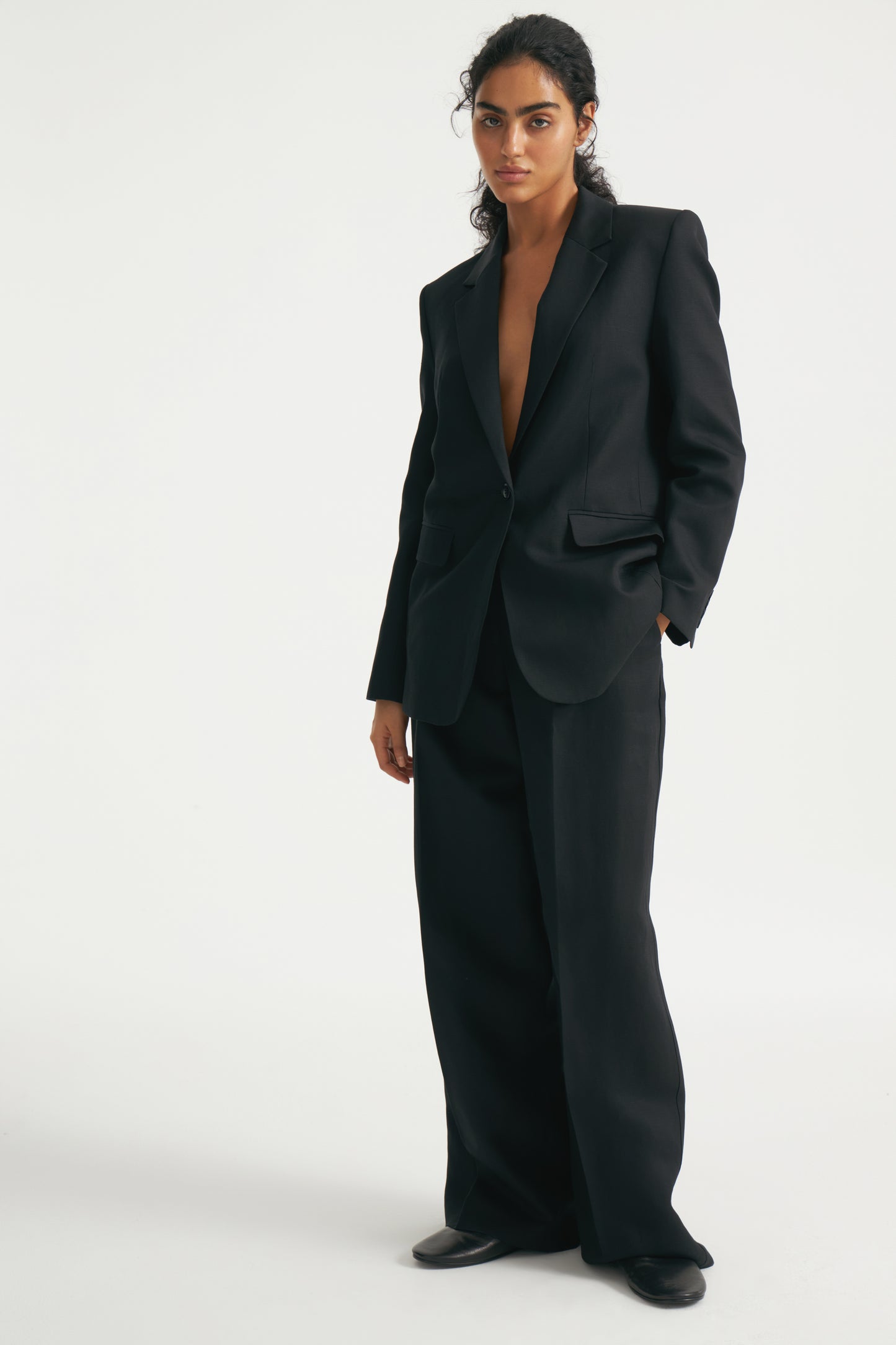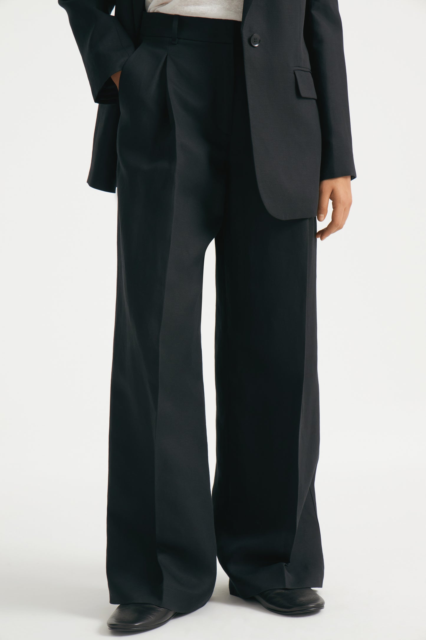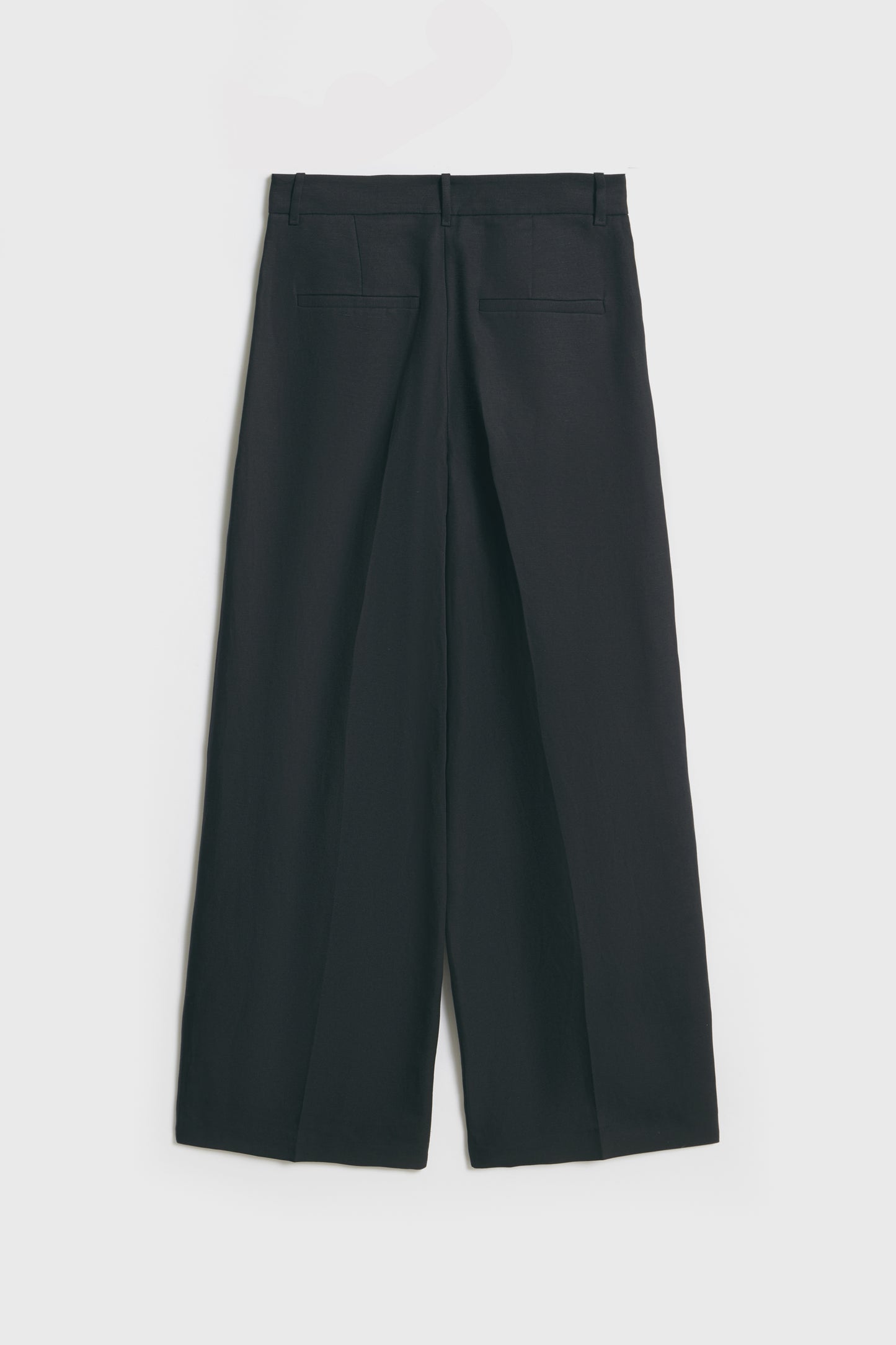 Trousers in lyocell and linen blend with darts. Straight-leg design. Featuring front pockets and fake welt pockets. Front zip fly, button and metal hook fastening.
