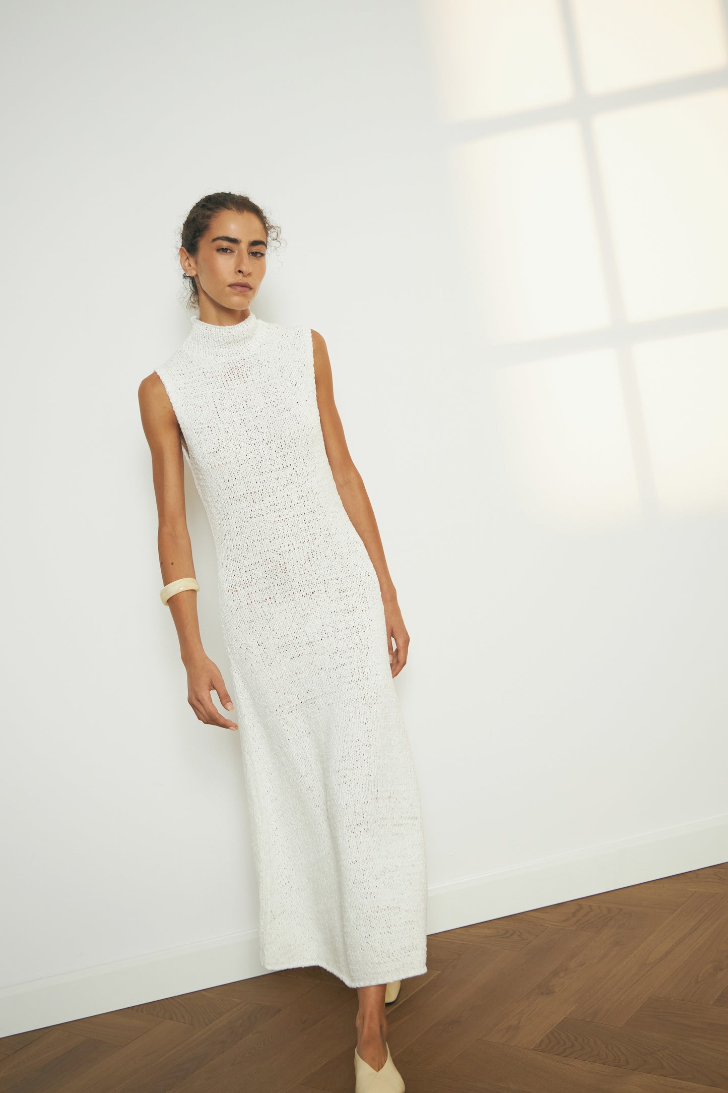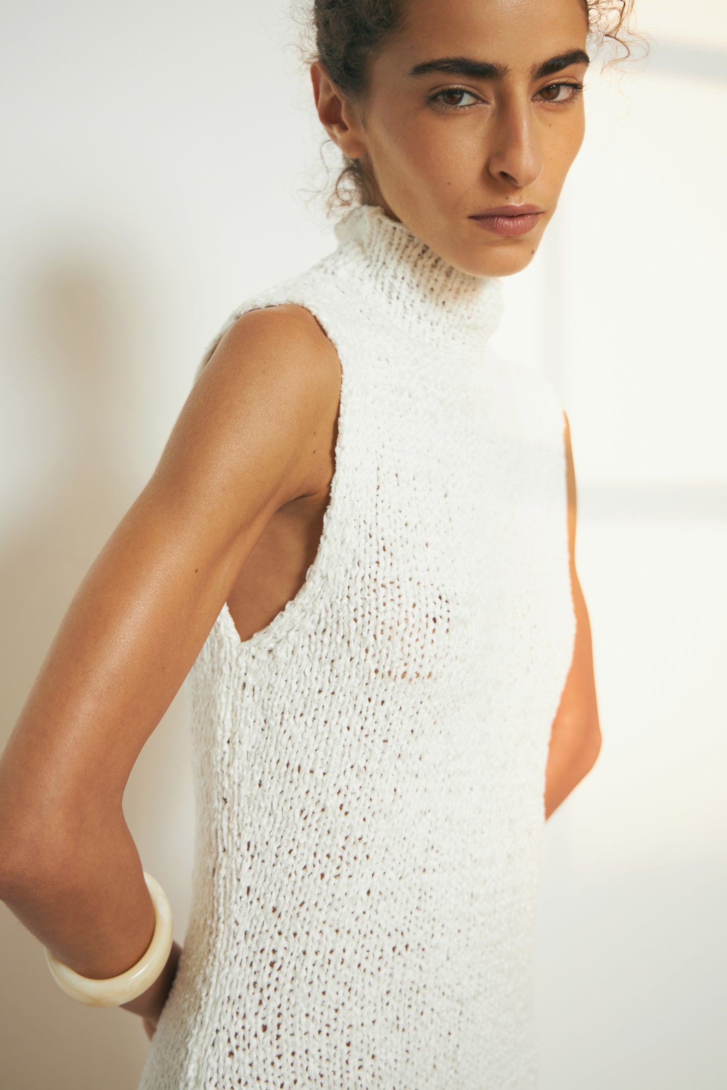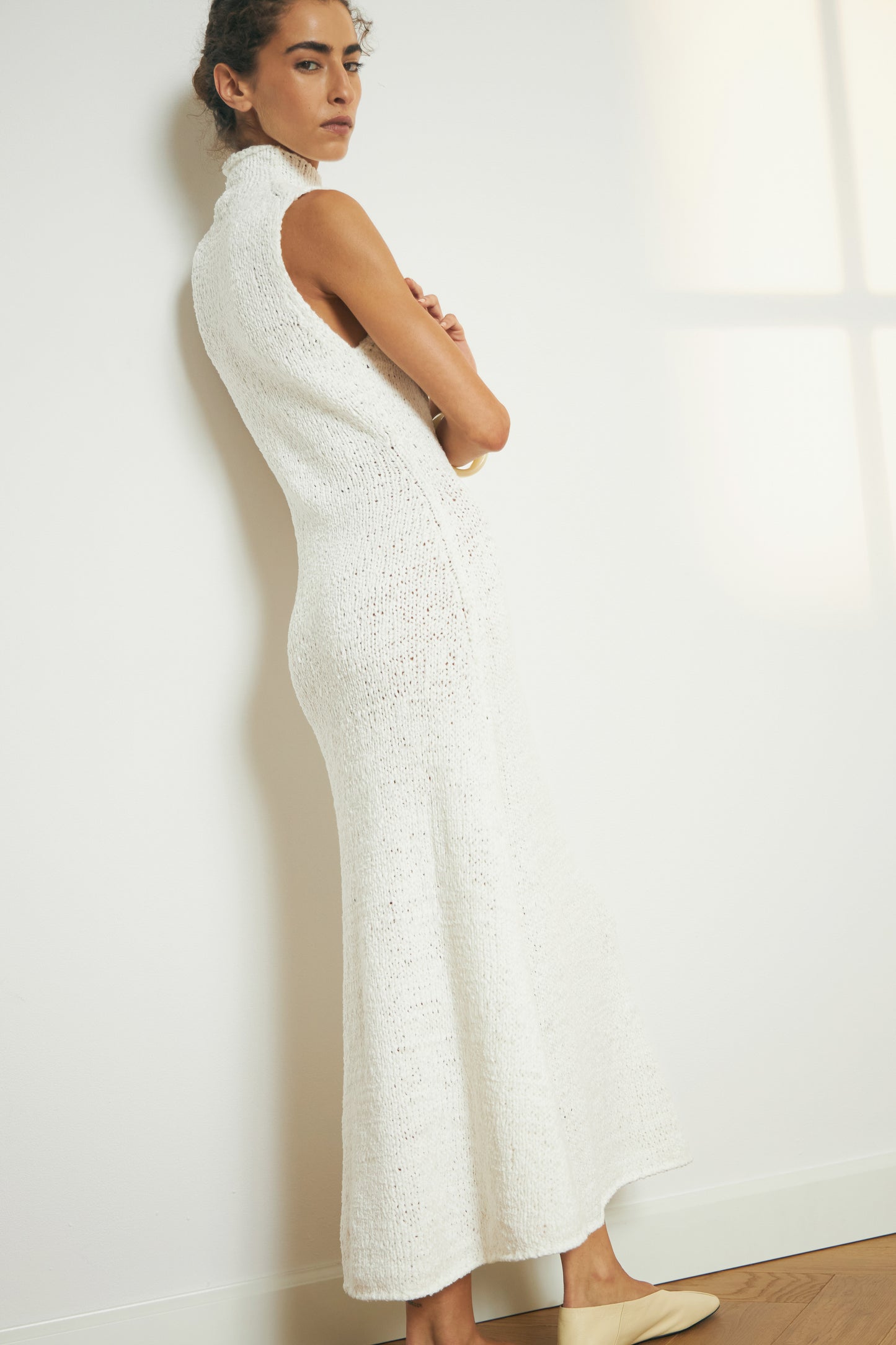 Long A-line dress in a soft, hole knit cotton blend. Sleeveless design with a stand-up collar.