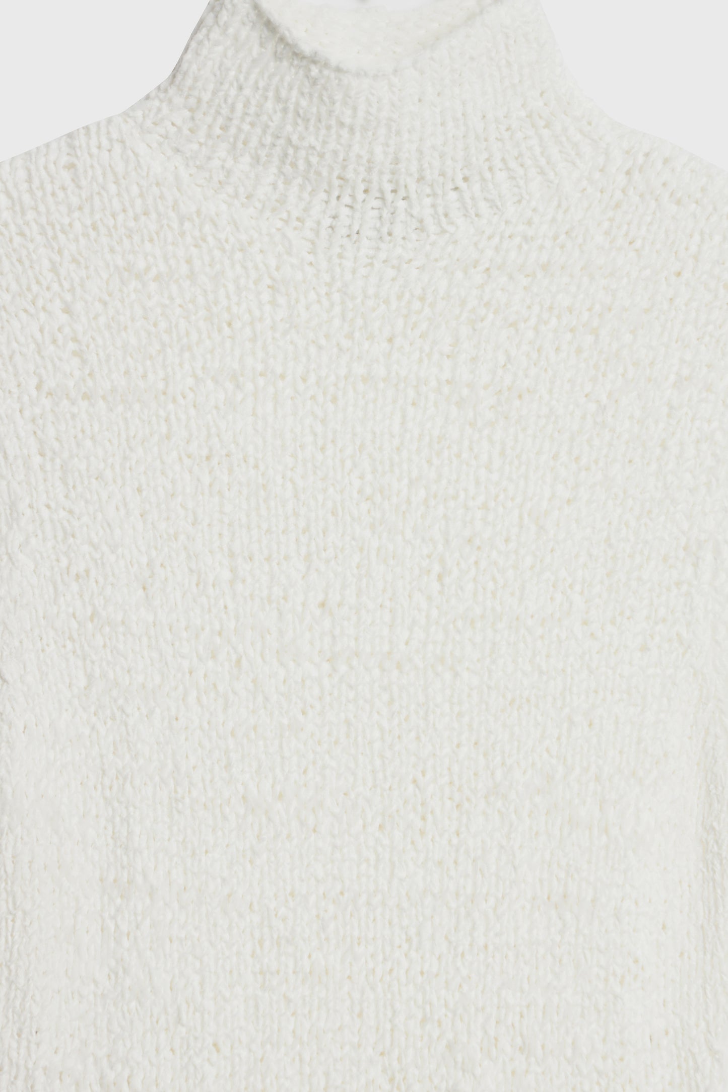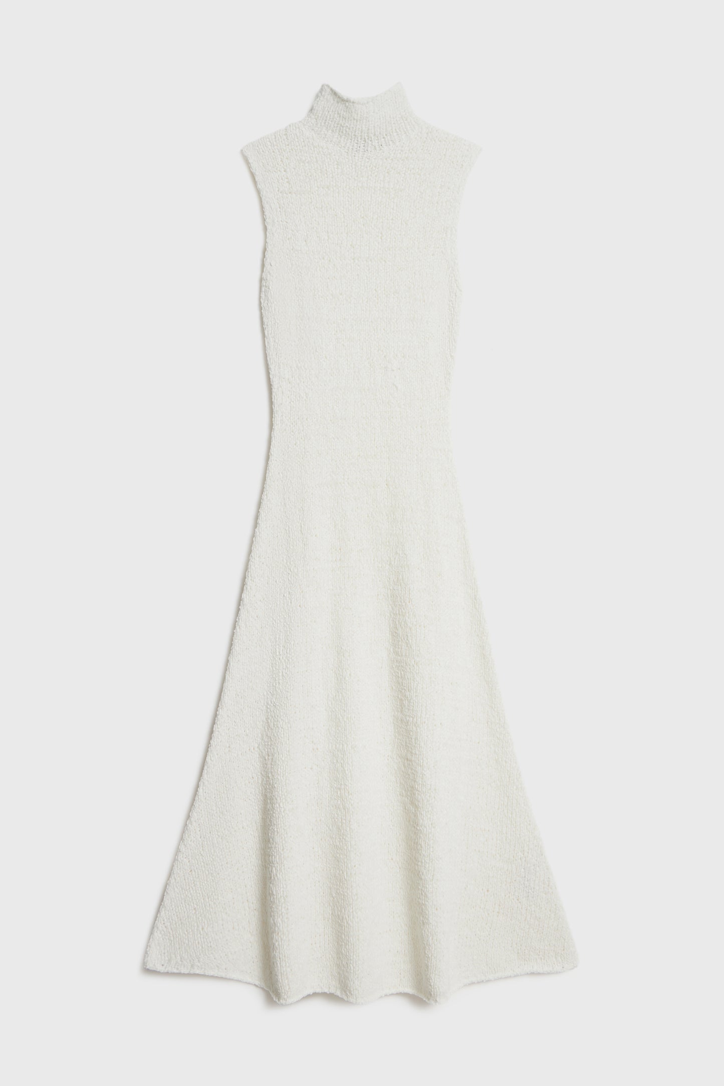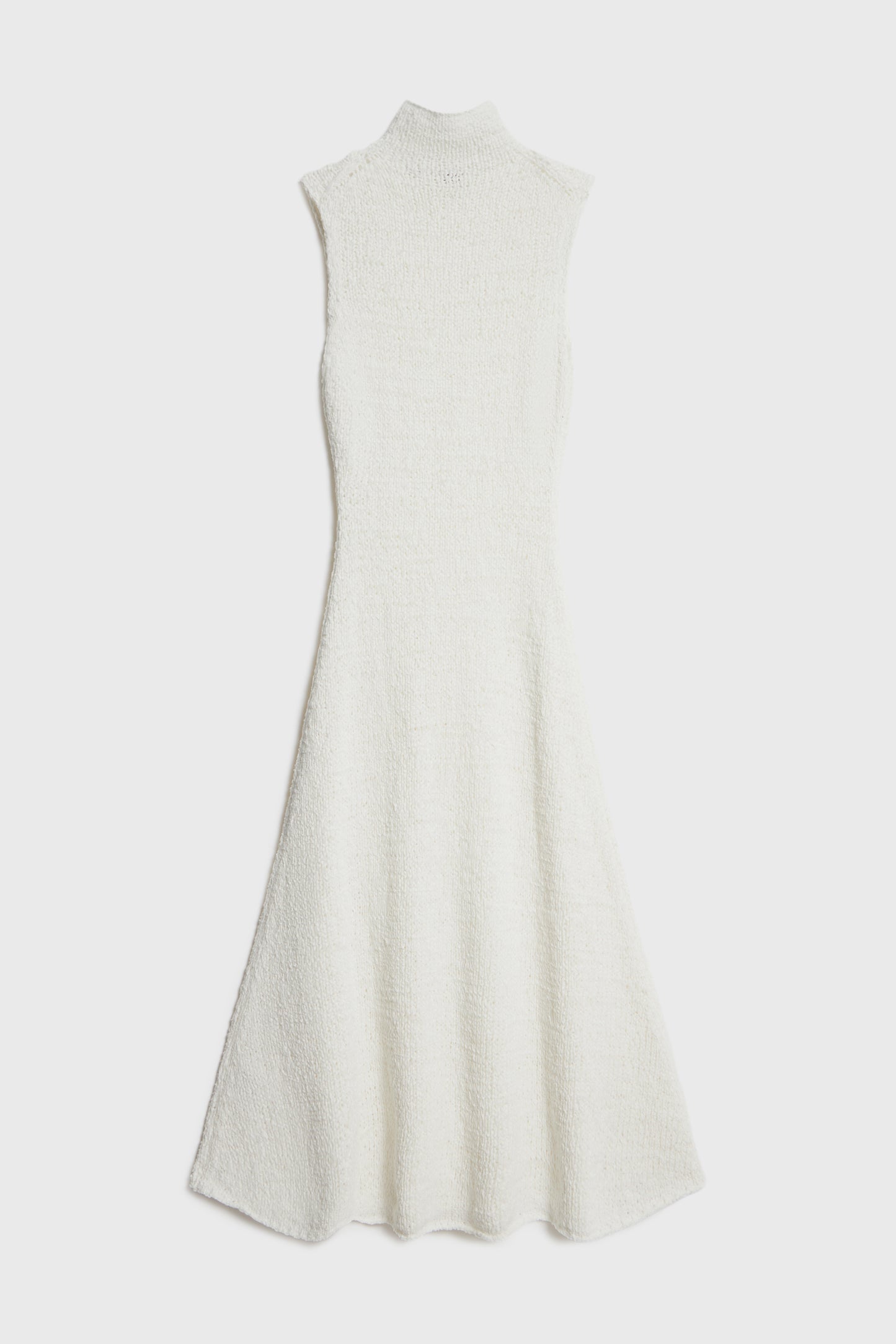 Long A-line dress in a soft, hole knit cotton blend. Sleeveless design with a stand-up collar.