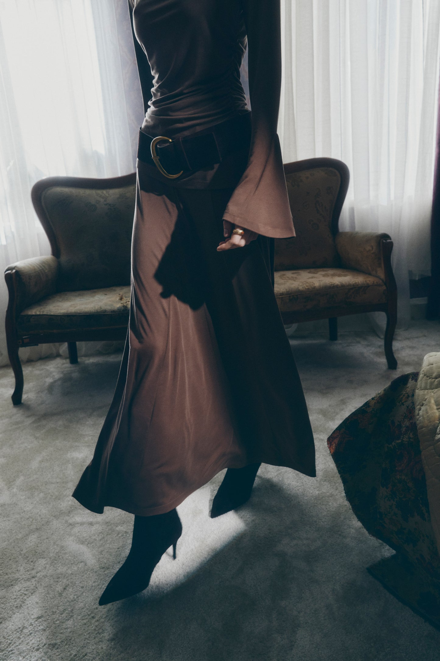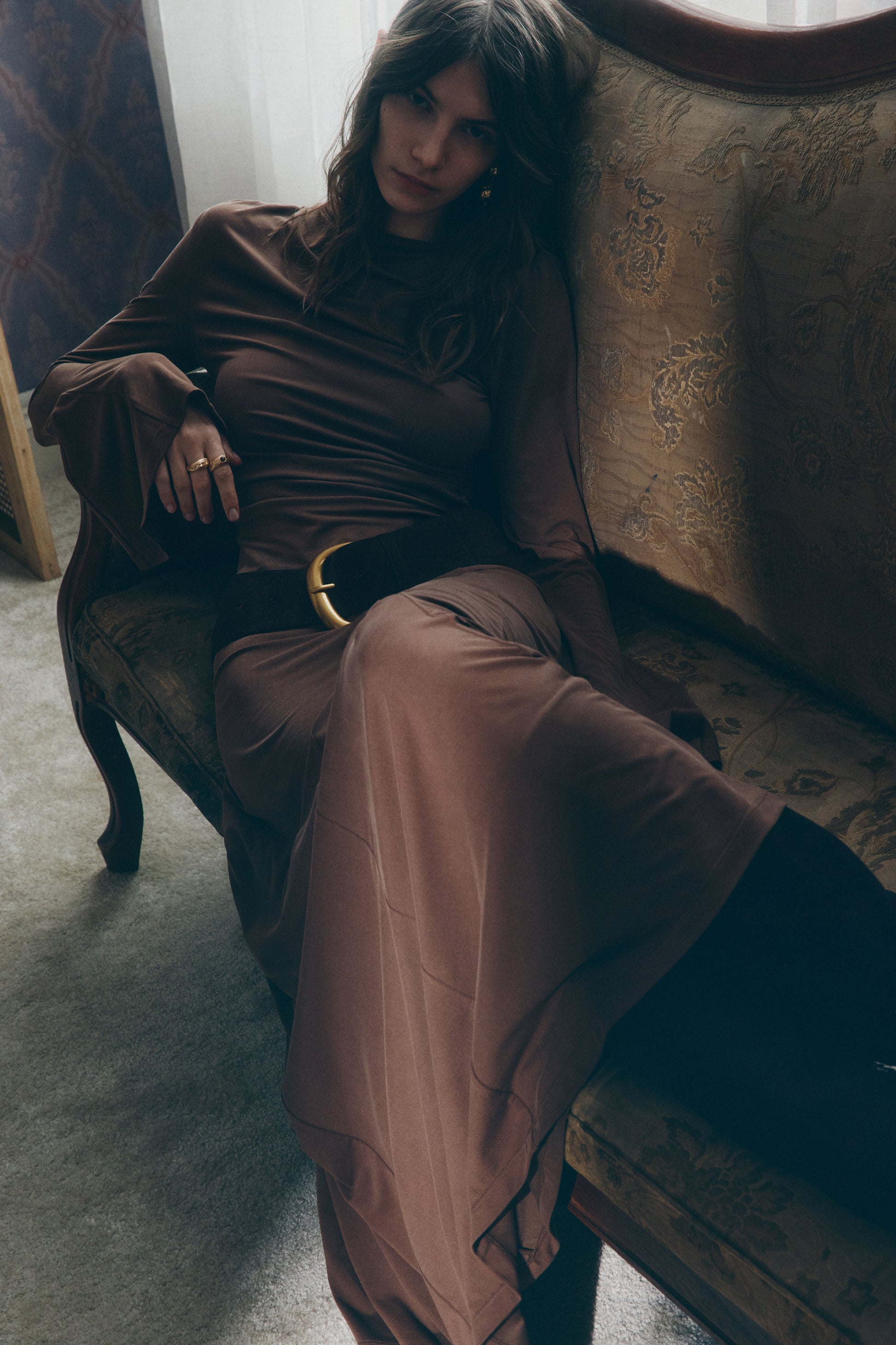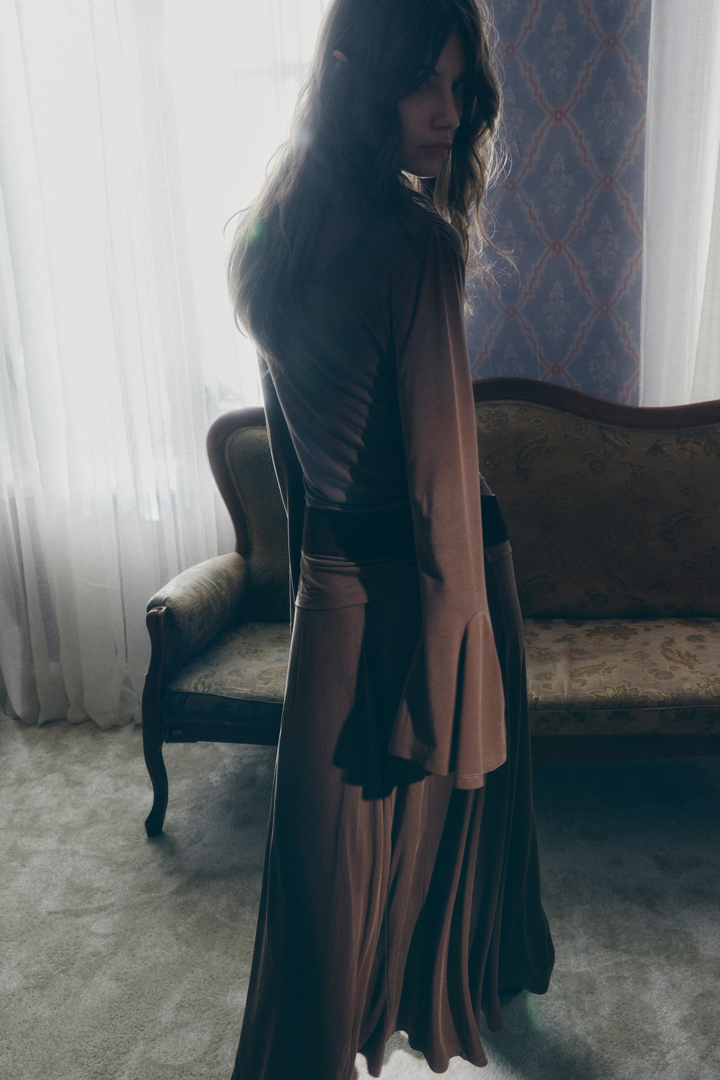 Long skirt made of viscose blend jersey. Flared hem with pleats. Elastic waistband.
