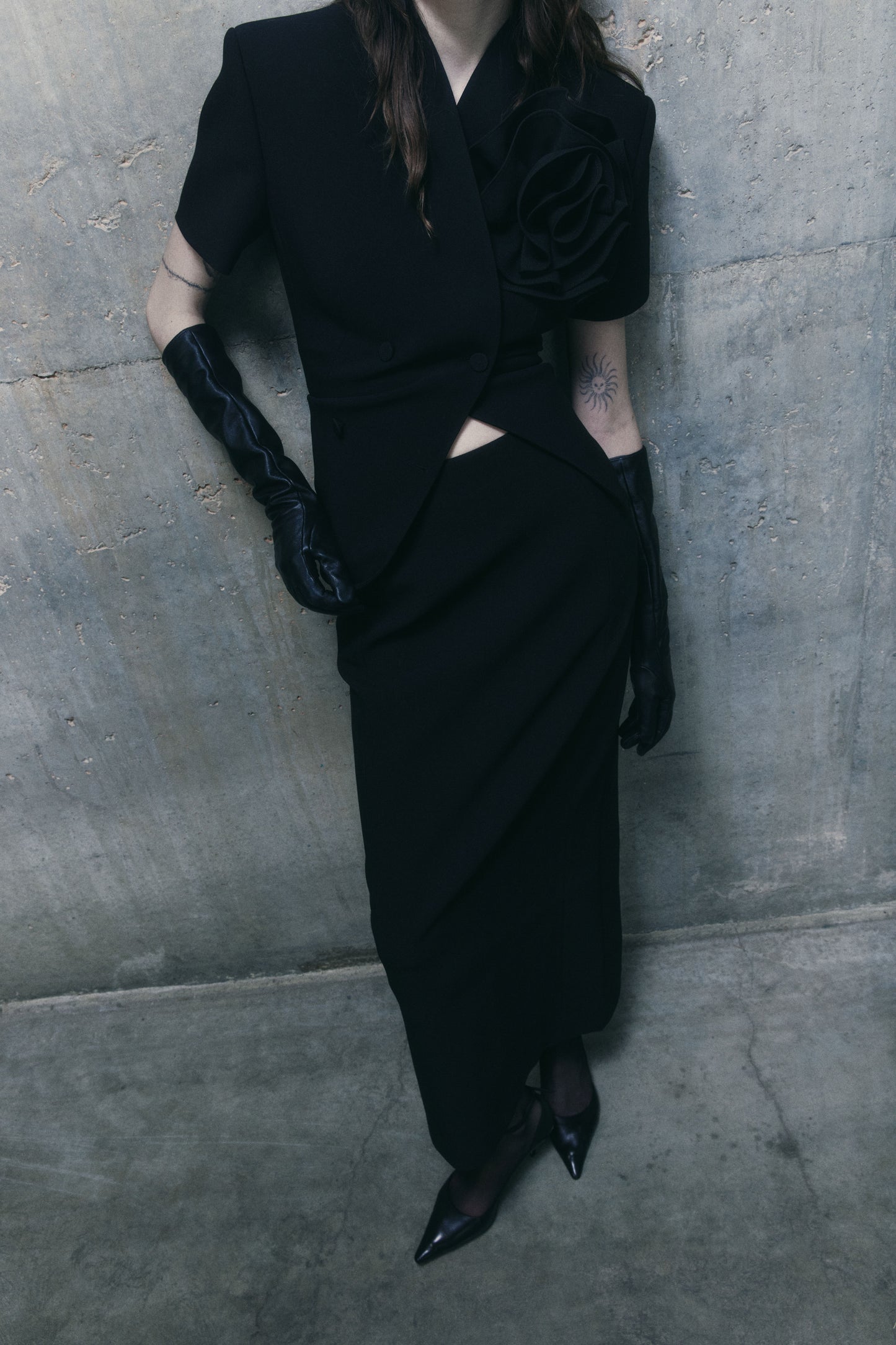 Long, fitted skirt in viscose blend. Matching lining, invisible zip closure and a straight-cut hem with a slit at back.