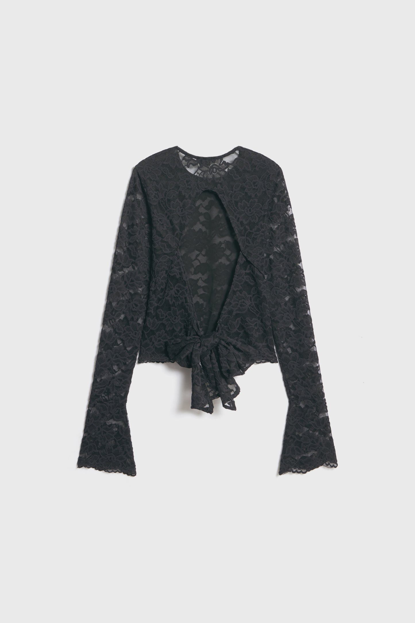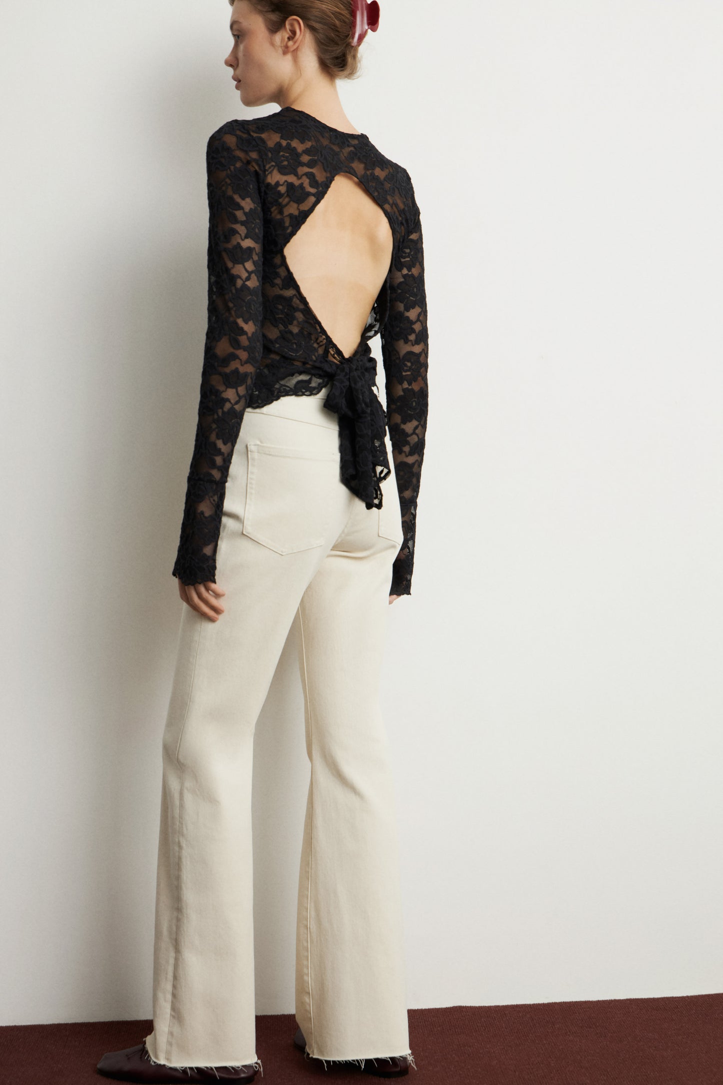 Long-sleeved T-shirt in a floral-motif lace. Drop-shaped opening at back with ties. Wide cuffs.