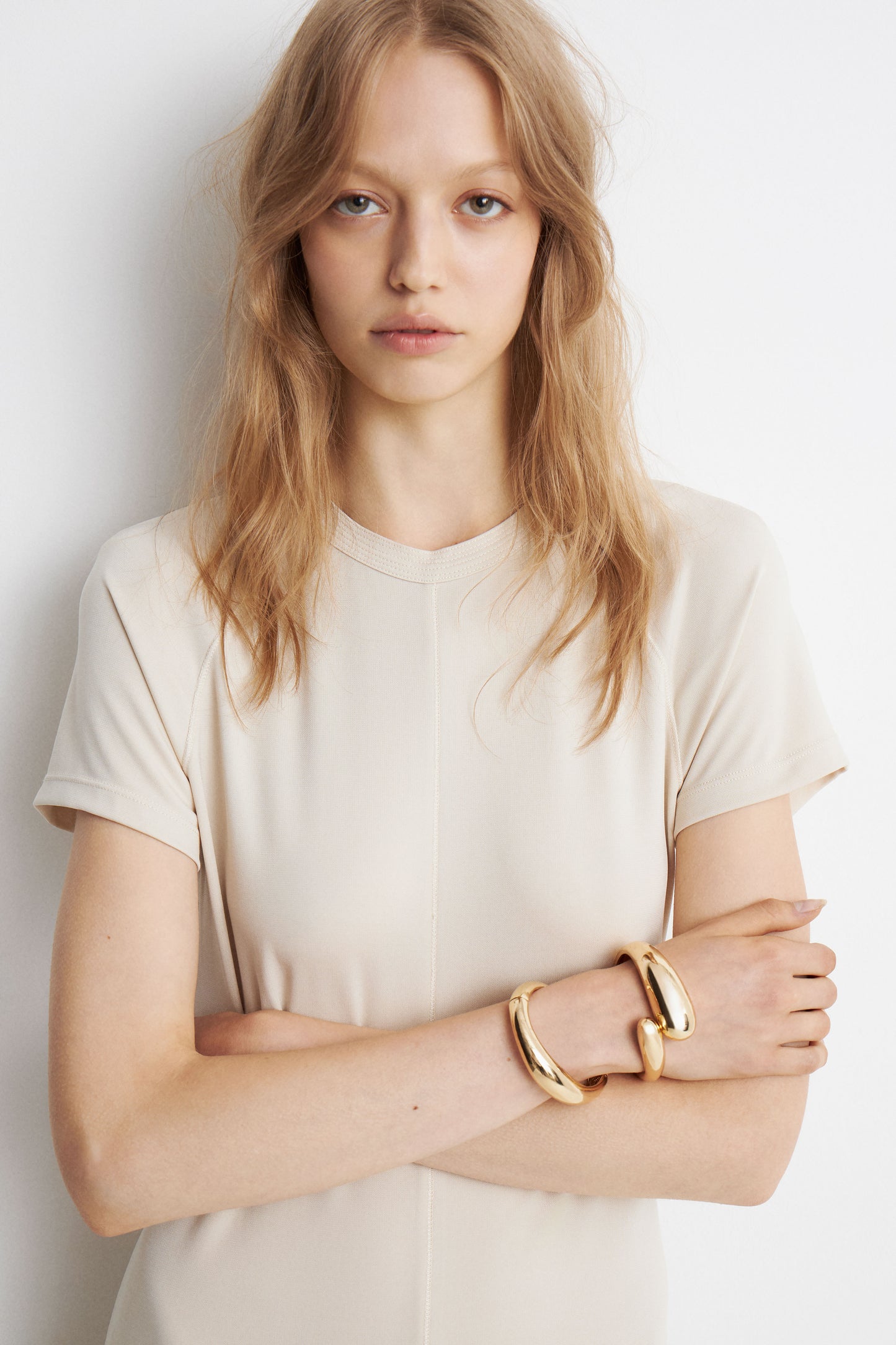 Fitted, ankle-length dress in viscose jersey with stretch. Round neckline, short sleeves, a concealed zip and hook at the back.