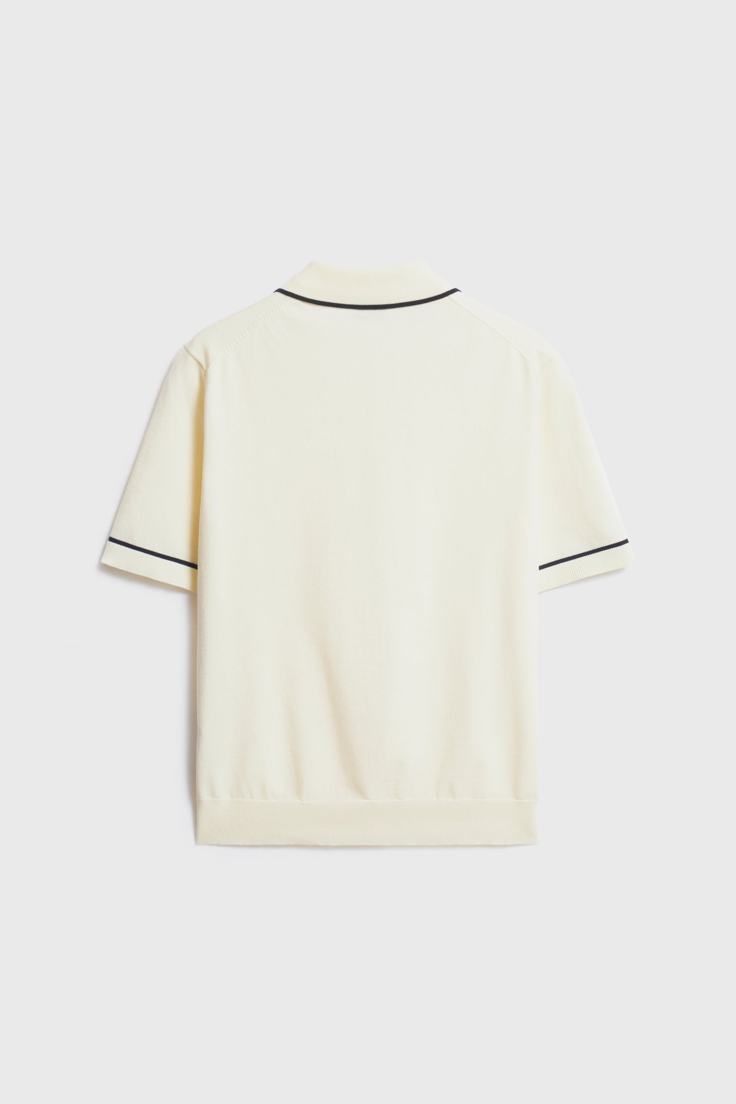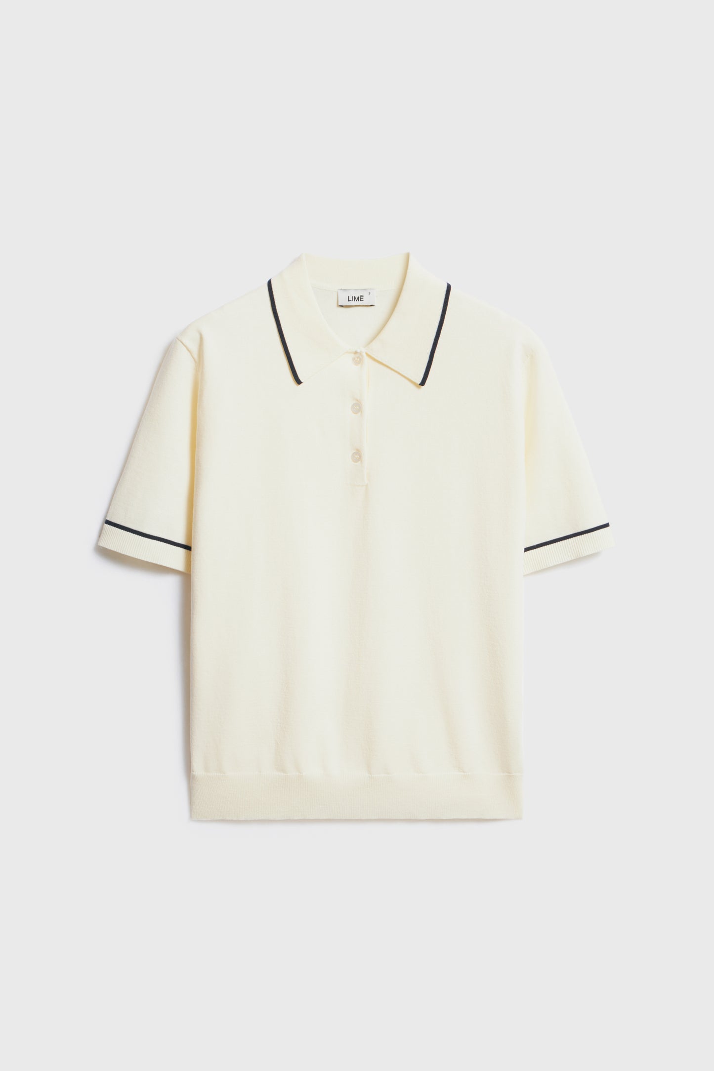 Polo jumper in a soft, fine-knit lyocell blend. Contrast stripes. Collar, button placket, and short sleeves. Ribbing at cuffs and hem.