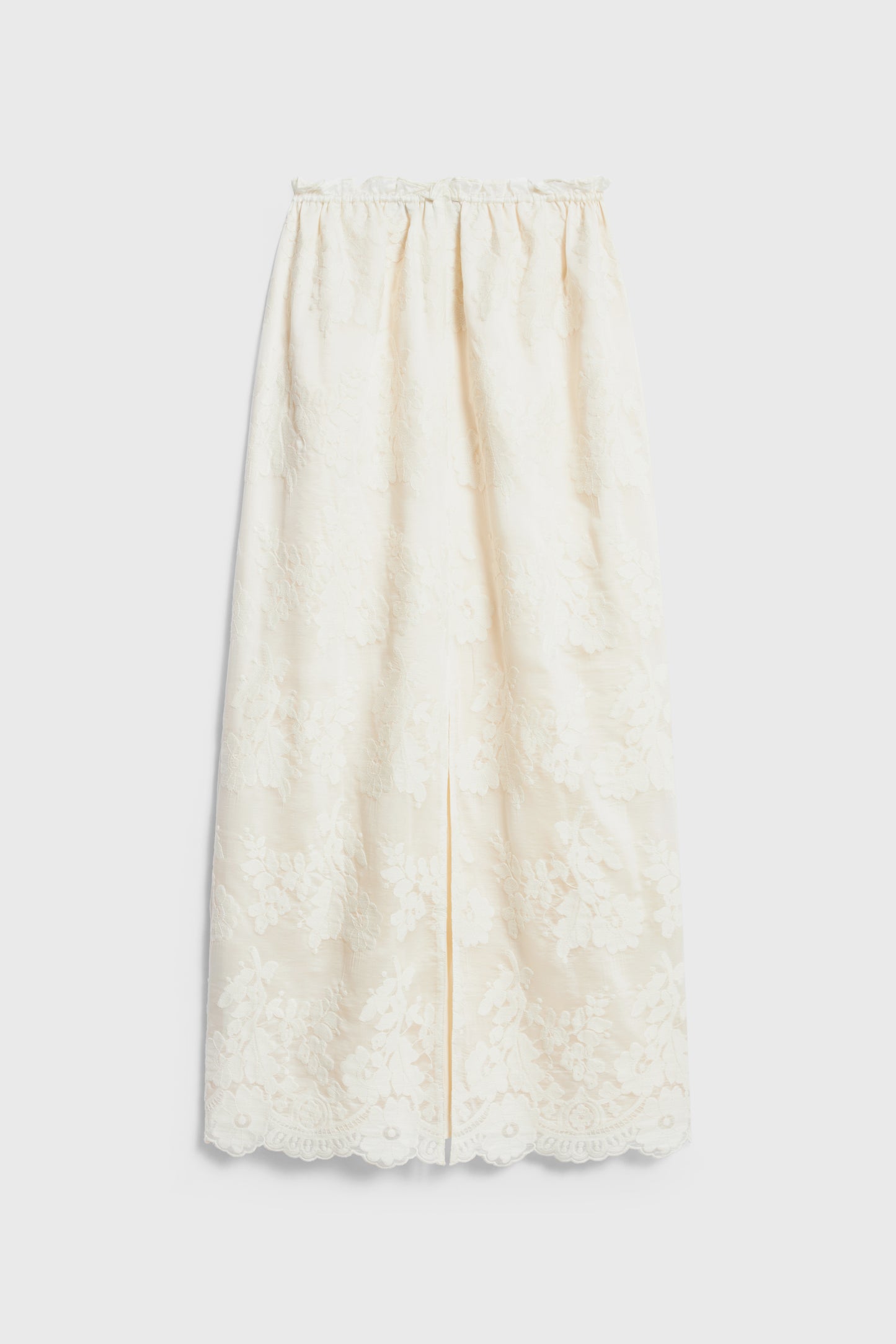 Long skirt in sheer lace made from a lyocell blend. Featuring a high waist with drawstring. Decorated narrow ties with metal pendants in the shape of a cone shell. Scalloped hem. Matching lining.