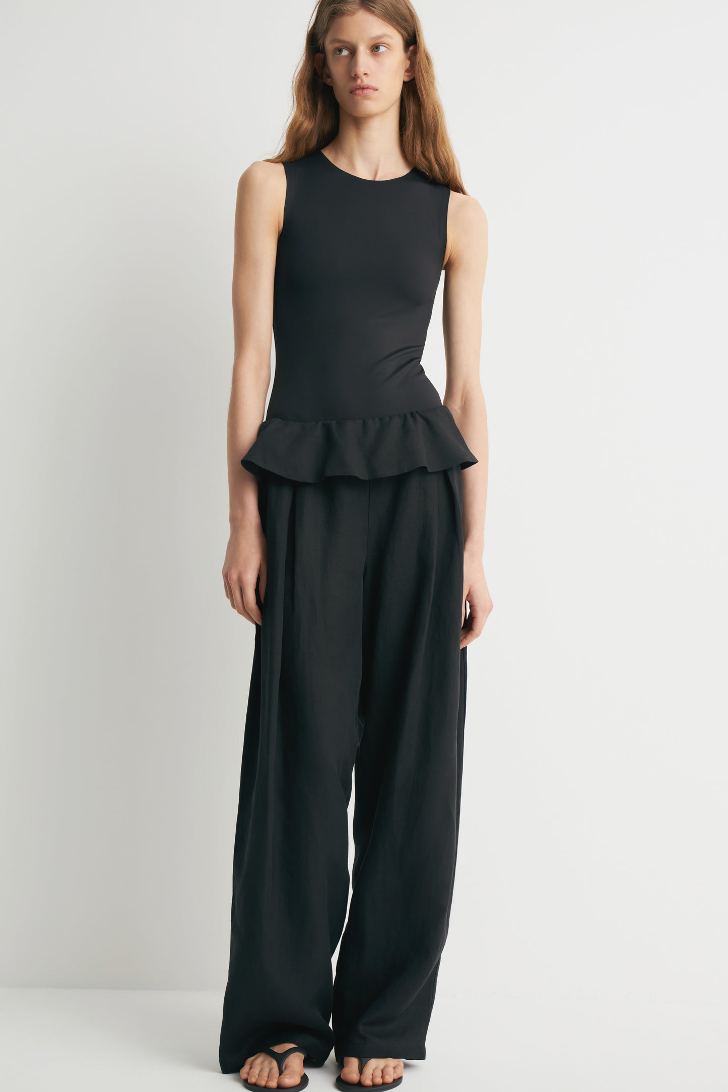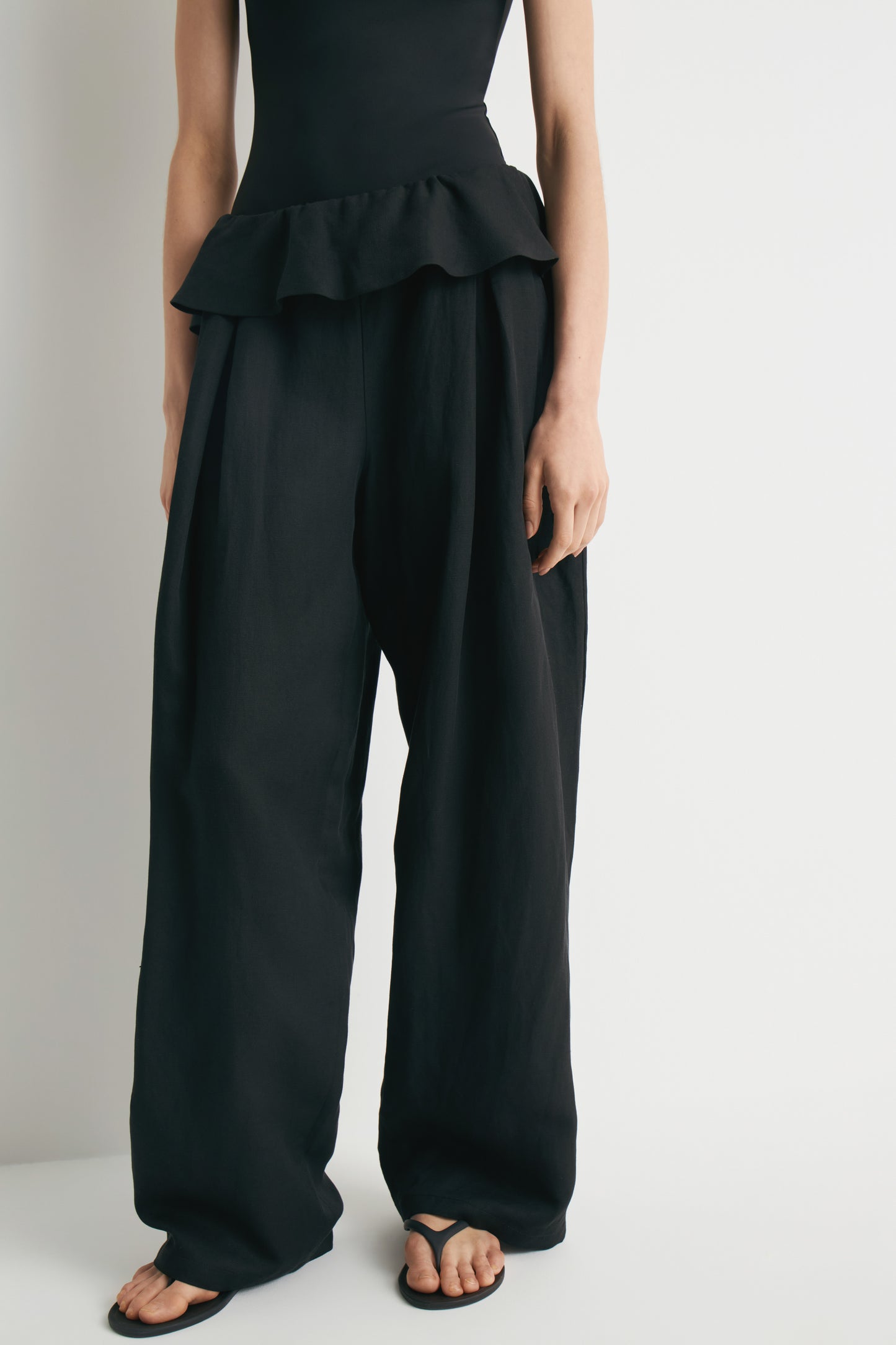 Crafted from lyocell with breathable linen, these high-waisted trousers have wide legs. They feature a wide flounce with covered elastication around the waist and a drawstring. Diagonal side pockets.