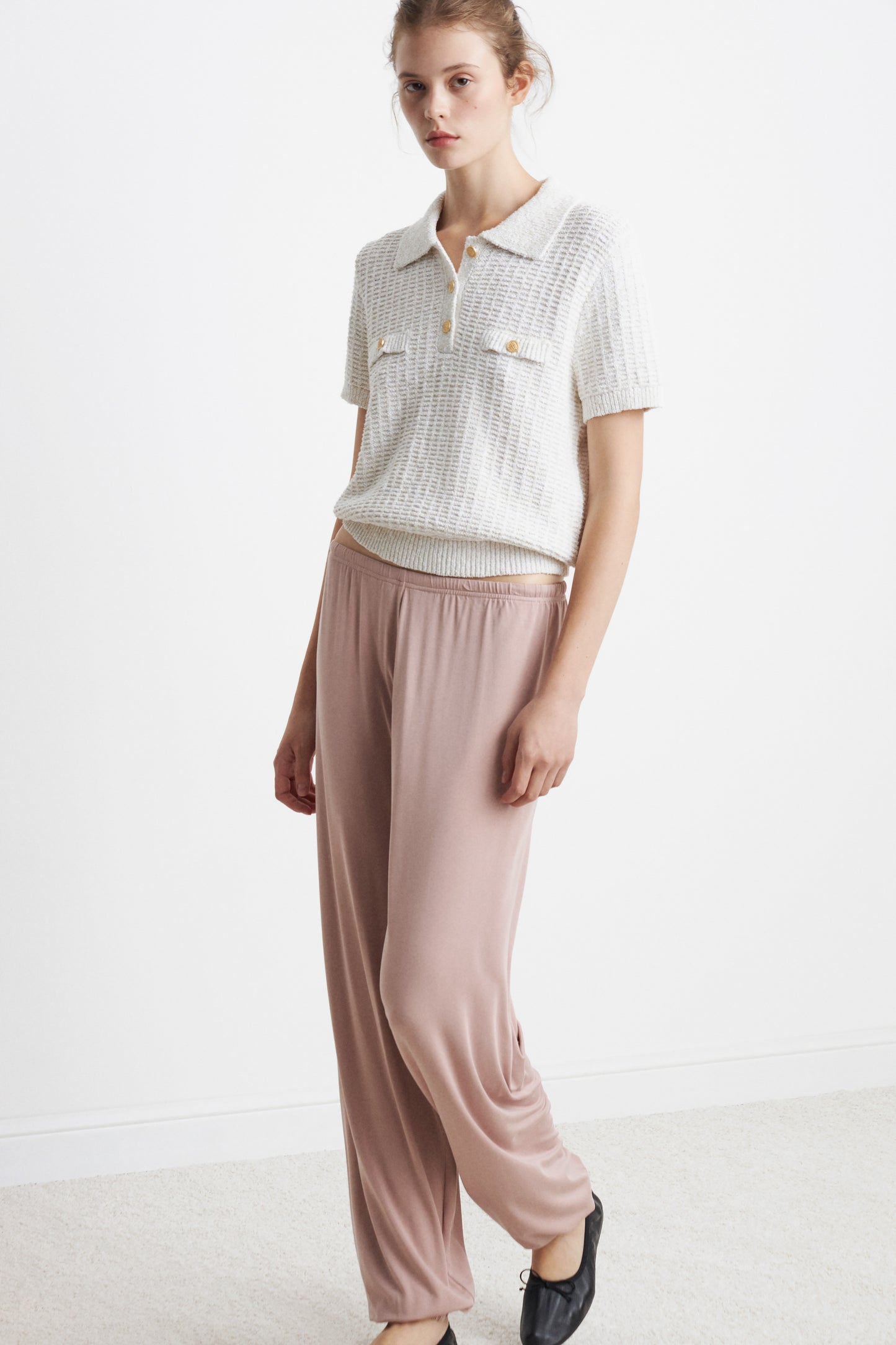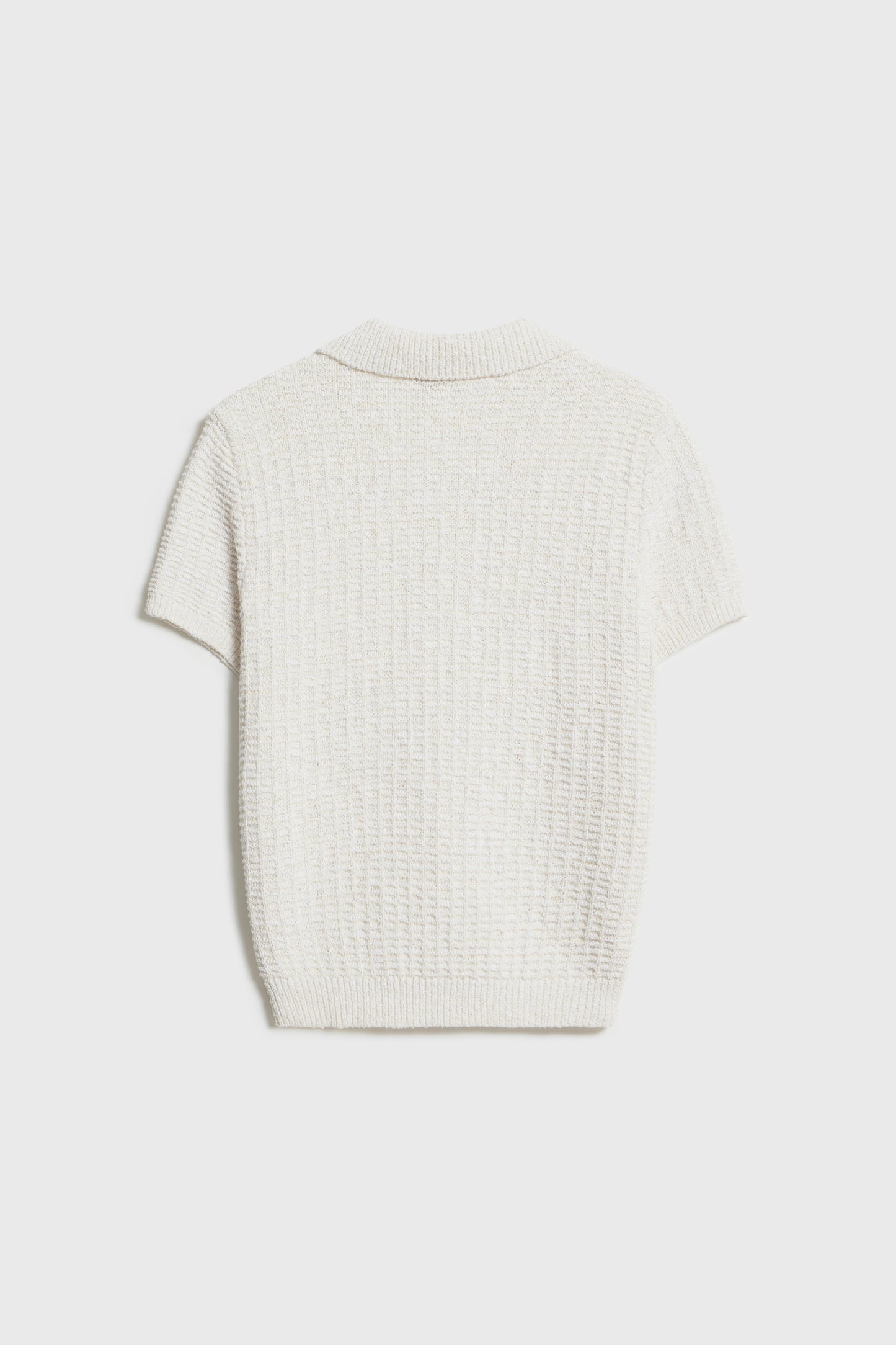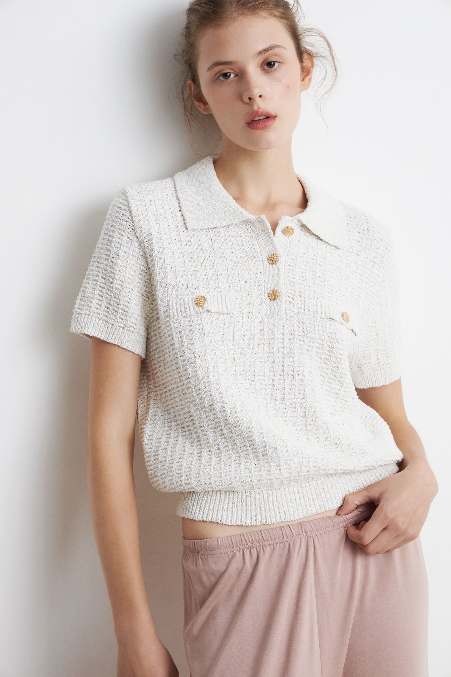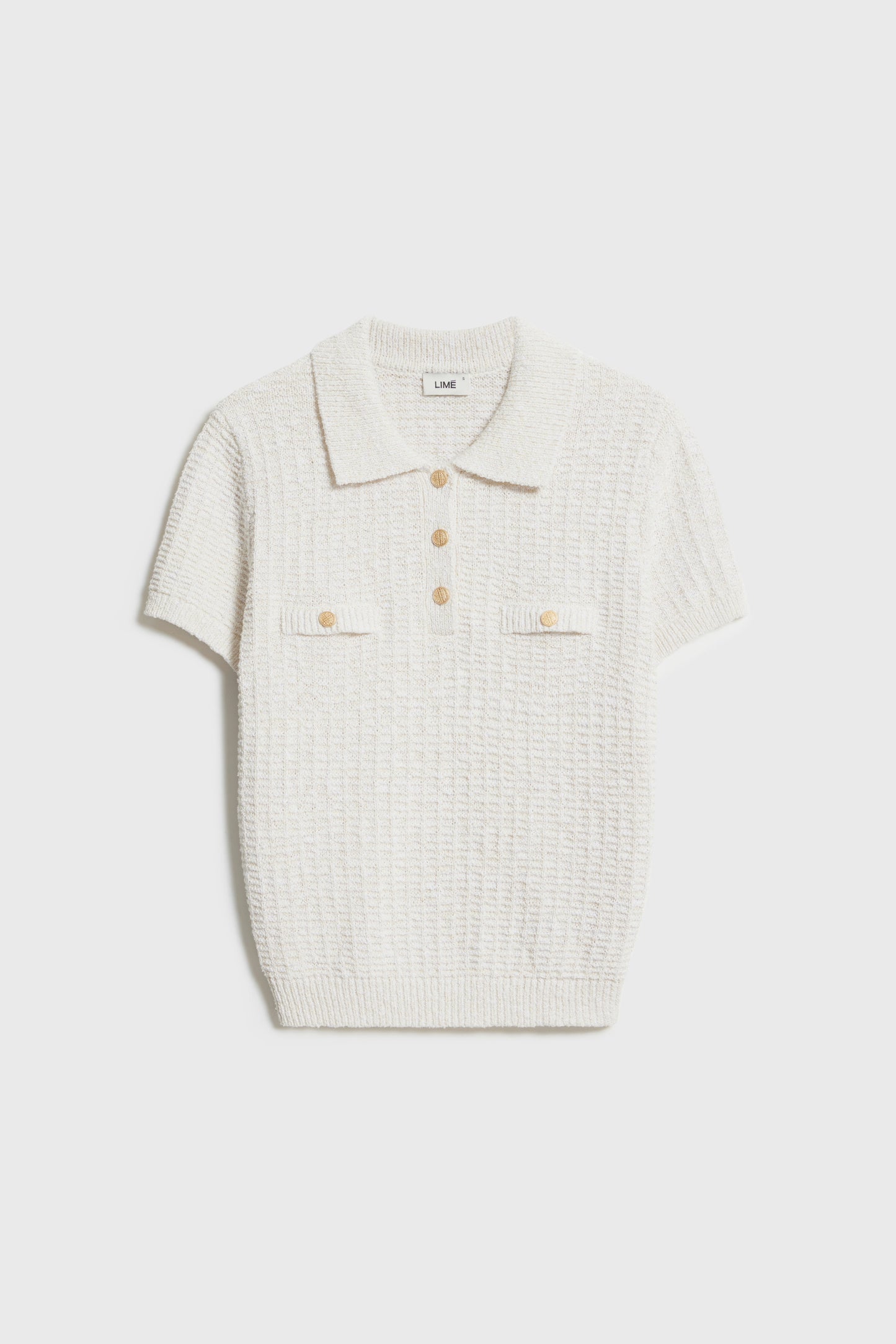Short-sleeved polo sweater in a thick, textured knit made of cotton blend containing some metallic threads. Collar, short button placket, and fake front pockets.
