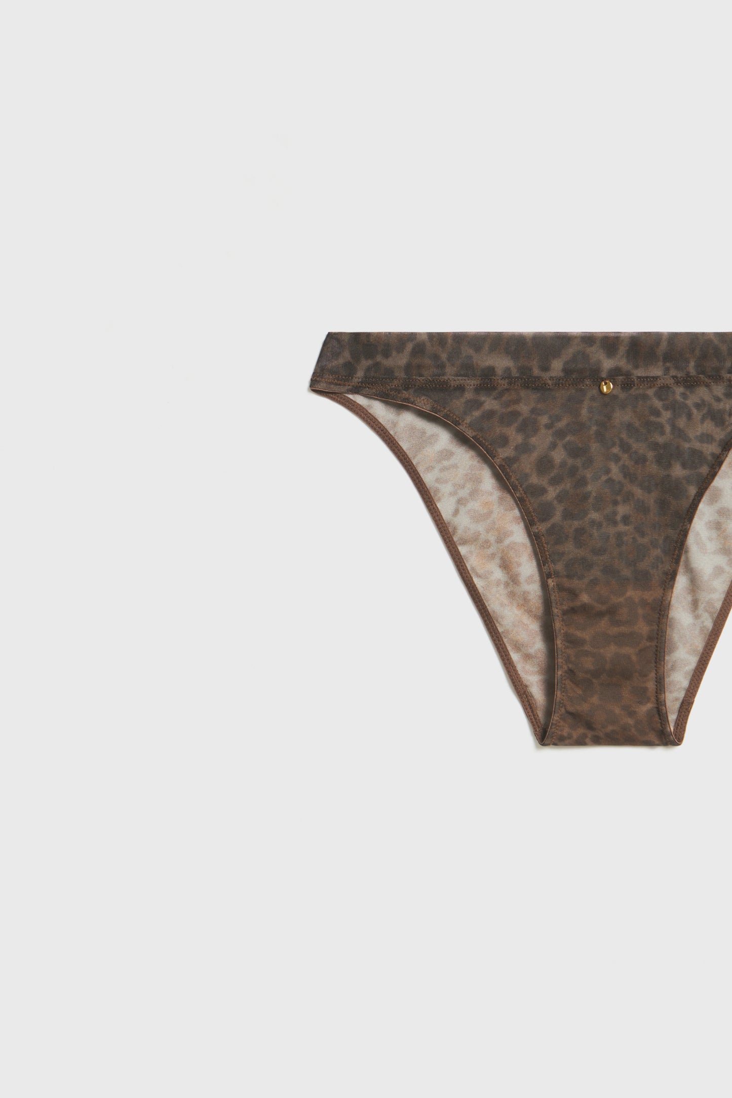 Briefs crafted from sheer mesh in mesh with metal appliqué at the front. Detailed with a high waist, narrow, elasticated sides, a lined gusset and high cut edges.