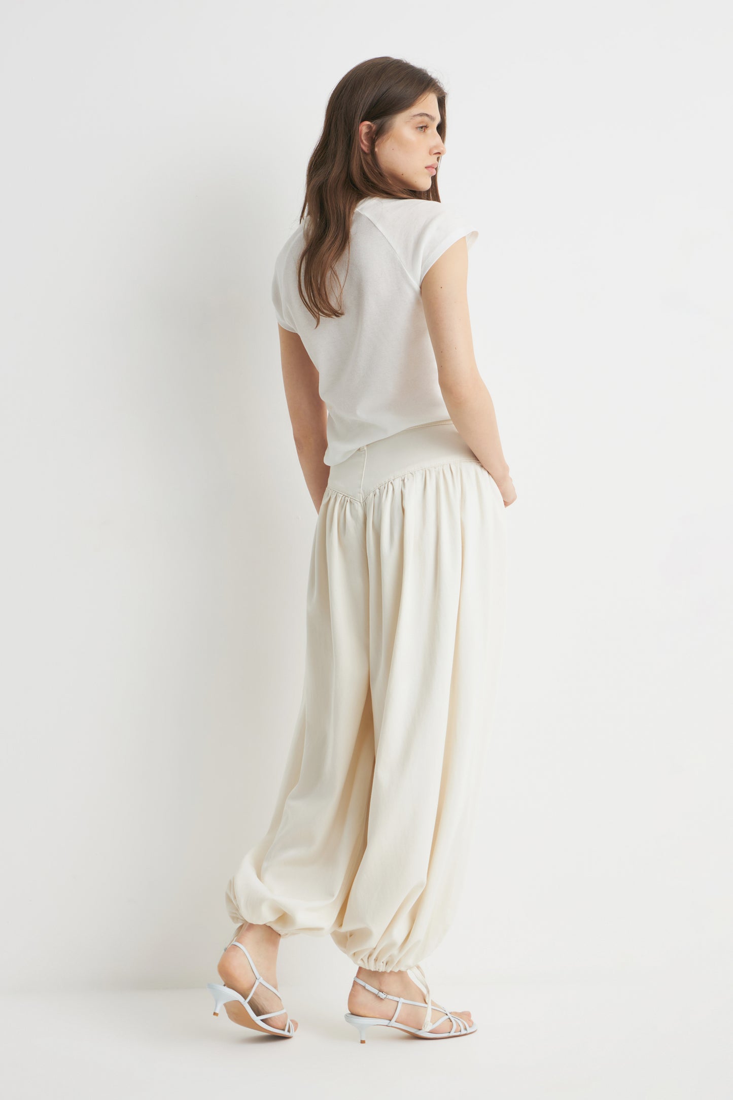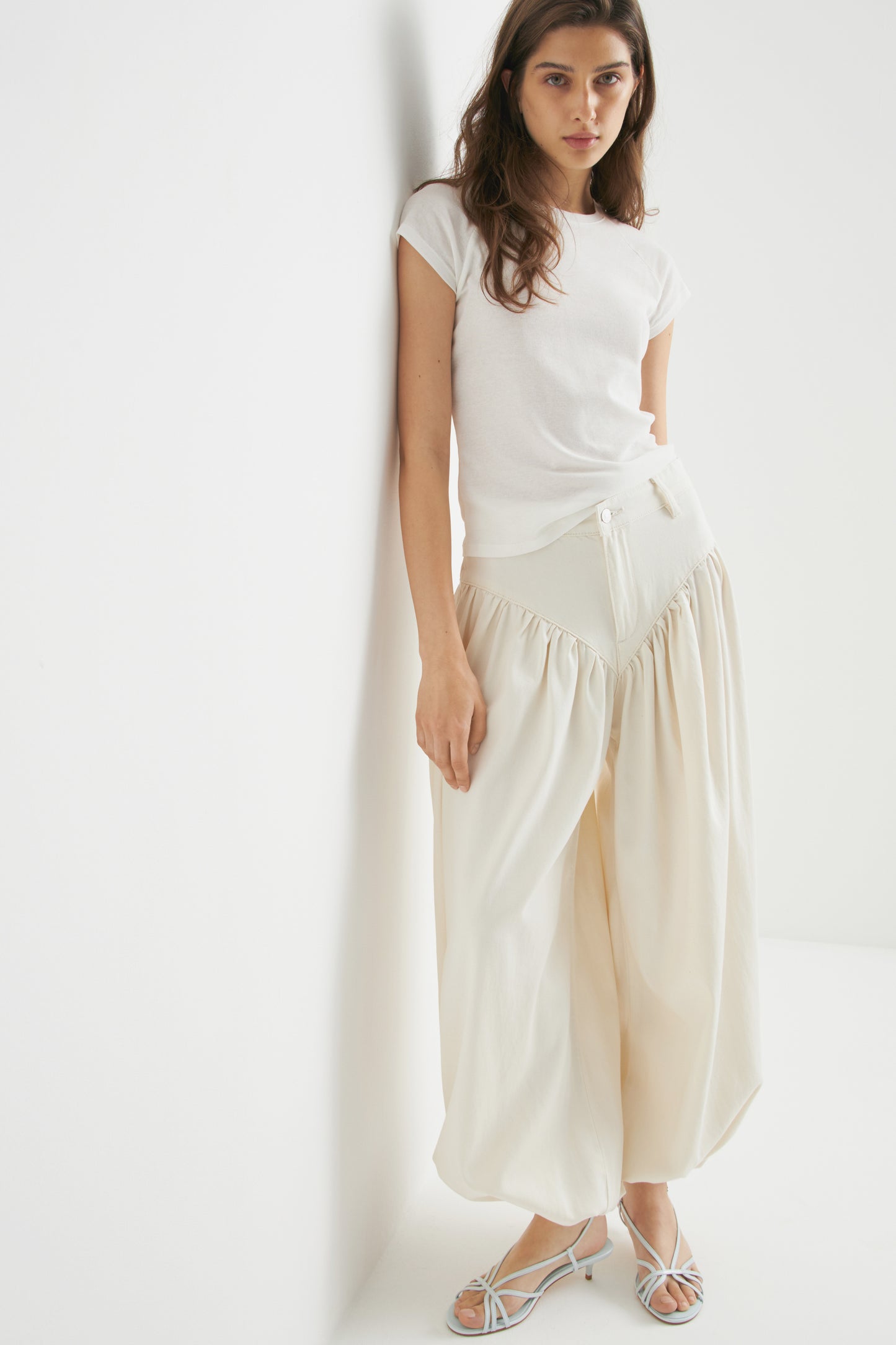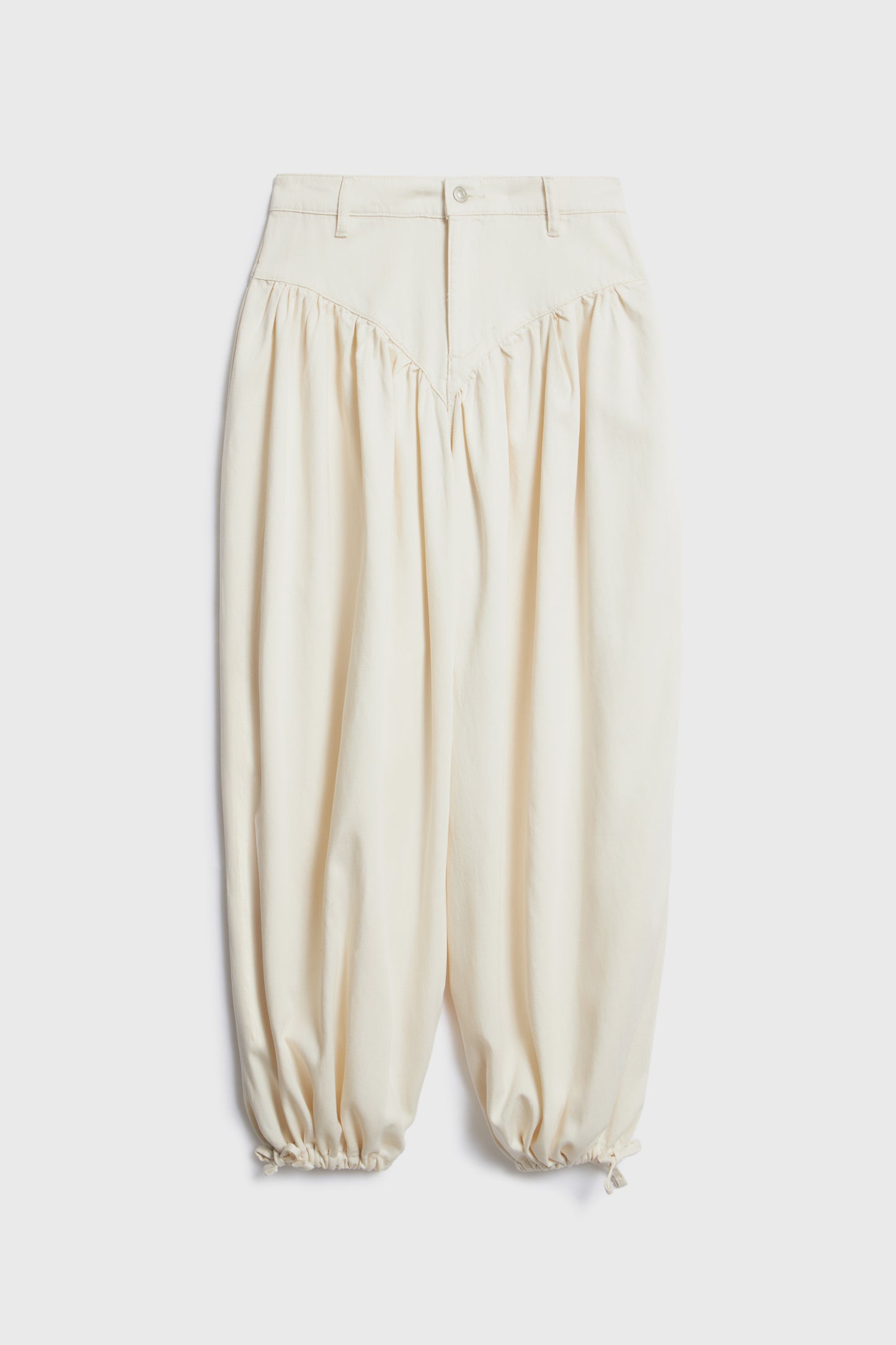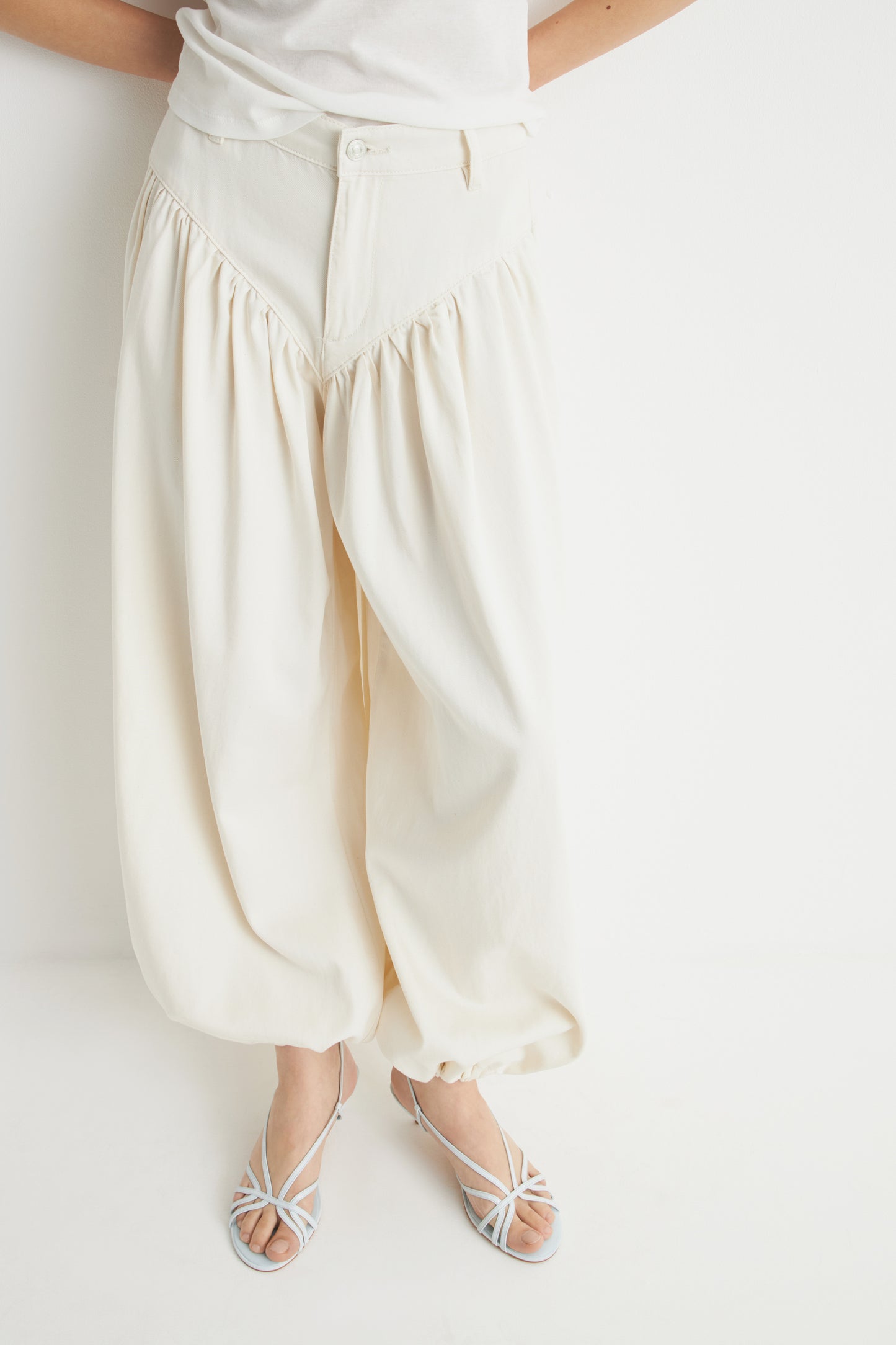 Baggy-fit jeans in supersoft and light denim crafted from a lyocell and cotton blend. Gathered yoke-inspired detail. Drawstring at the hems. Front top button fastening.