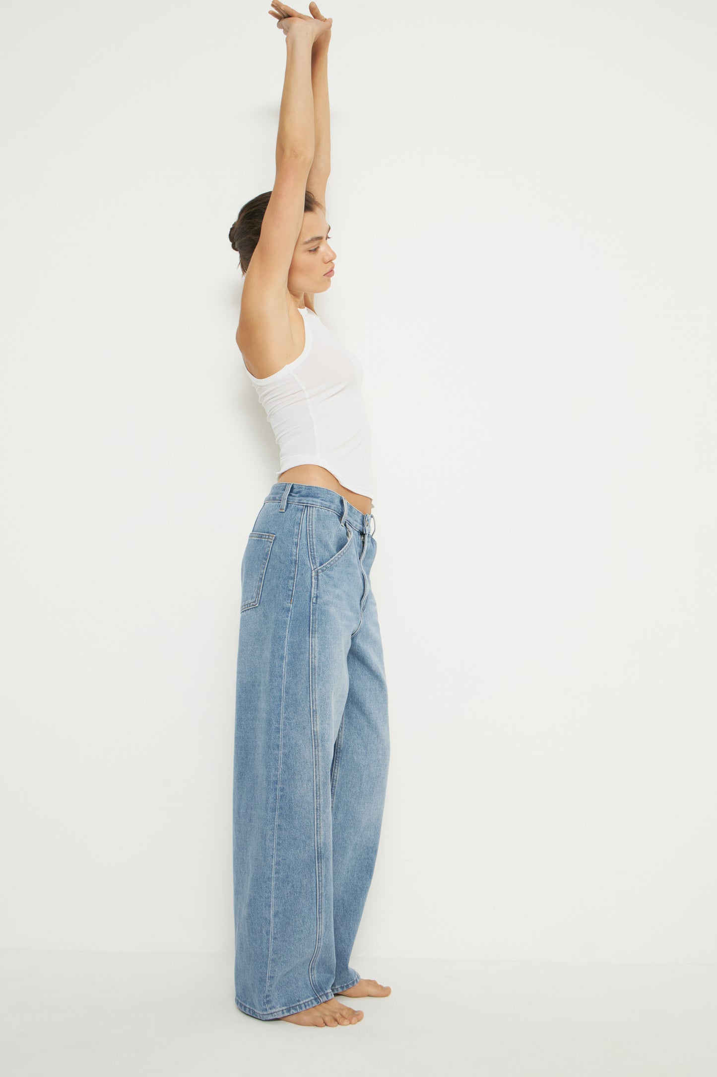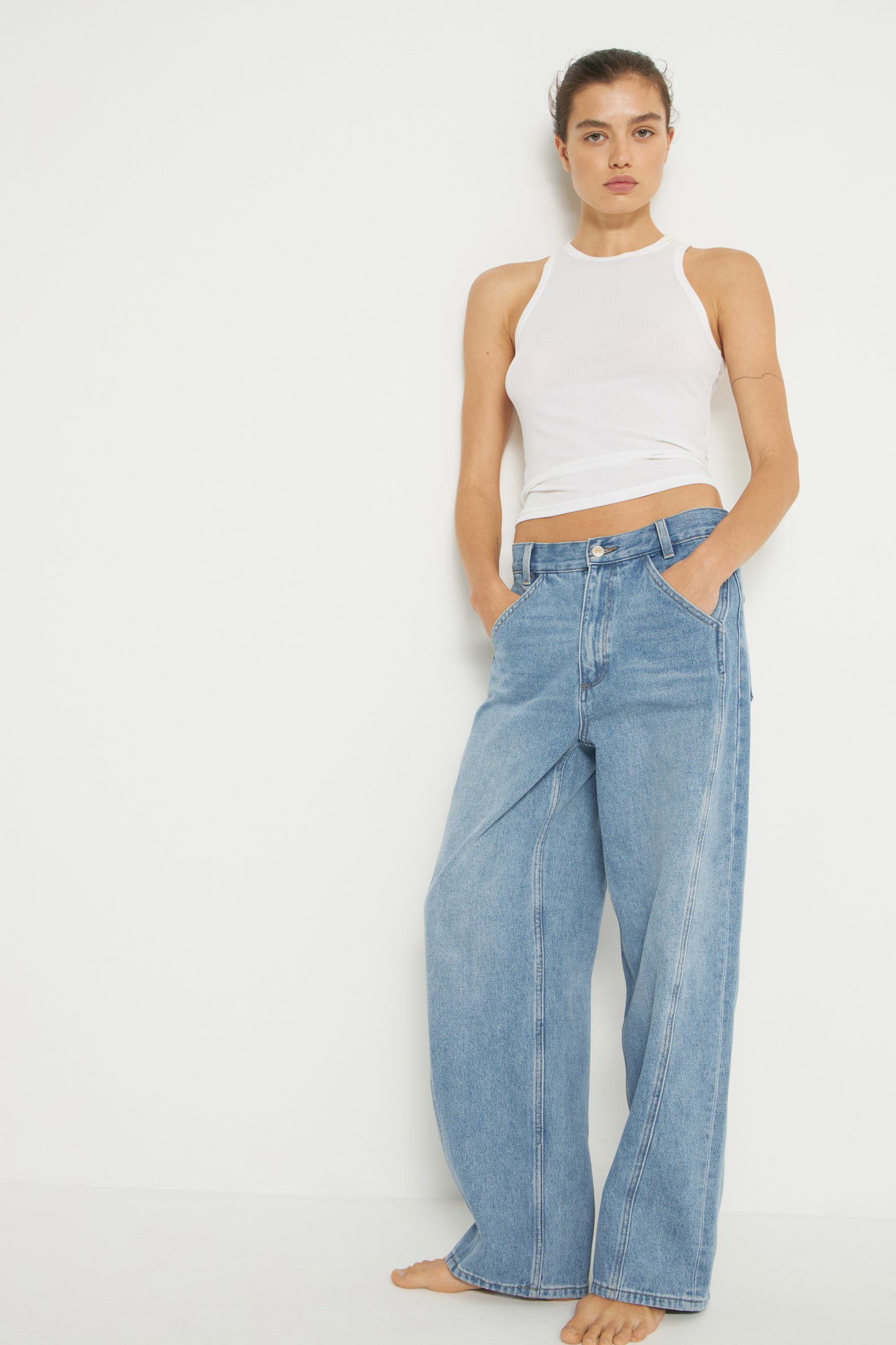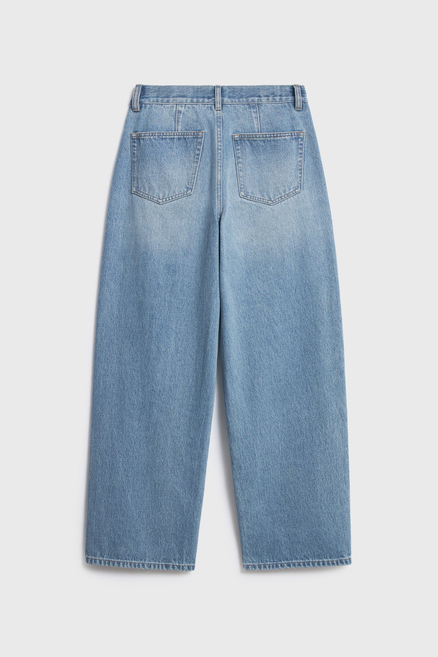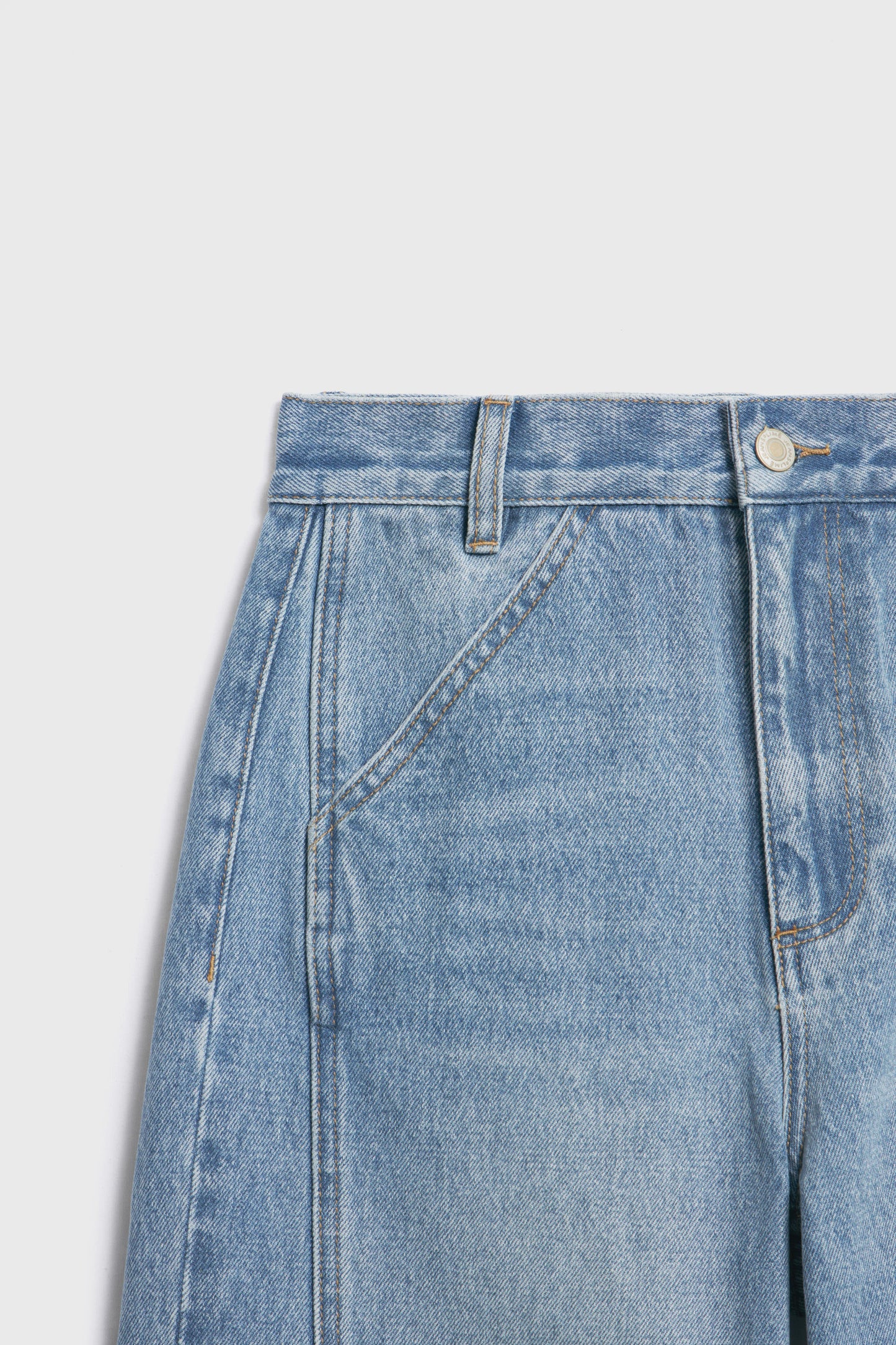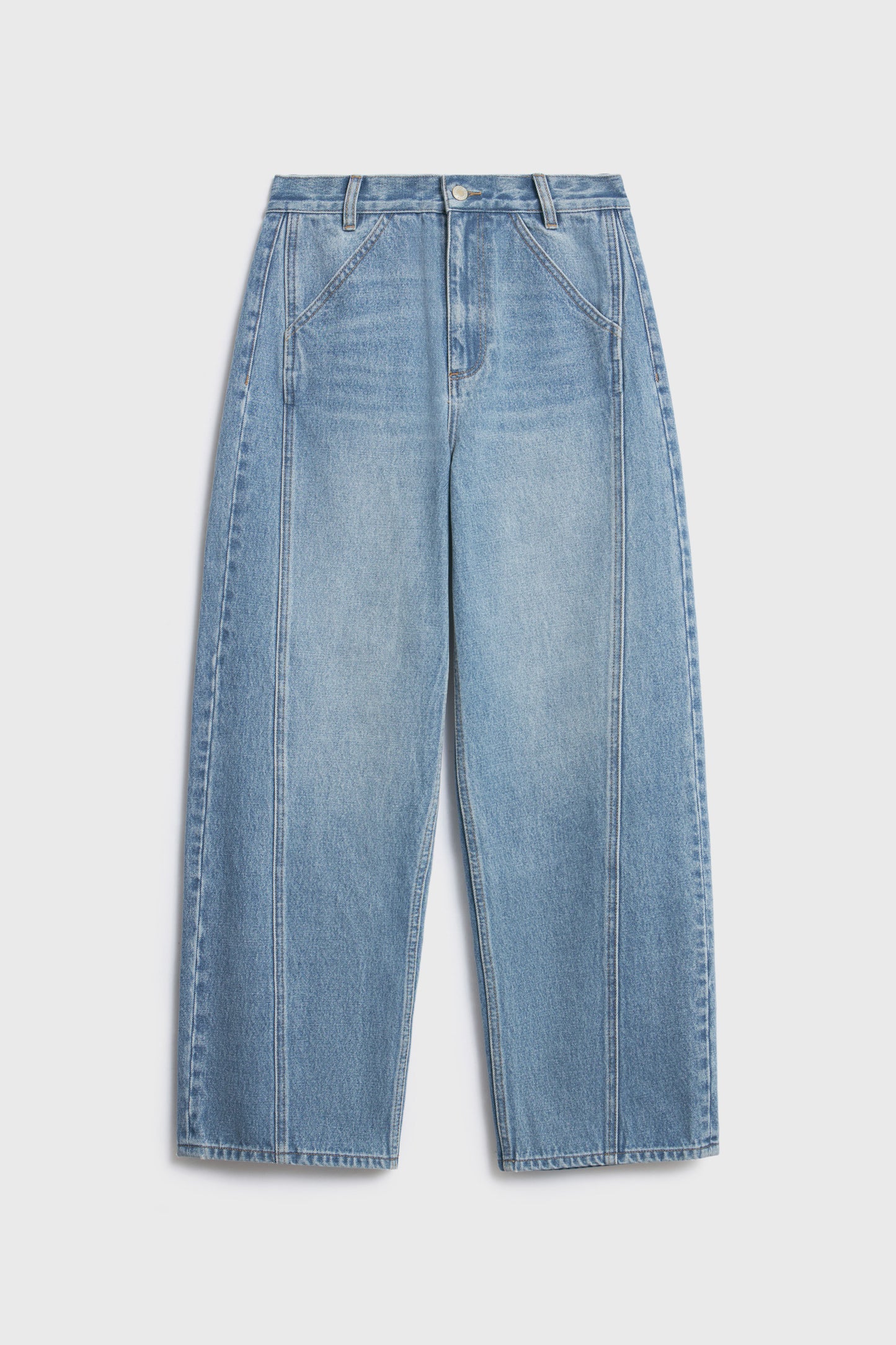 This sophisticated jeans in washed cotton and viscose blend denim with a mid waist. Relaxed fit and tapered legs with an asymmetric seams detailing. Front pockets and patch back pockets. Front zip fly and top button fastening.
