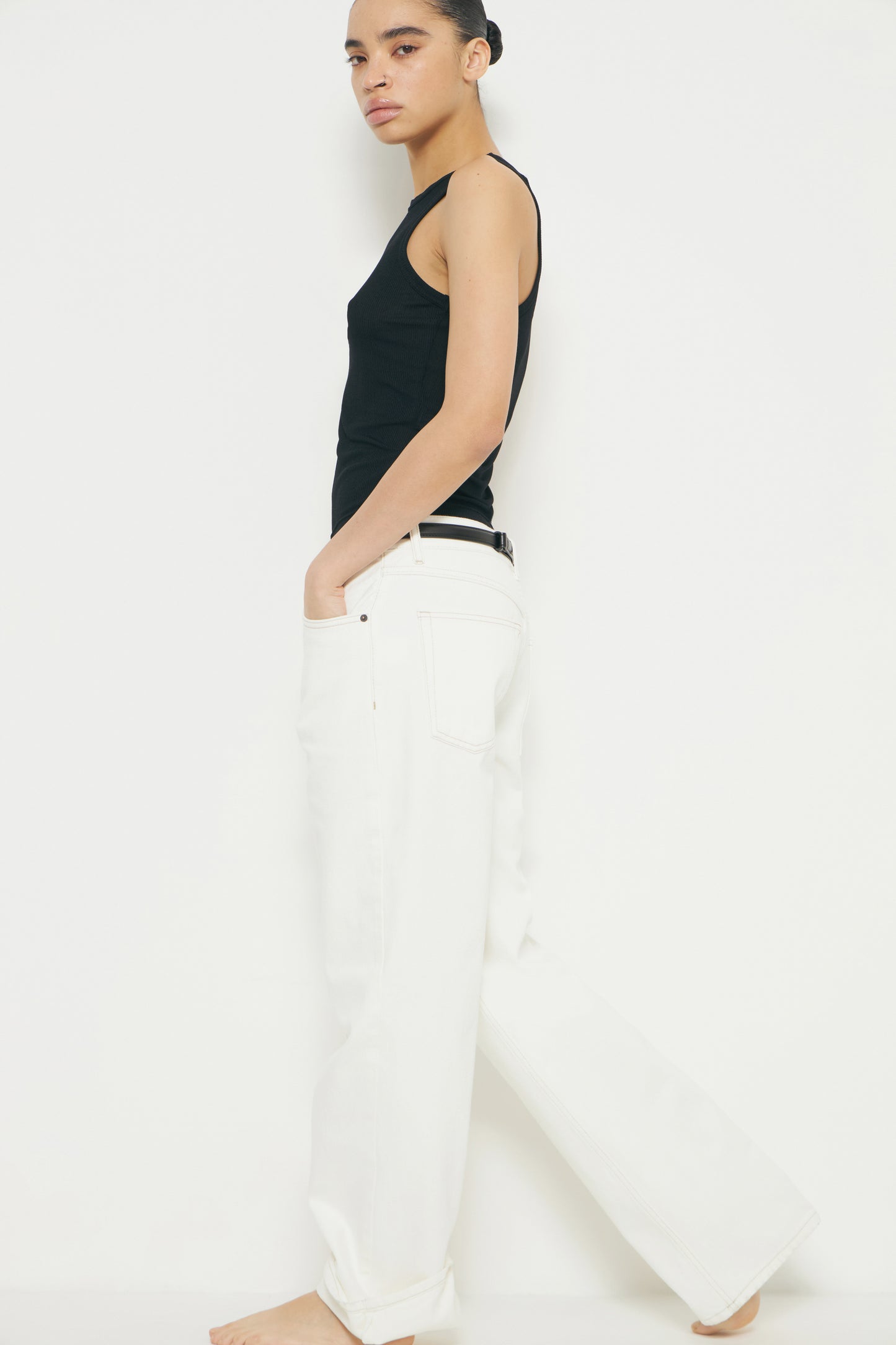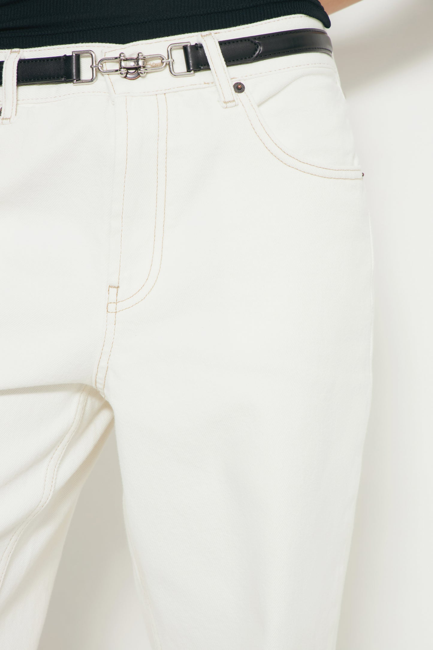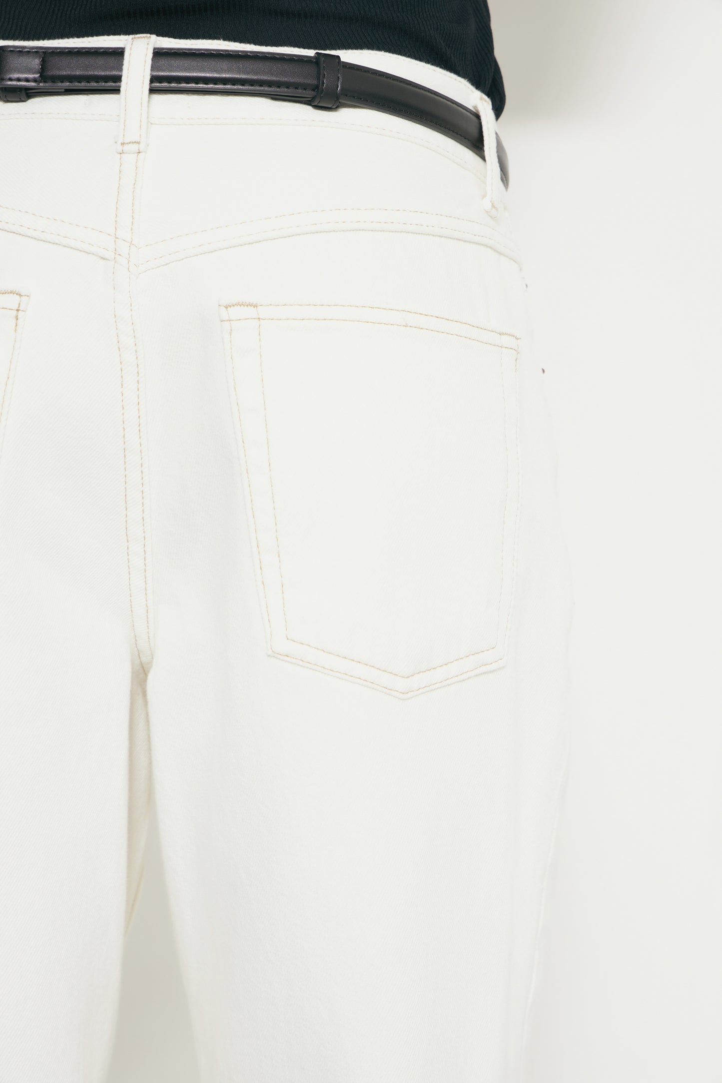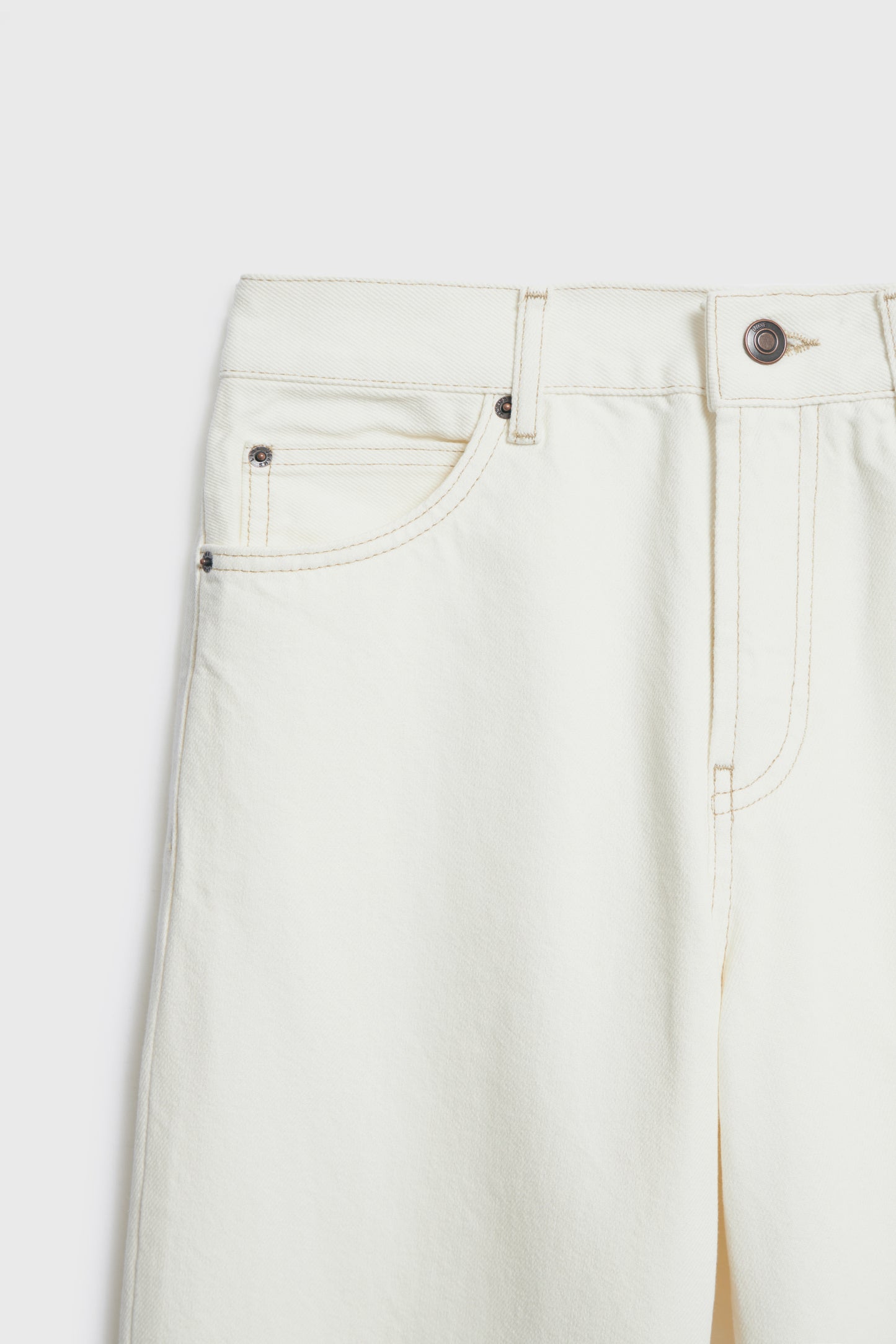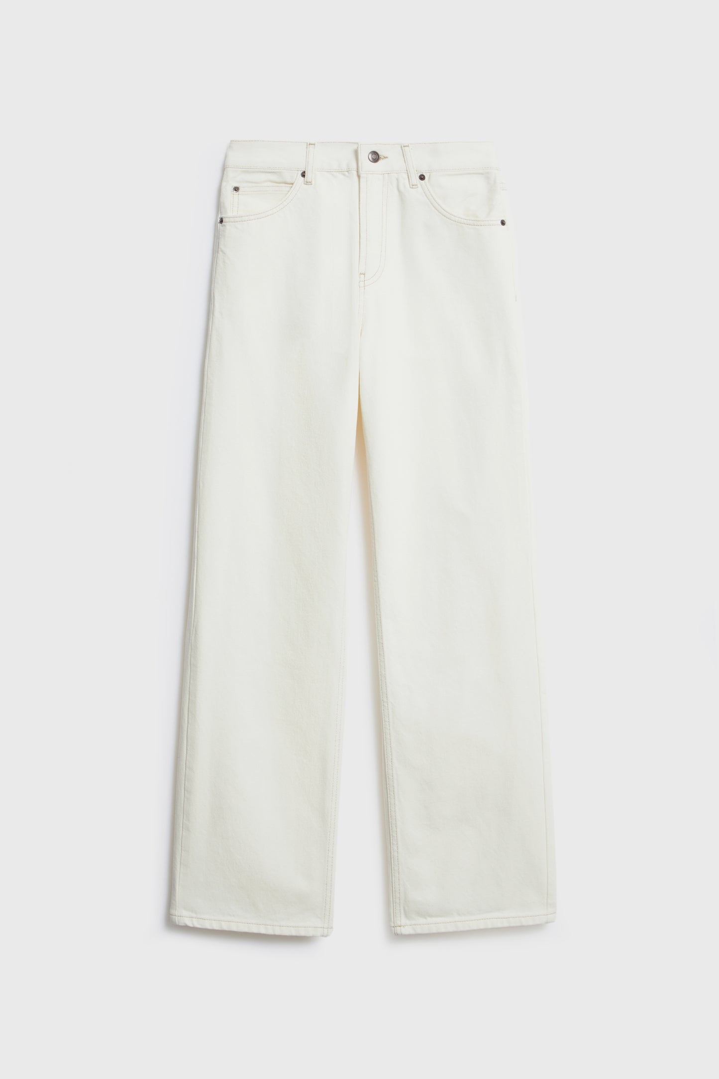 5-pocket jeans in cotton denim with a mid waist. Each bordered with tobacco-brown topstitching. Relaxed fit through the hip and thigh with tapered legs. Front zip fly and metal button fastening.