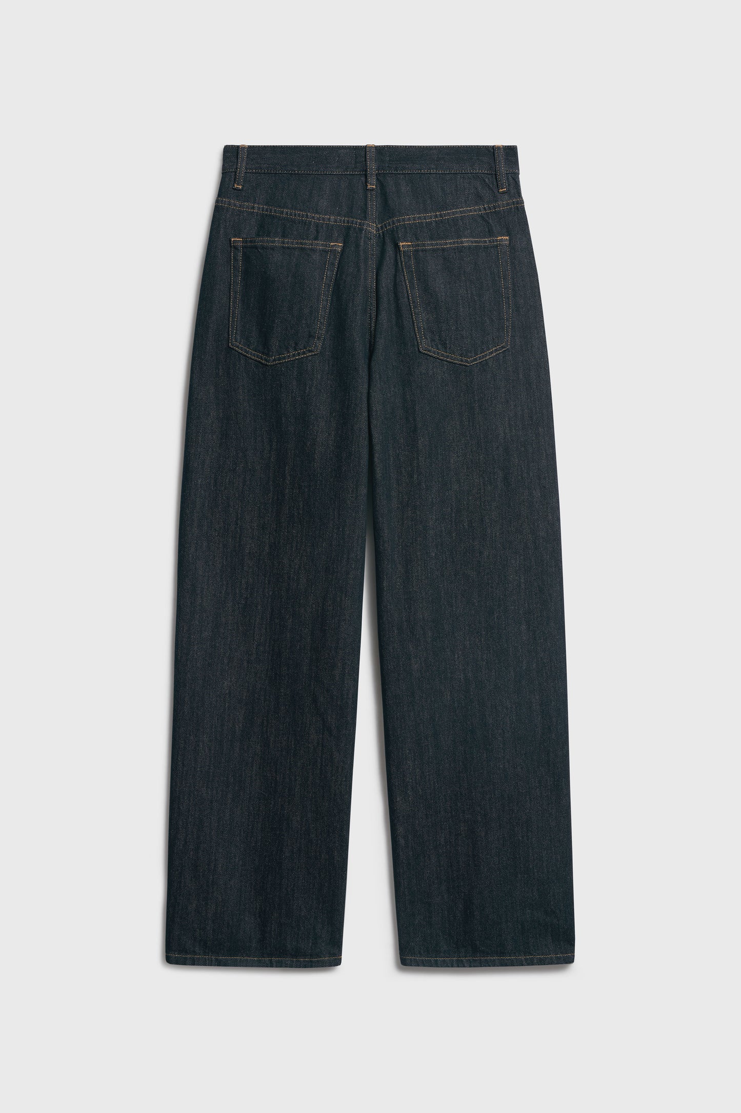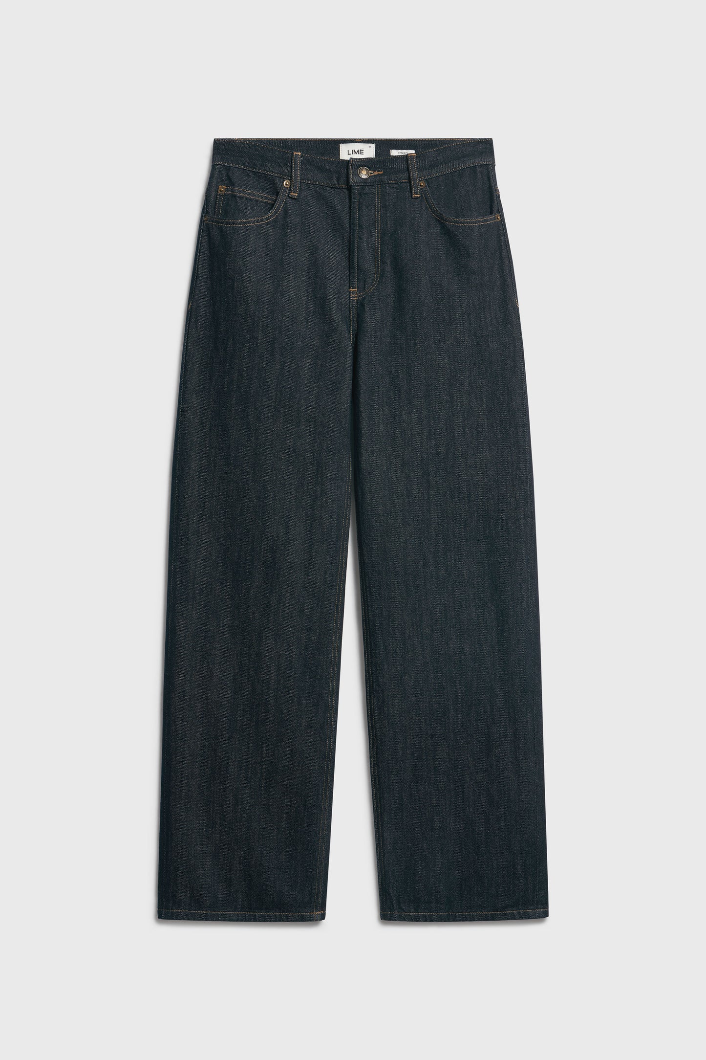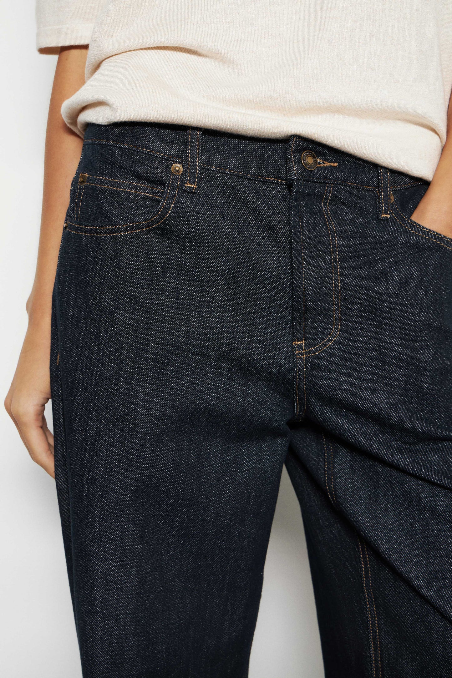 Mid-waist jeans with a five-pocket design. Straight legs. Tobacco-brown topstitching. Front zip fly and metal button fastening.