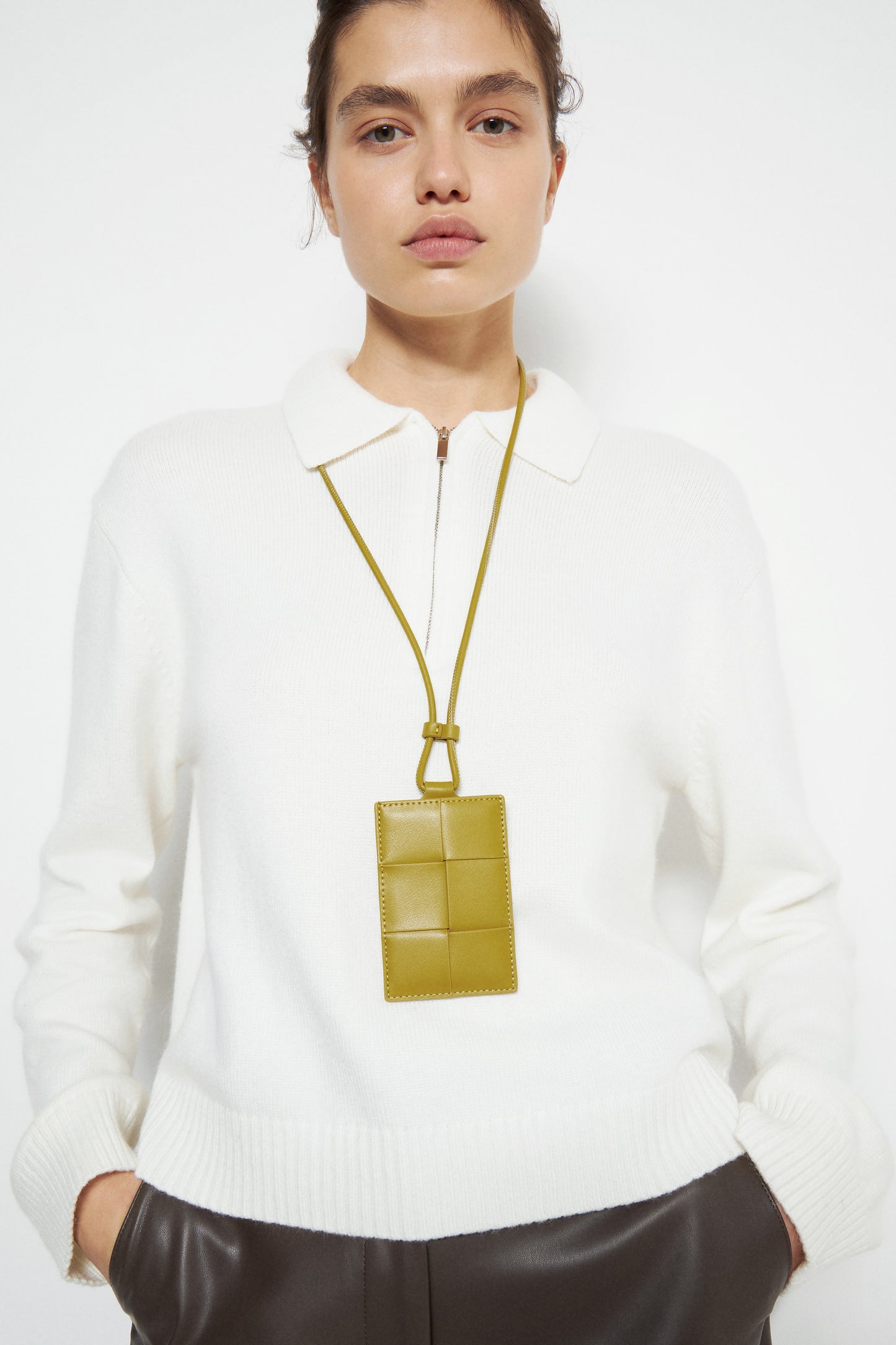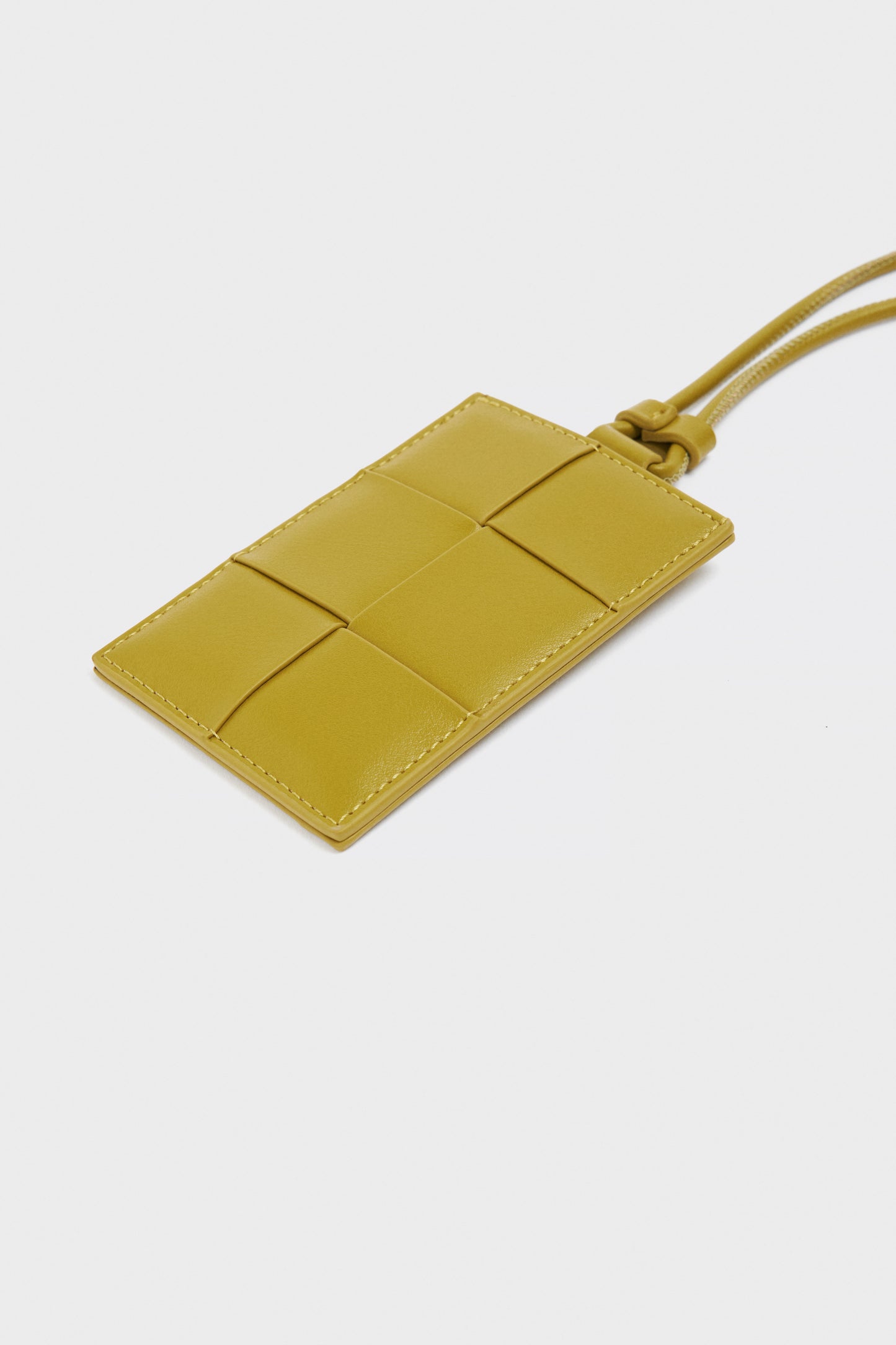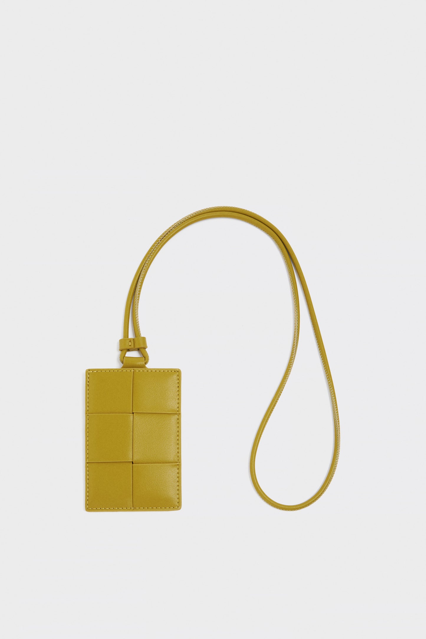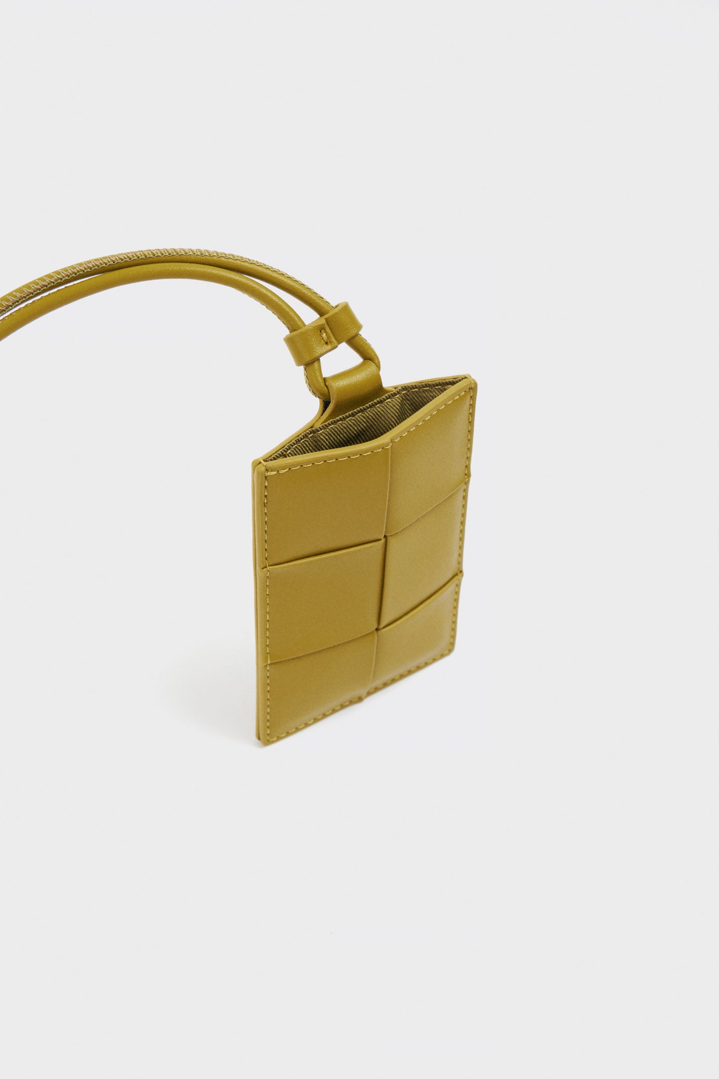 Braided cardholder in faux suede has one compartment at the top and a neck strap. Card compartment on the outside. ONE SIZE: 7,5 x 0,4 x 11 cm