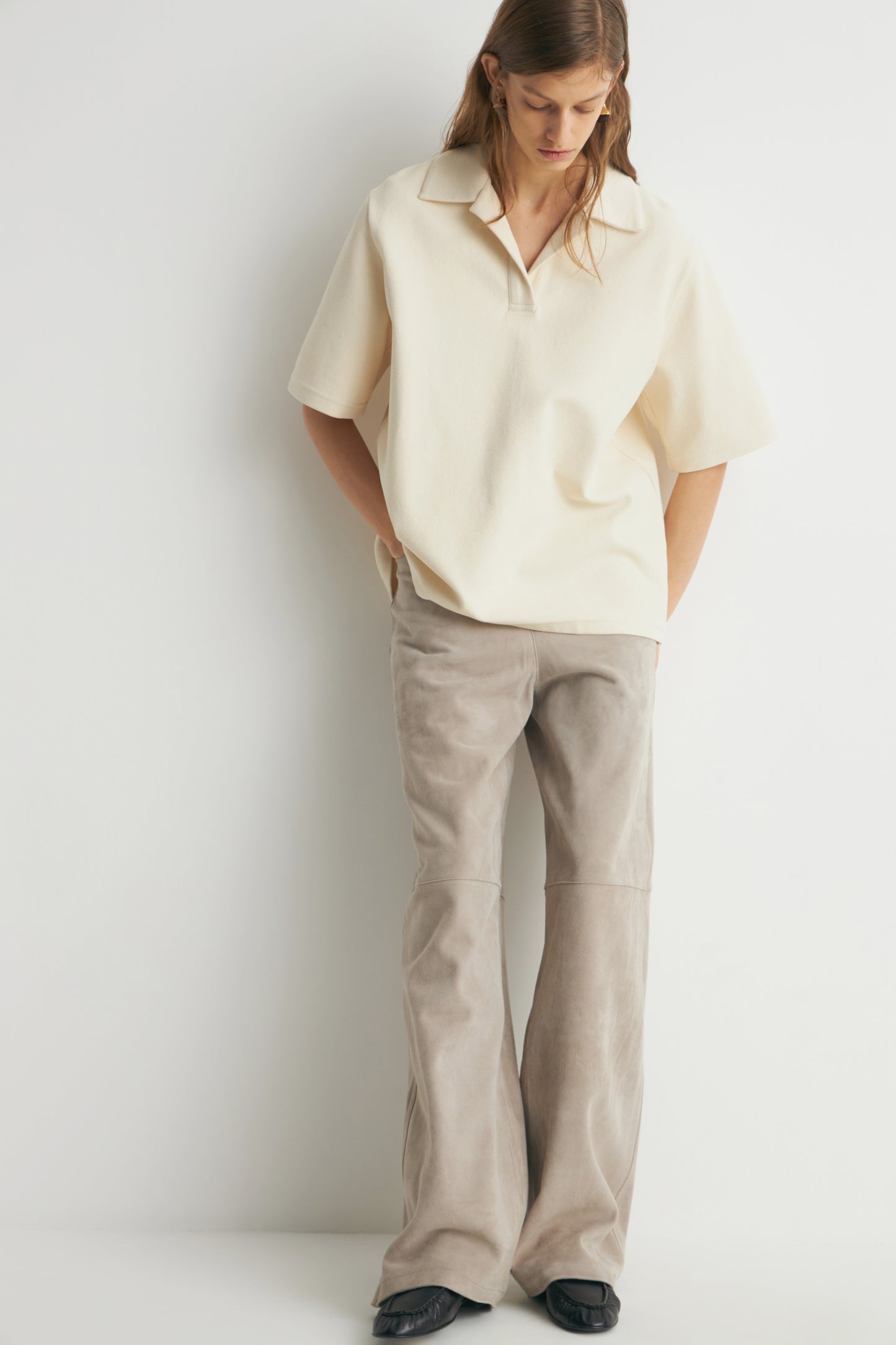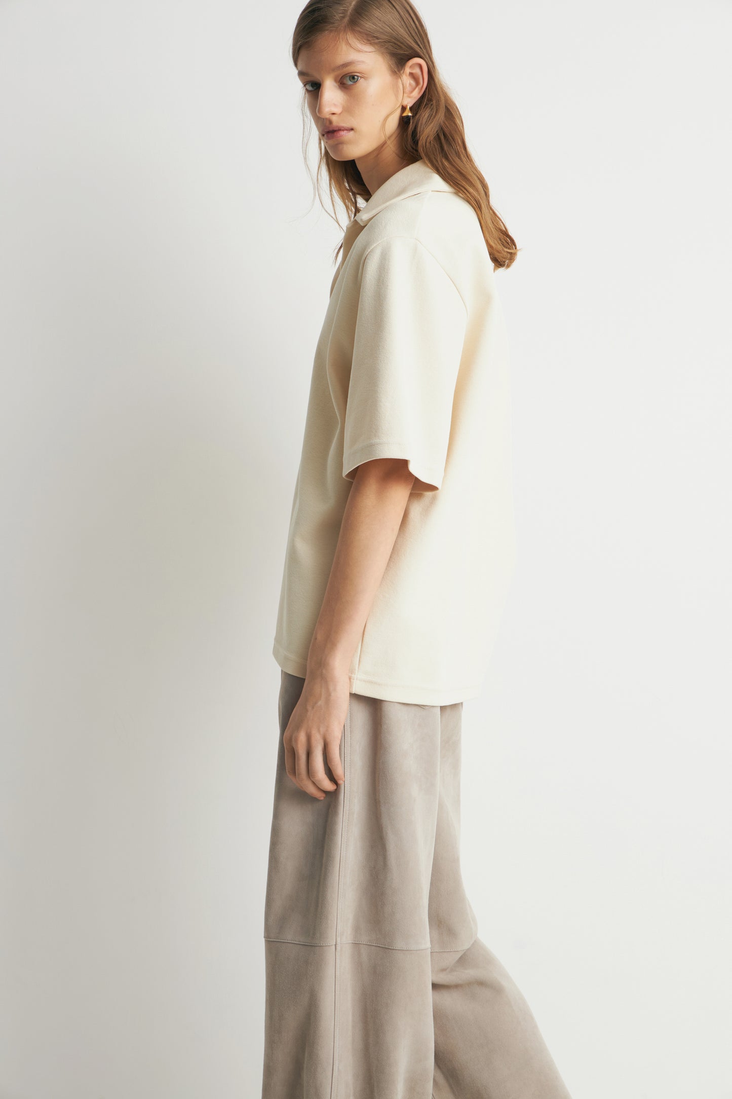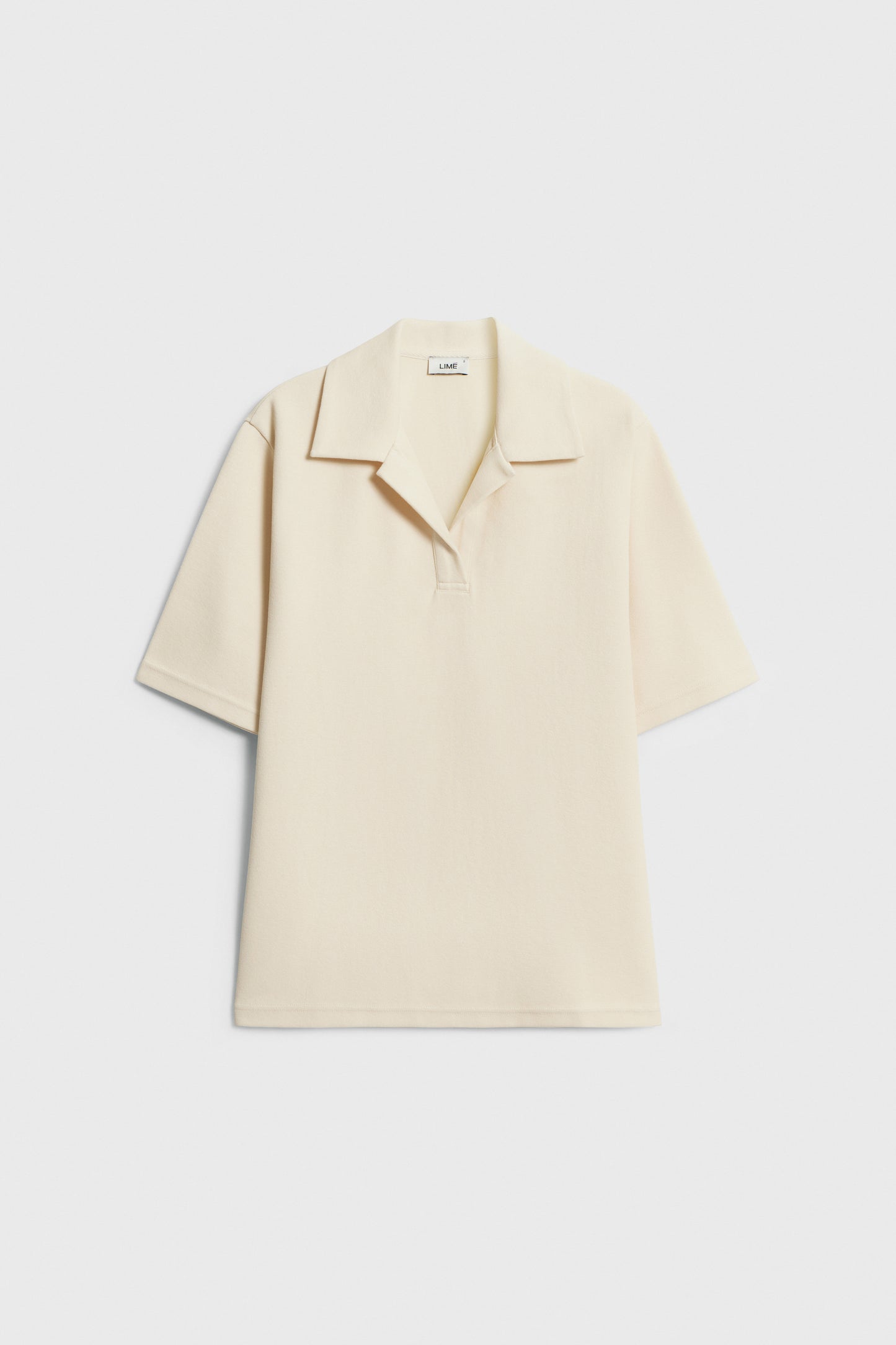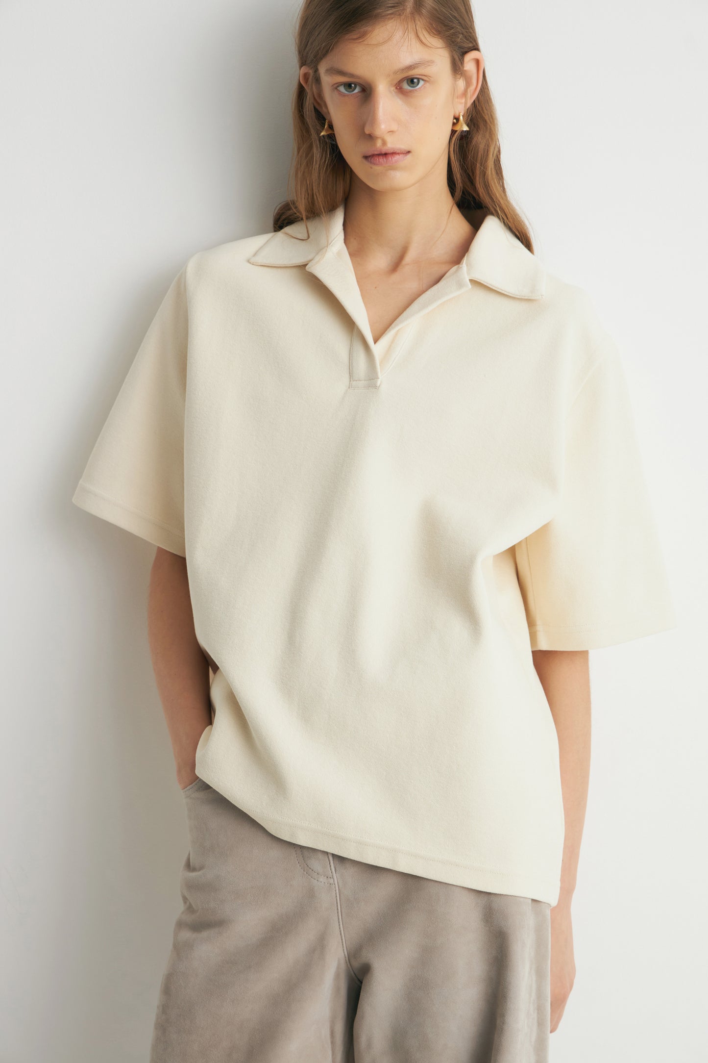 Oversized T-shirt in cotton piqué. Short sleeves. Lapel collar and V-neckline.