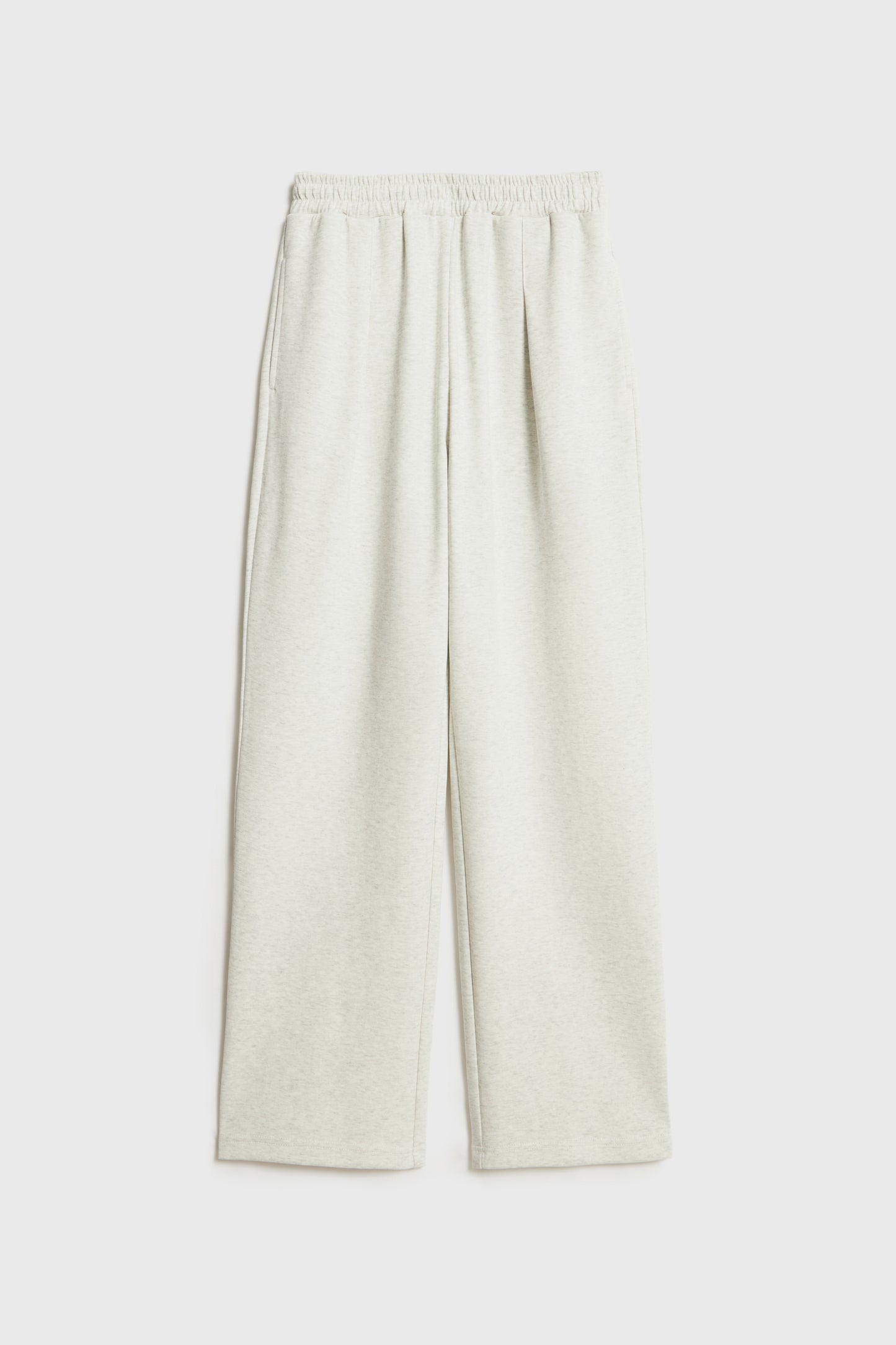 Basic trousers in cotton blend with front pleats. Elasticized drawstring waistband, diagonal side pockets, and a fake back pocket. Tapered legs.