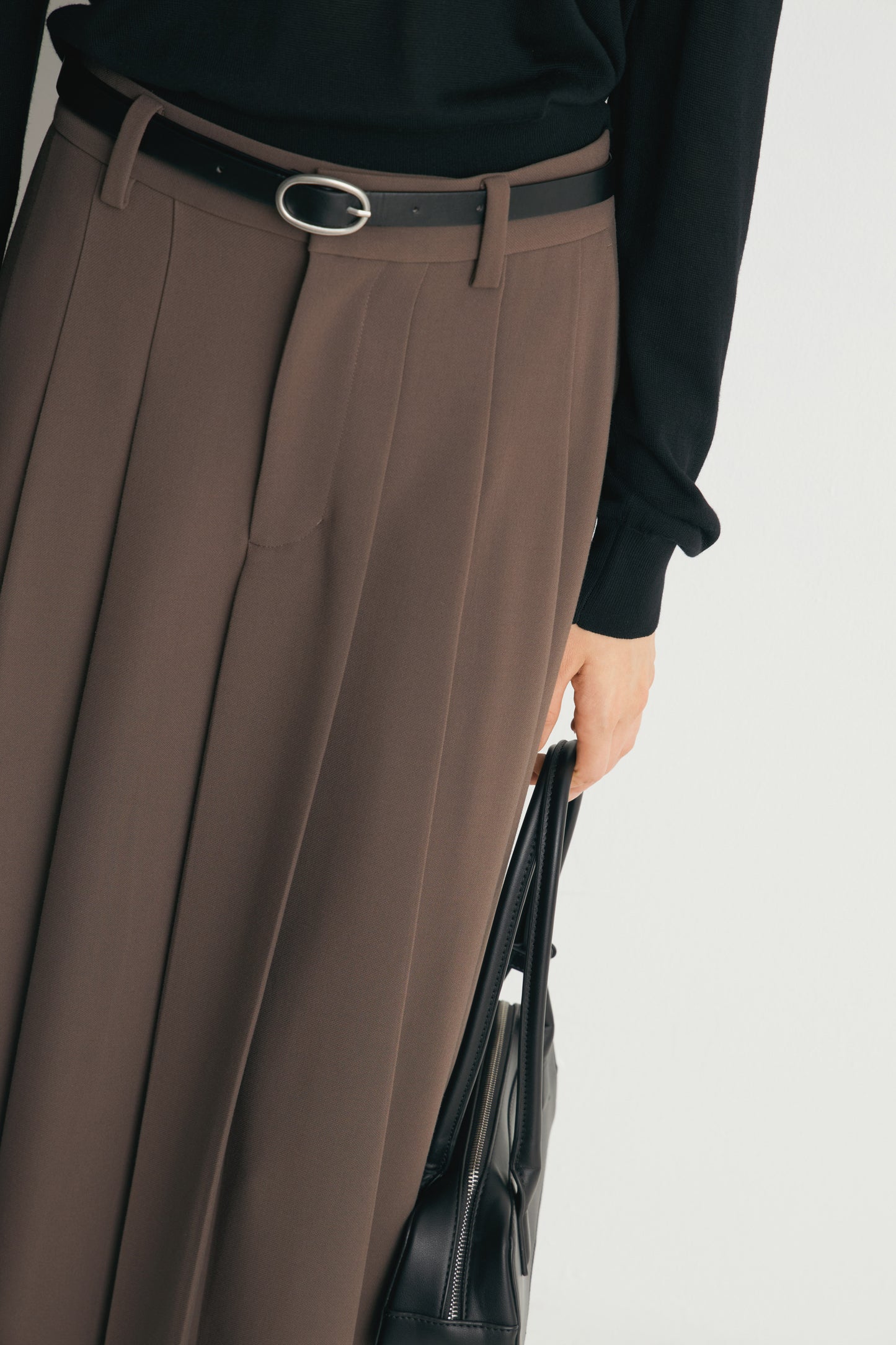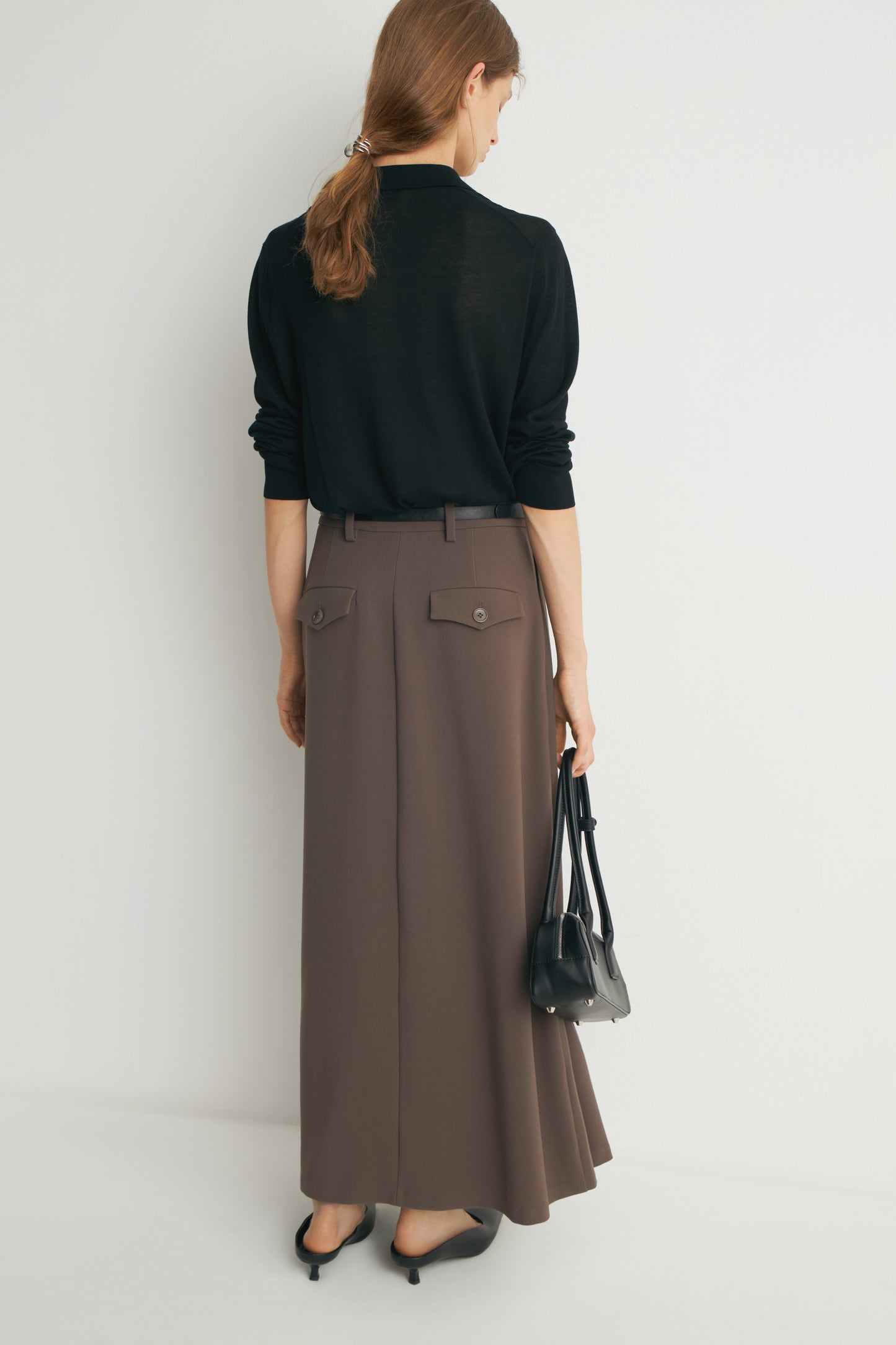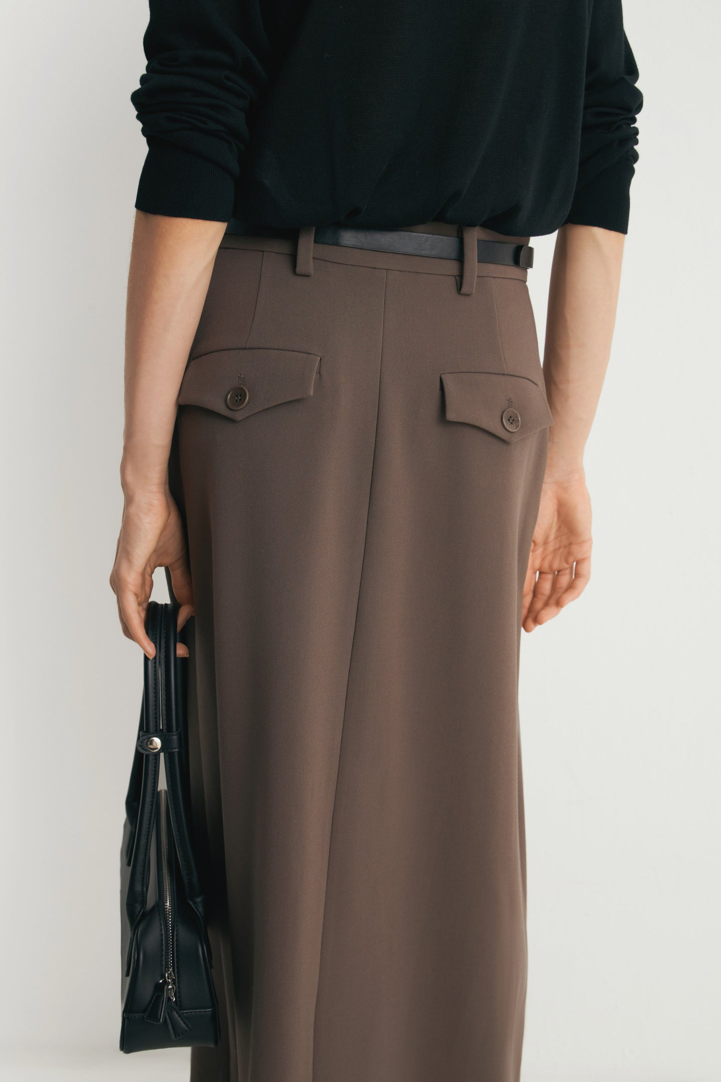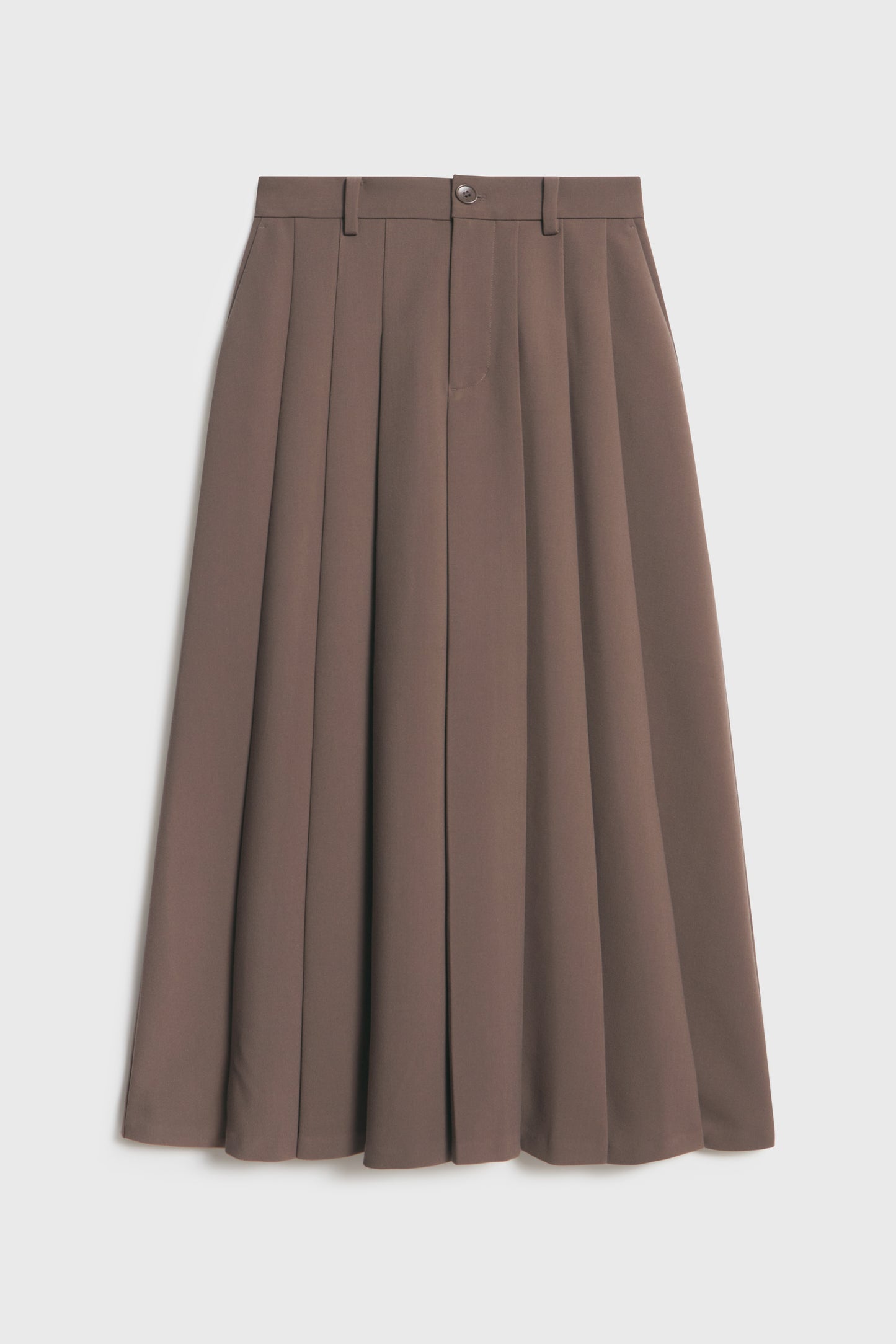 Ankle-length, flared skirt with pleats on the front. Side pockets and back fake flaps. Zip and button fastening.