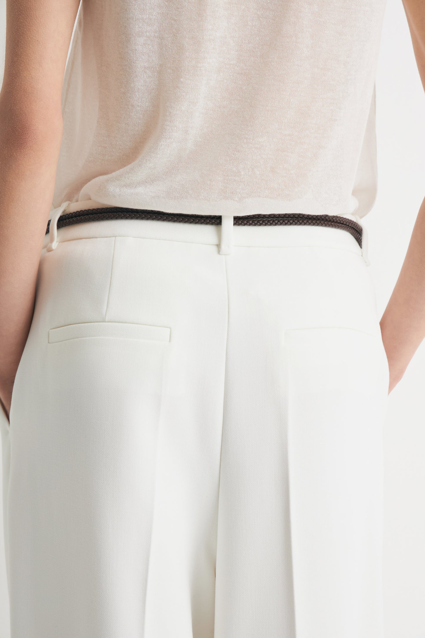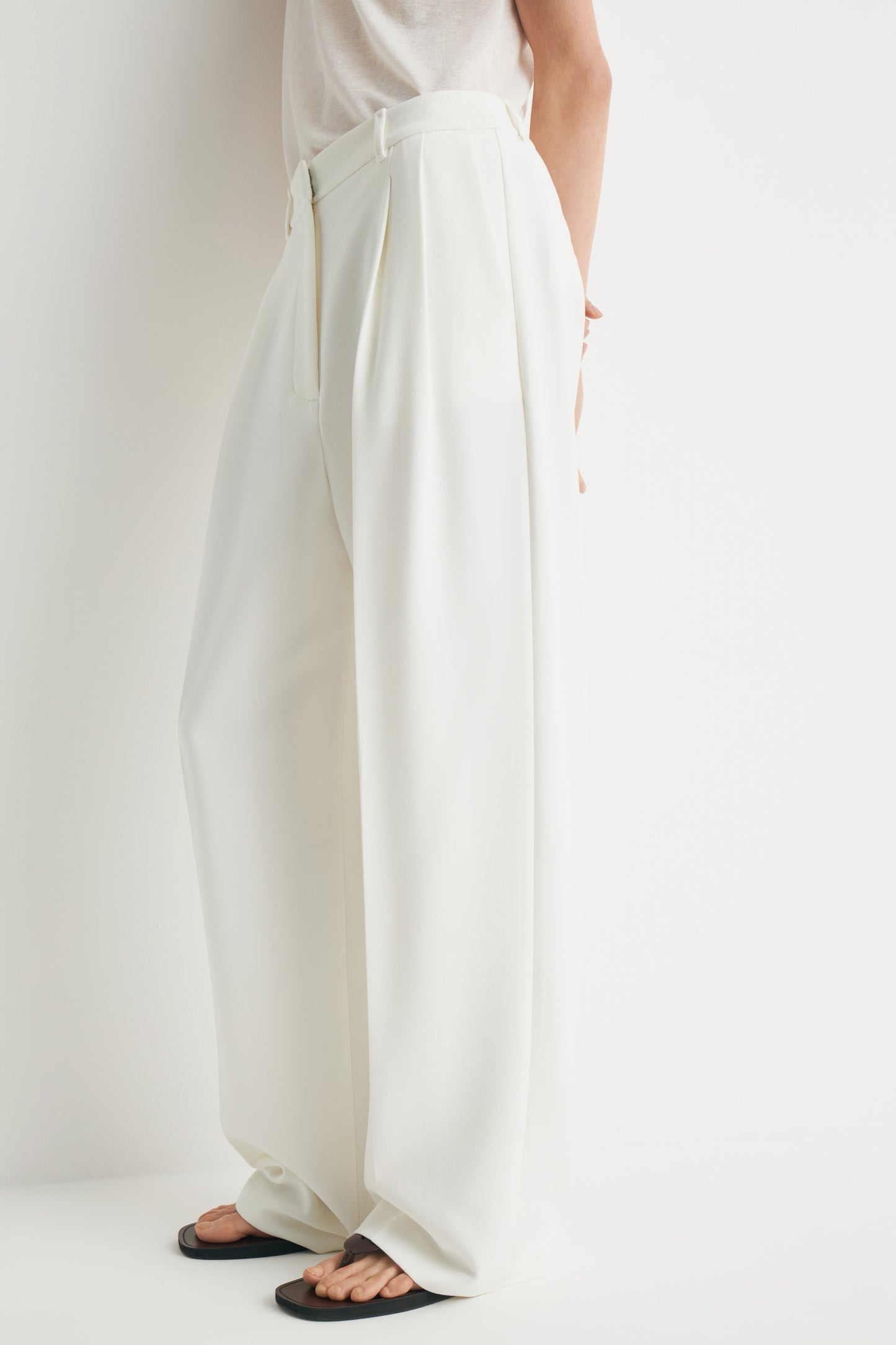 Trousers with front pleats. Straight-leg design. Featuring front pockets and rear welt pockets. Front zip fly, button and metal hook fastening.