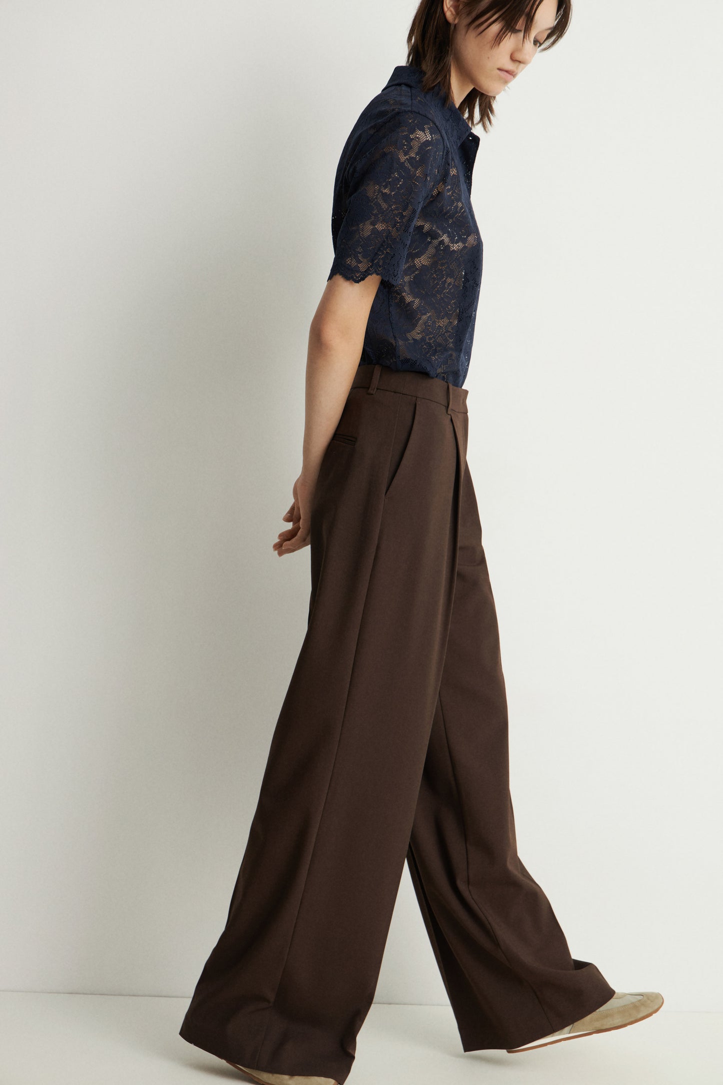 Trousers with pleats. Front pockets and back welt pockets. Straight-leg design. Front zip fly, top button and metal hook fastening.
