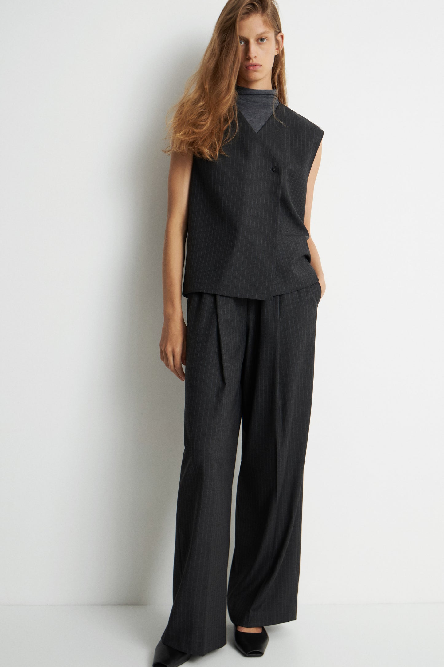 Straight trousers made of a viscose blend yarn with some wool. Drawstring at waistband. Side pockets. Pleat detail and pressed front crease.