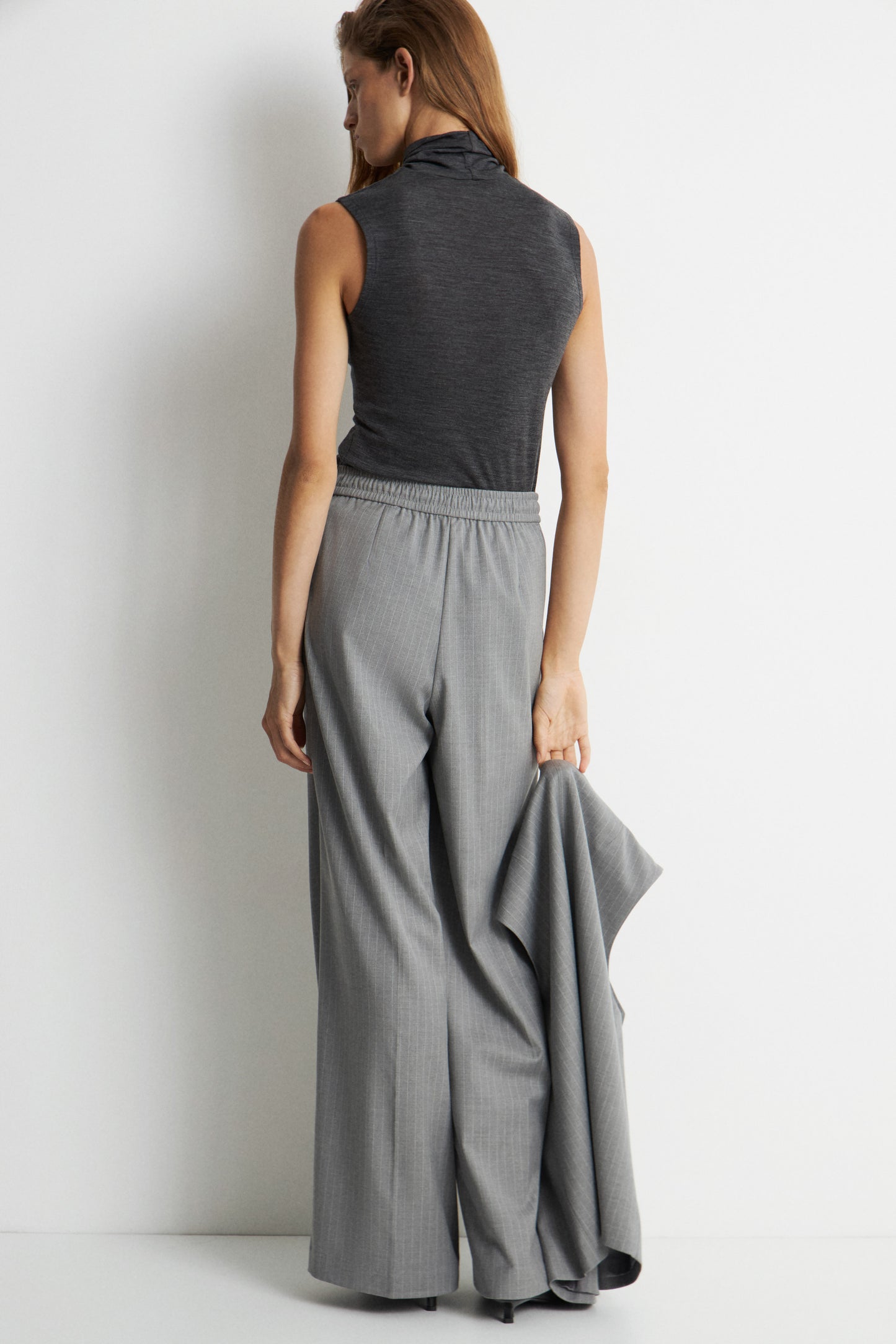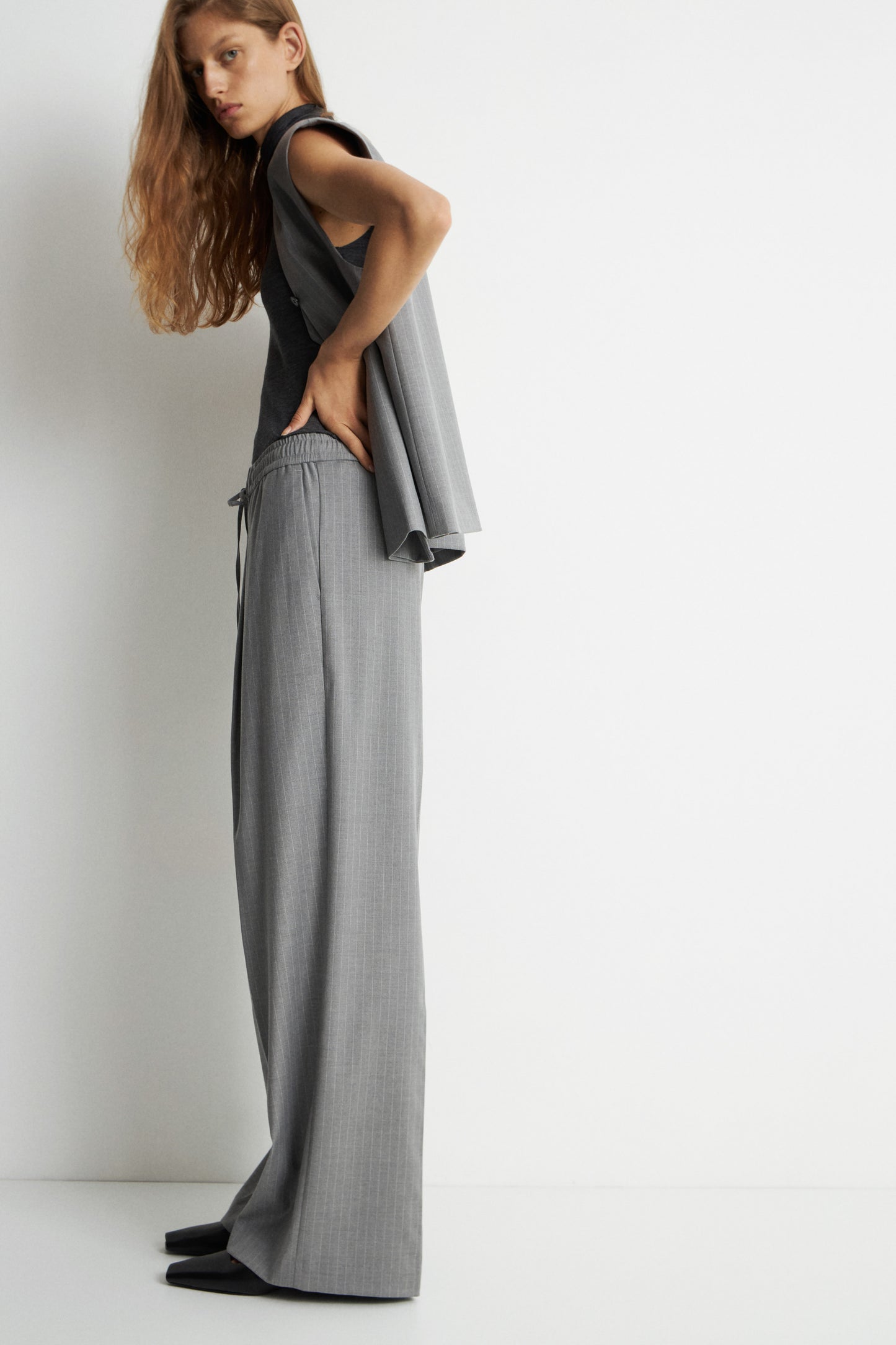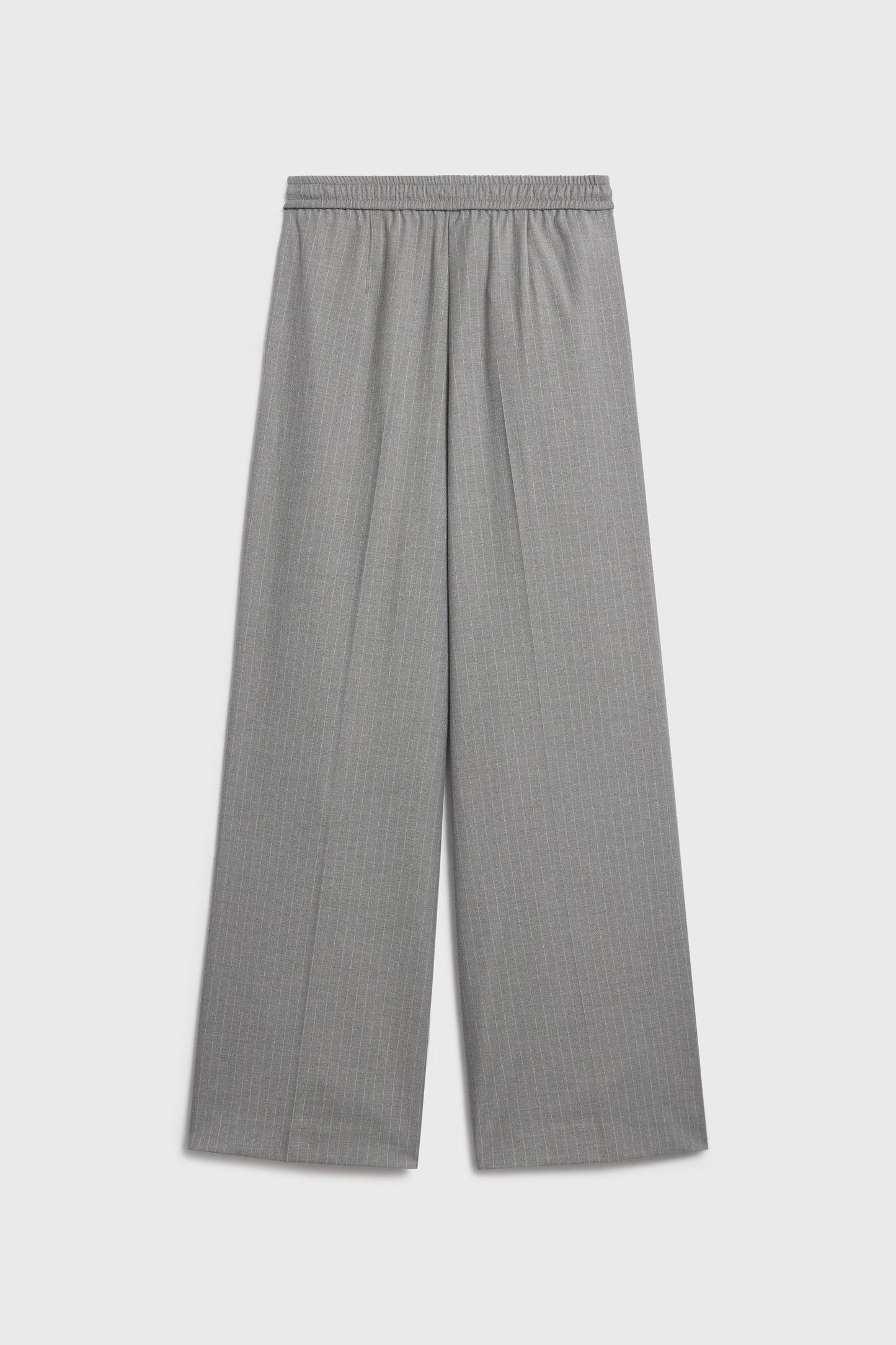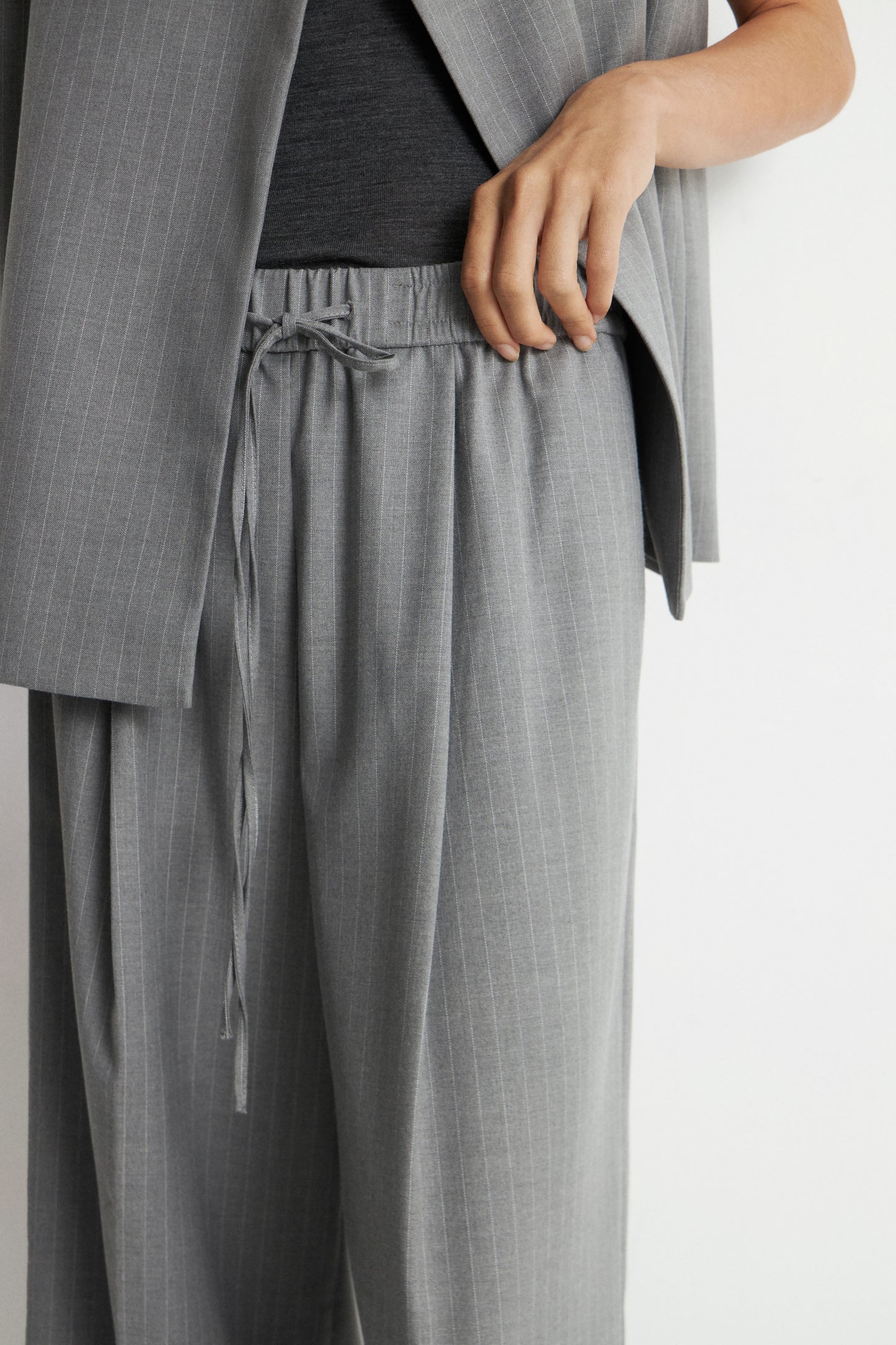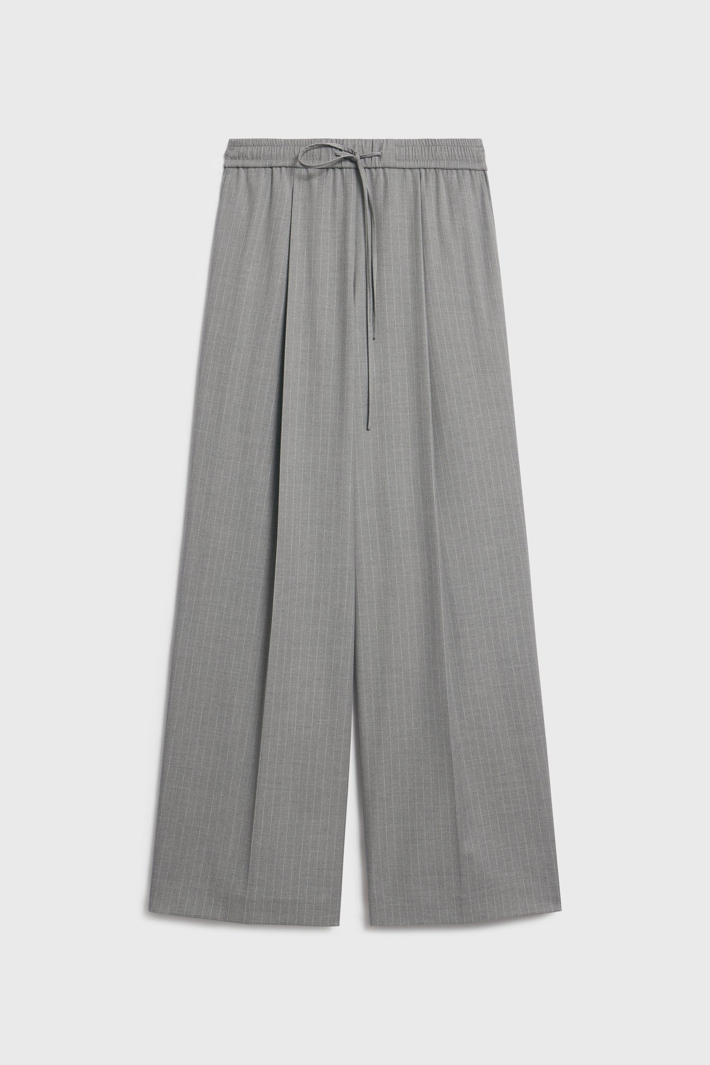 Straight trousers made of a viscose blend yarn with some wool. Drawstring at waistband. Side pockets. Pleat detail and pressed front crease.