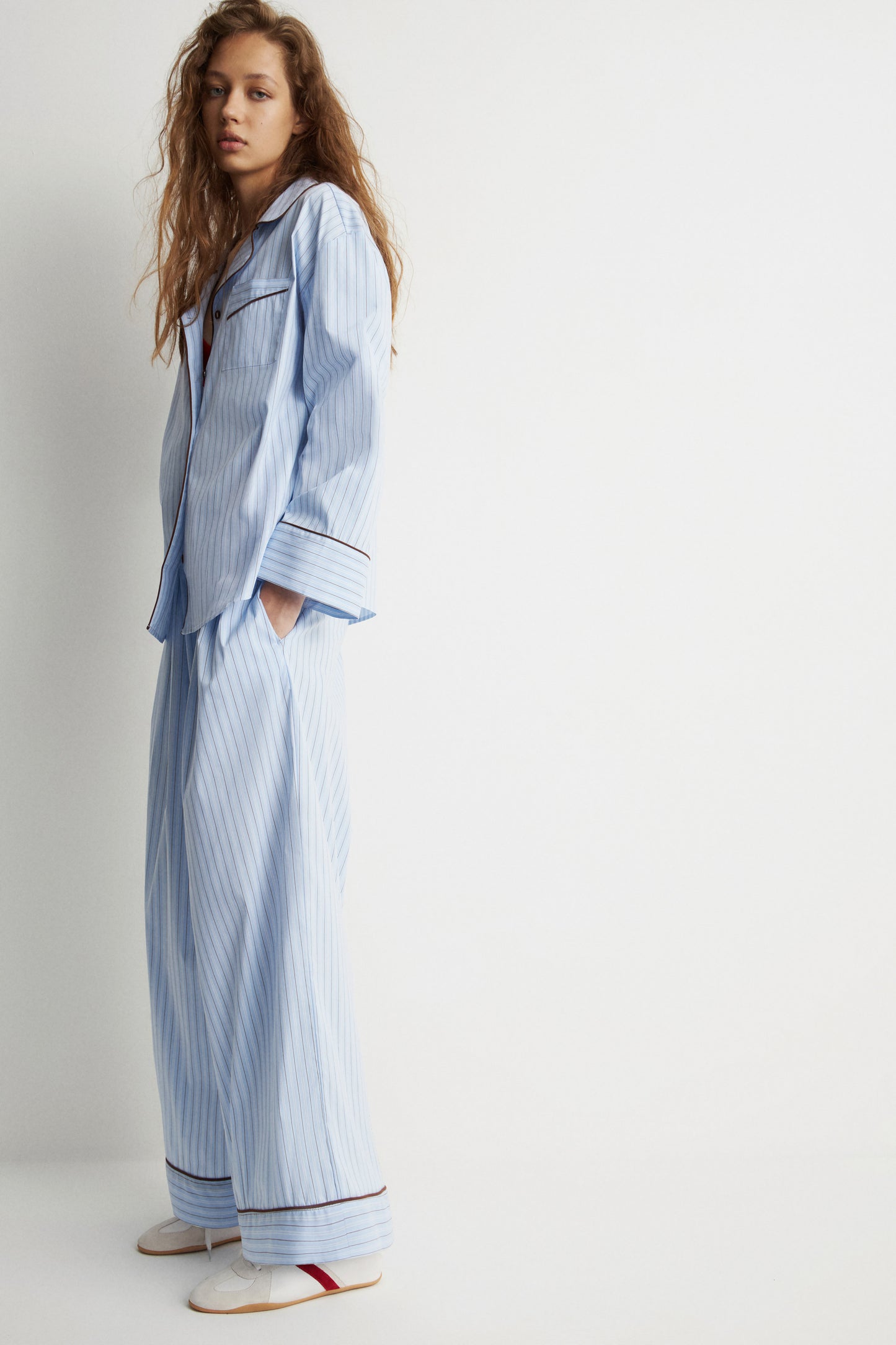Loose-fit trousers in striped cotton blend fabric. Oversized silhouette. Contrast trims and fake fly with covered buttons. Side pockets, pleats at front of elasticized waistband for added freedom of movement.