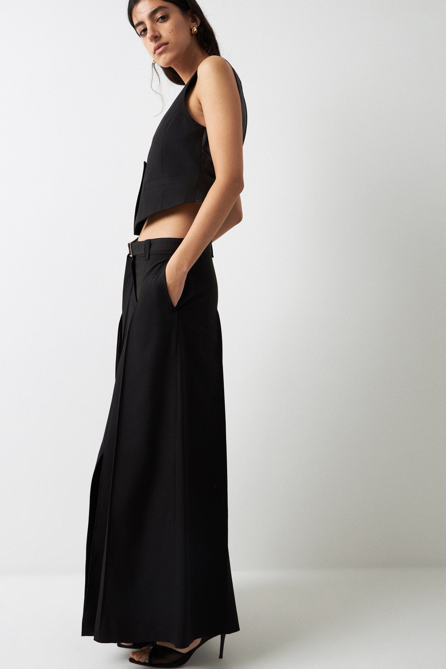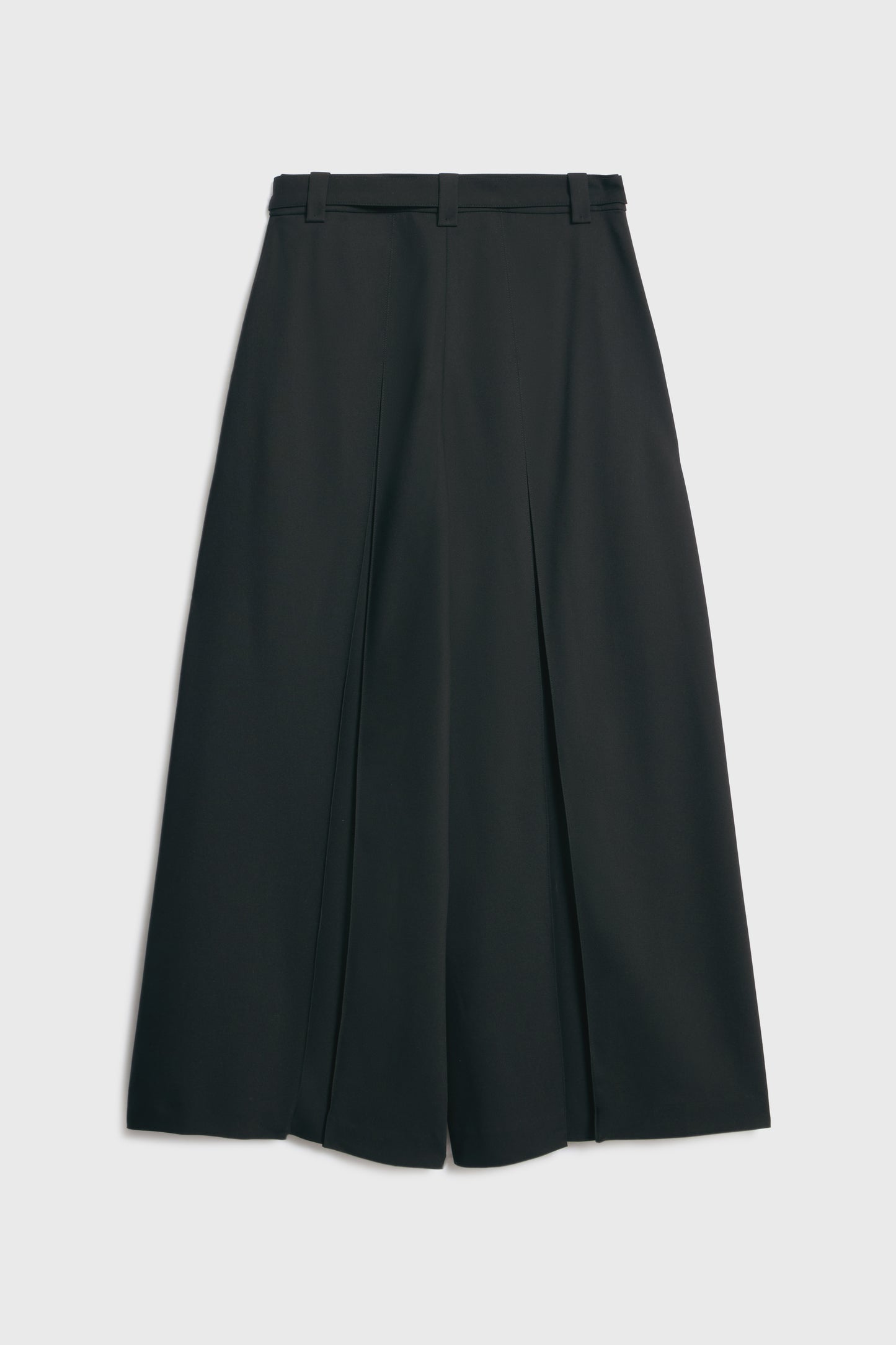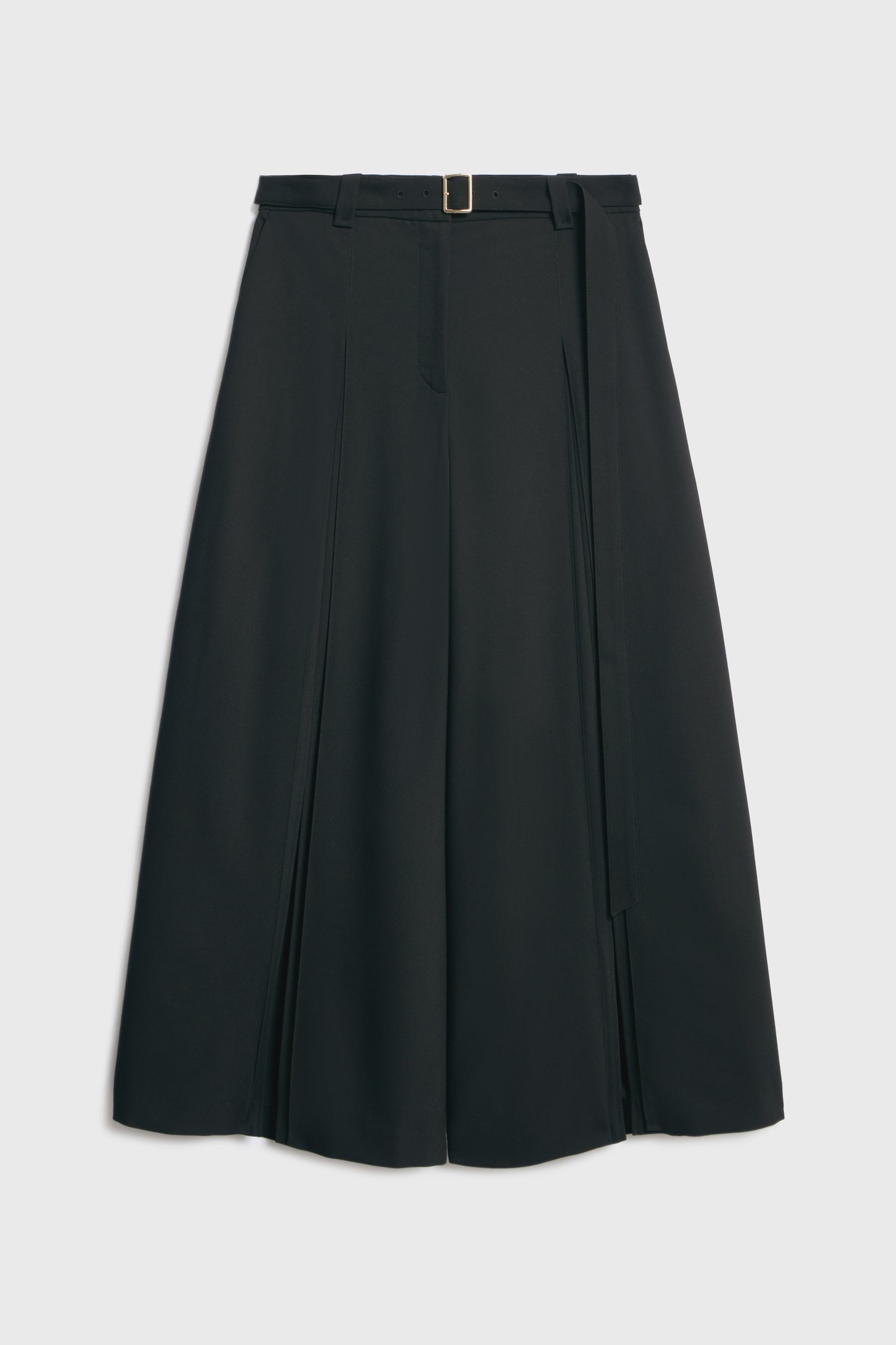 Full-length trousers with box pleats. Wide-leg design. Front pockets. Matching belt with metal buckle. Front zip fly, button and hook fastening. Crafted with some wool and lyocell.