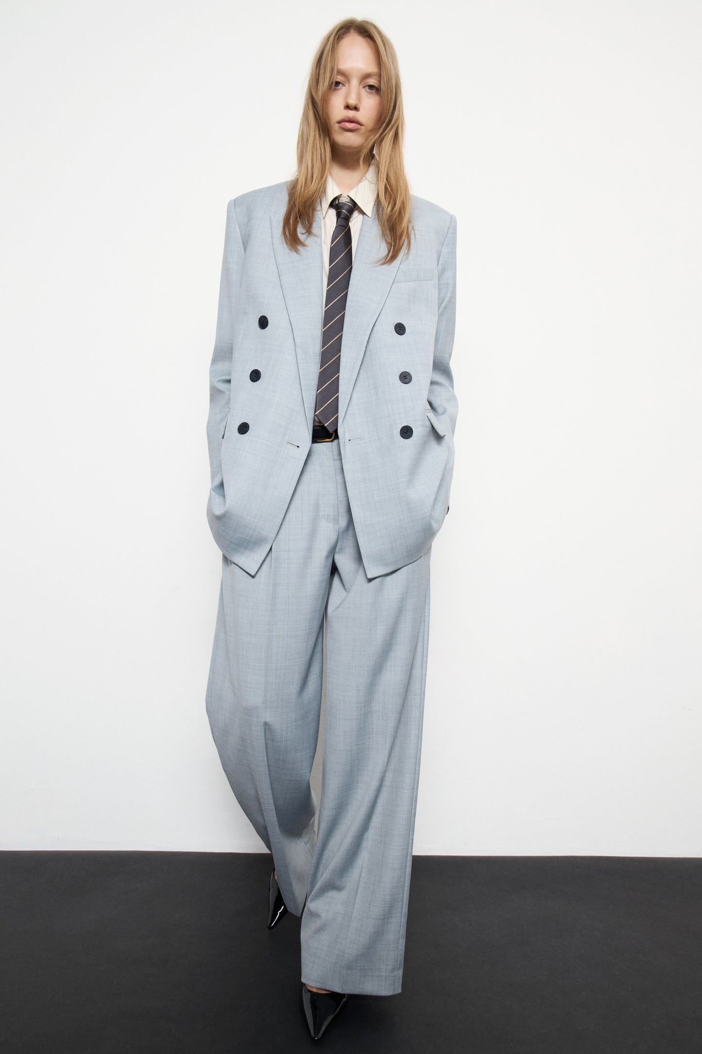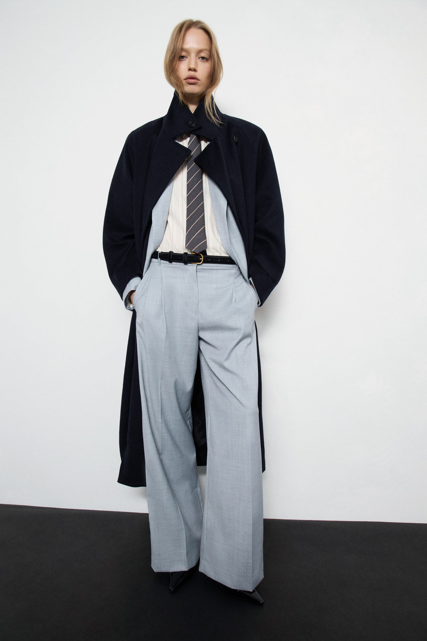 Trousers with darts in a wool blend fabric. Wide-leg design. Featuring front pockets and rear welt pockets. Front zip fly, button and metal hook fastening.