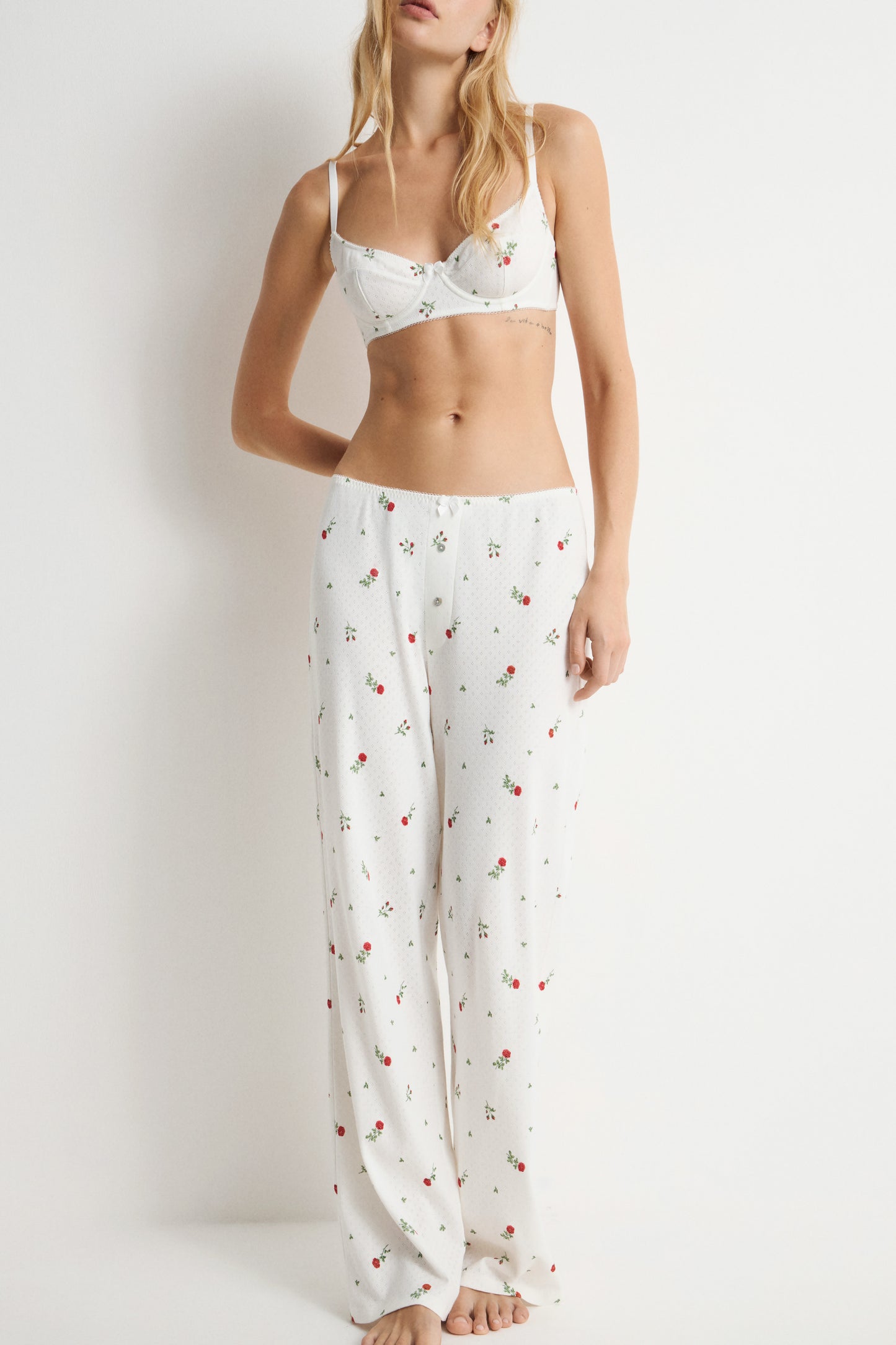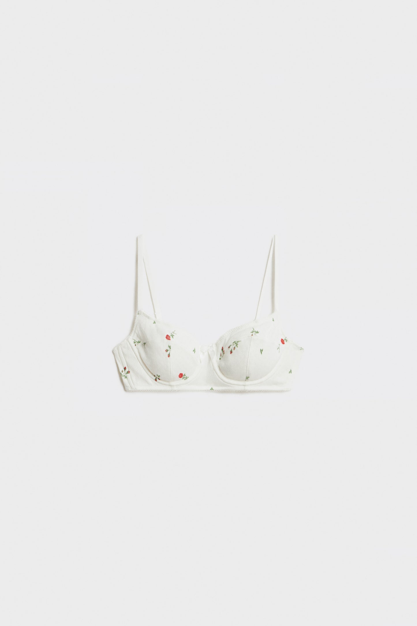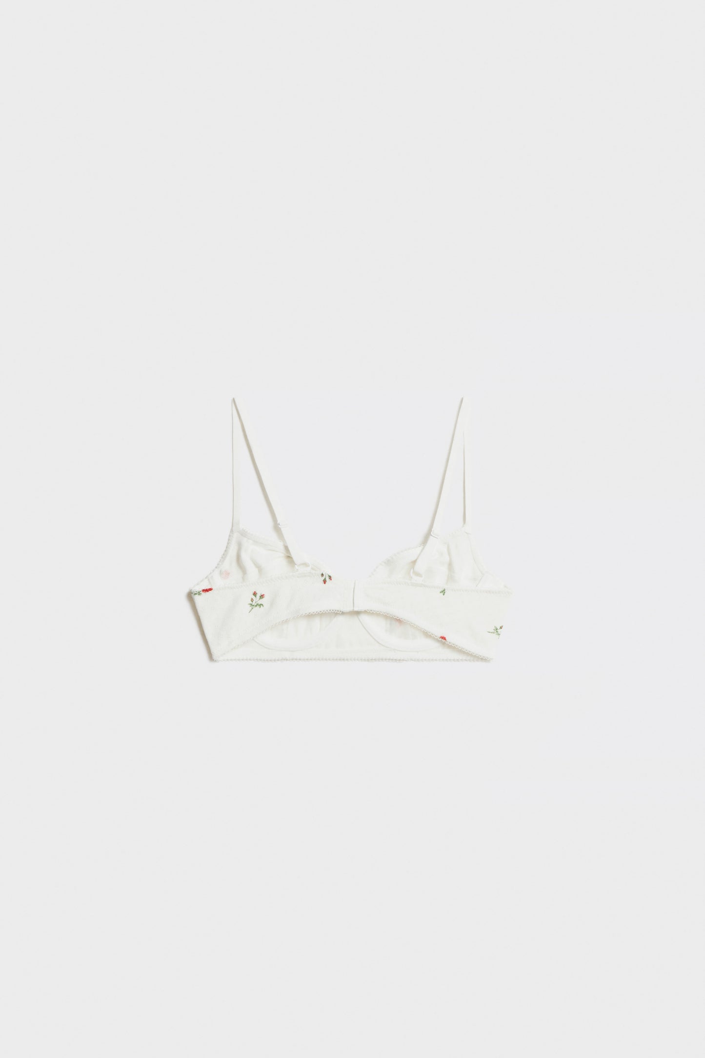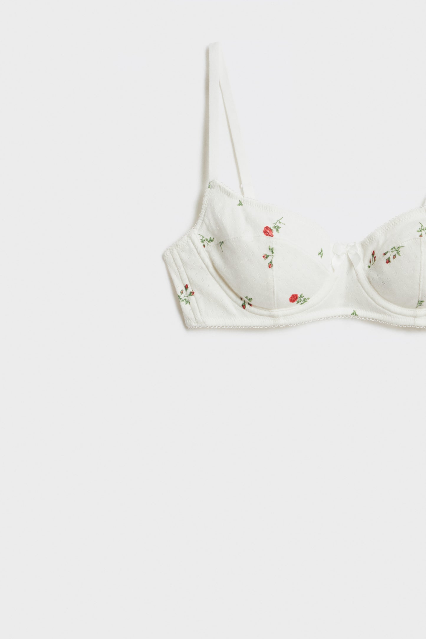 Non-padded bra in supersoft pointelle jersey cotton with cups that give the bust a natural shape and light support. Matching lace detail and contrasting combined bow appliqué. Adjustable shoulder straps and a hook-and-eye fastening at the back.