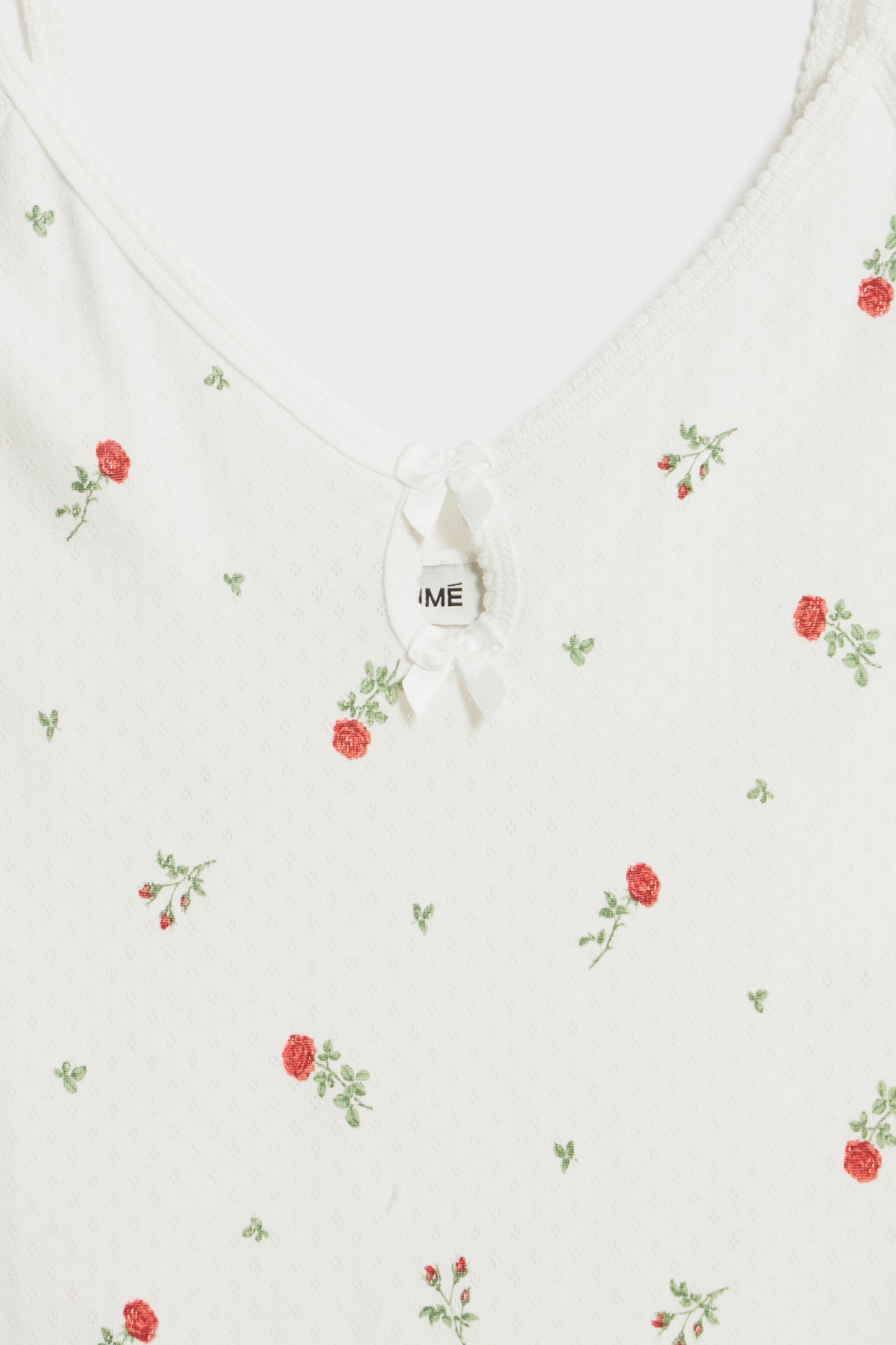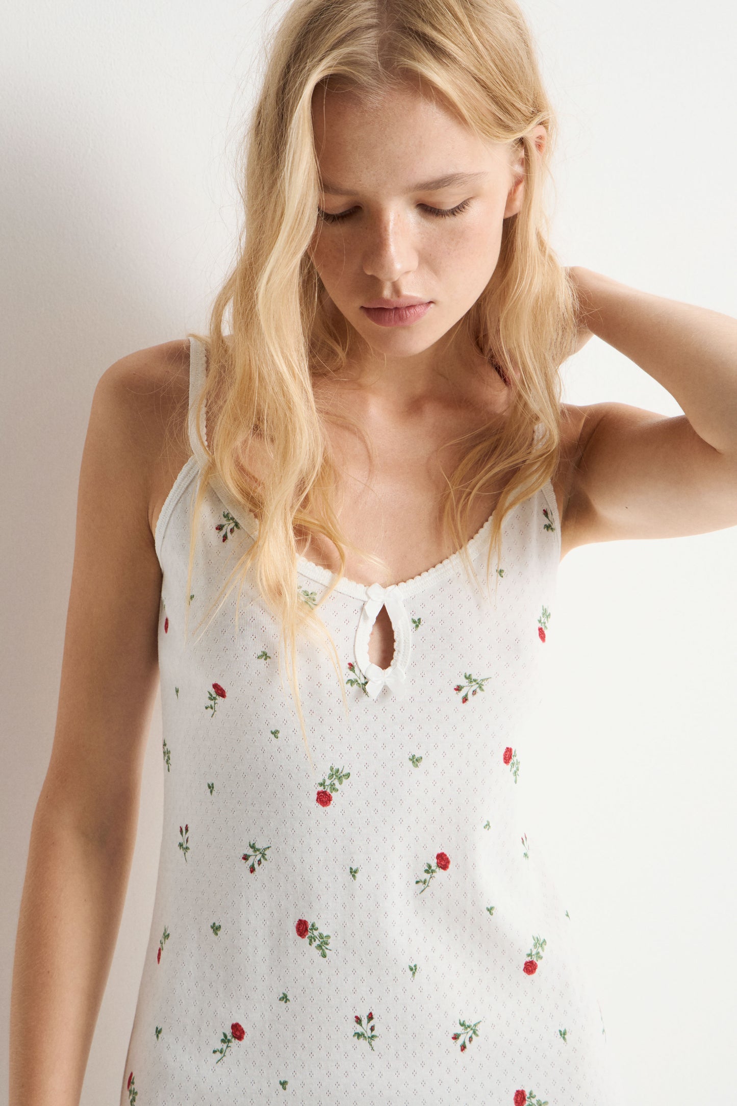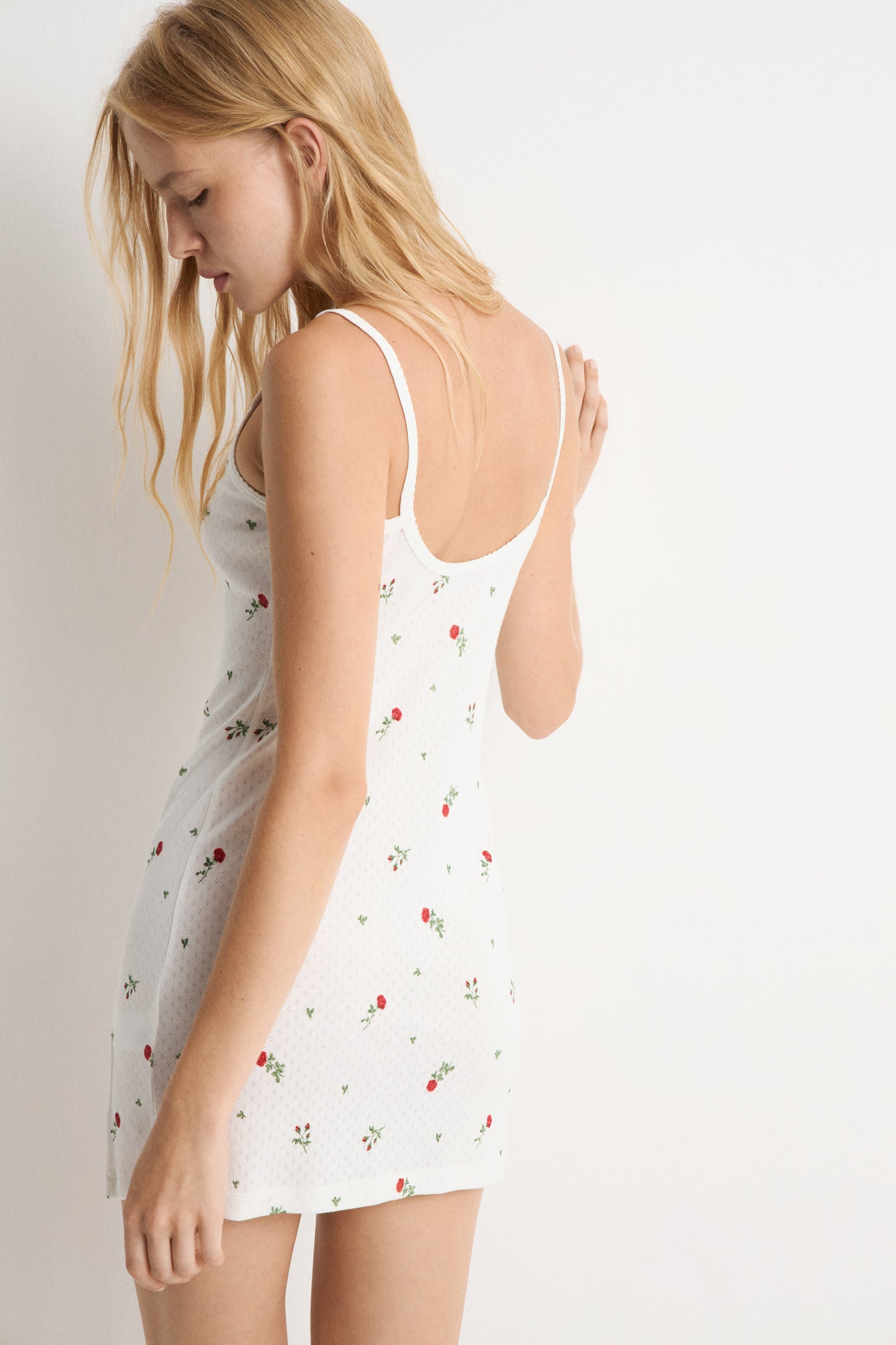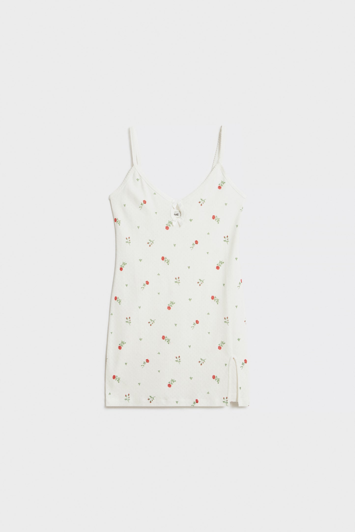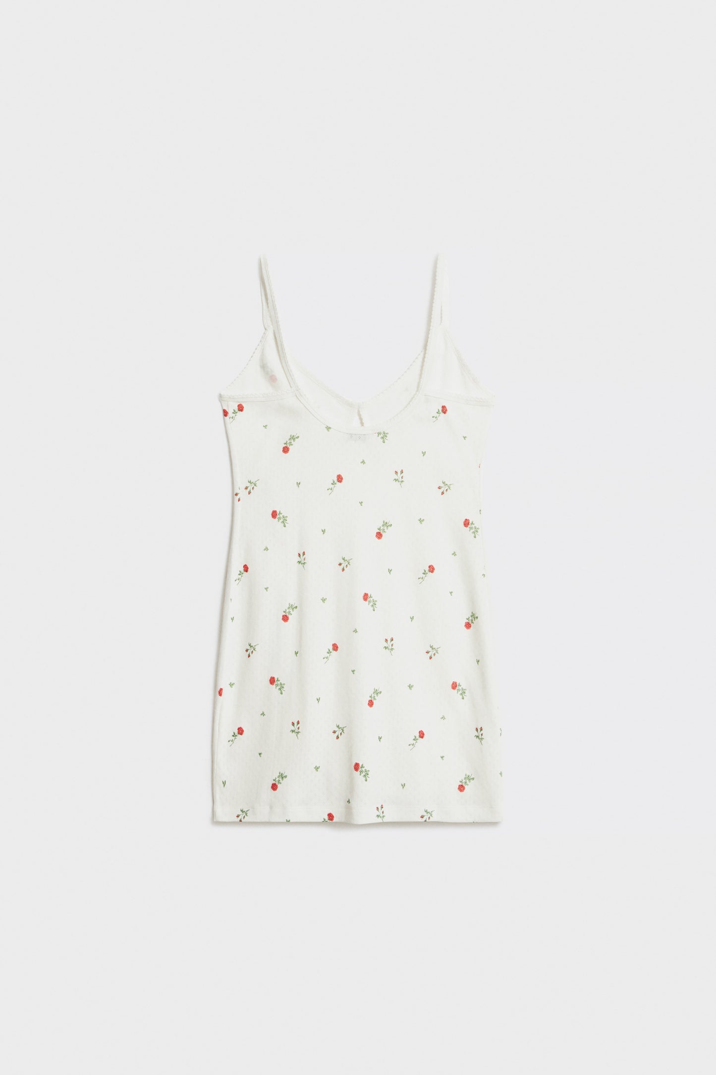 Fitted dress in supersoft pointelle jersey cotton with thin straps. Featuring a cut-out back section and slit. Small satin bow at front. Lace trim.