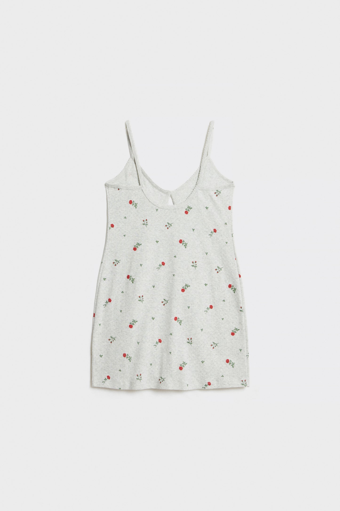 Fitted dress in supersoft pointelle jersey cotton with thin straps. Featuring a cut-out back section and slit. Small satin bow at front. Lace trim.