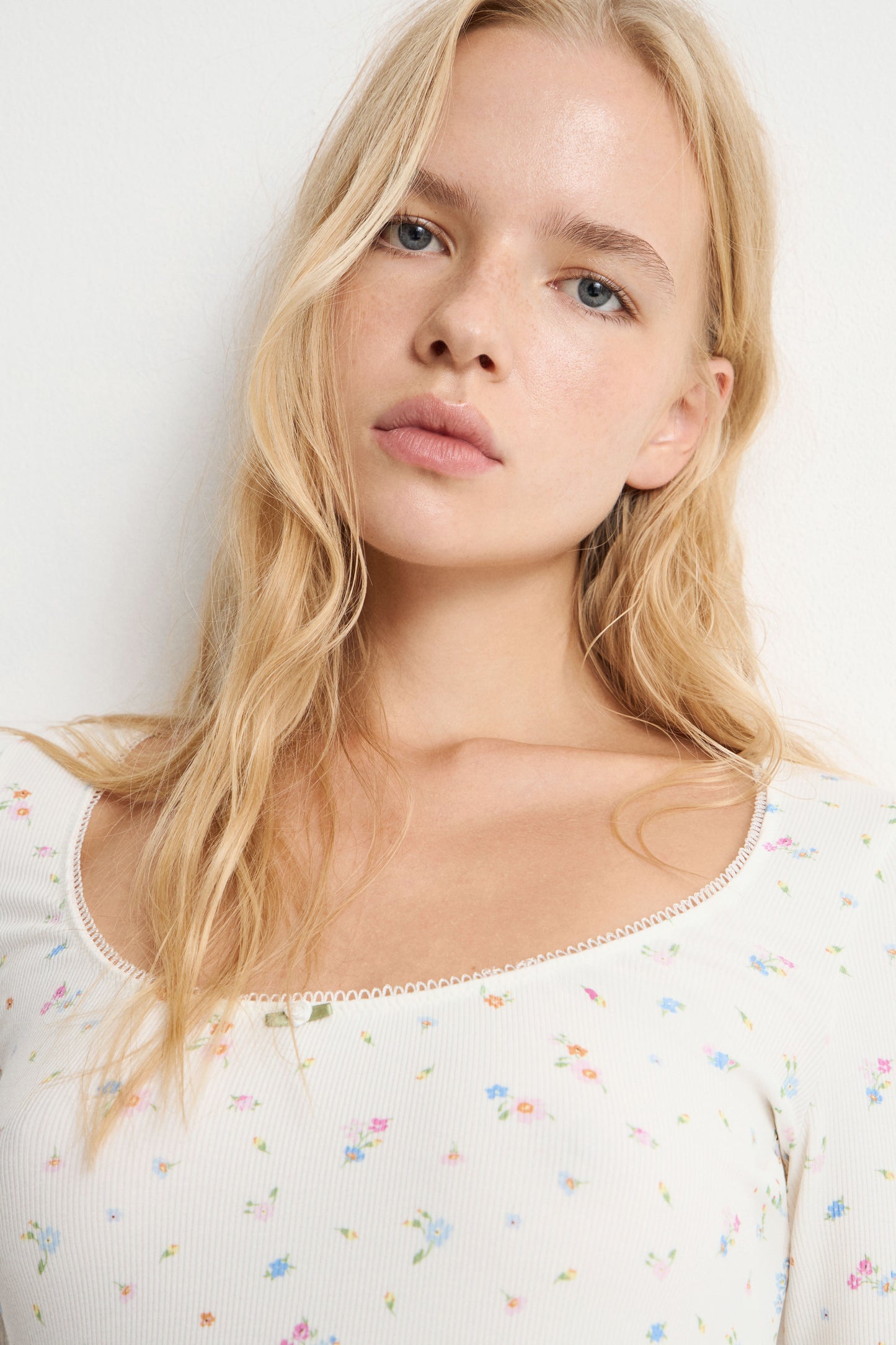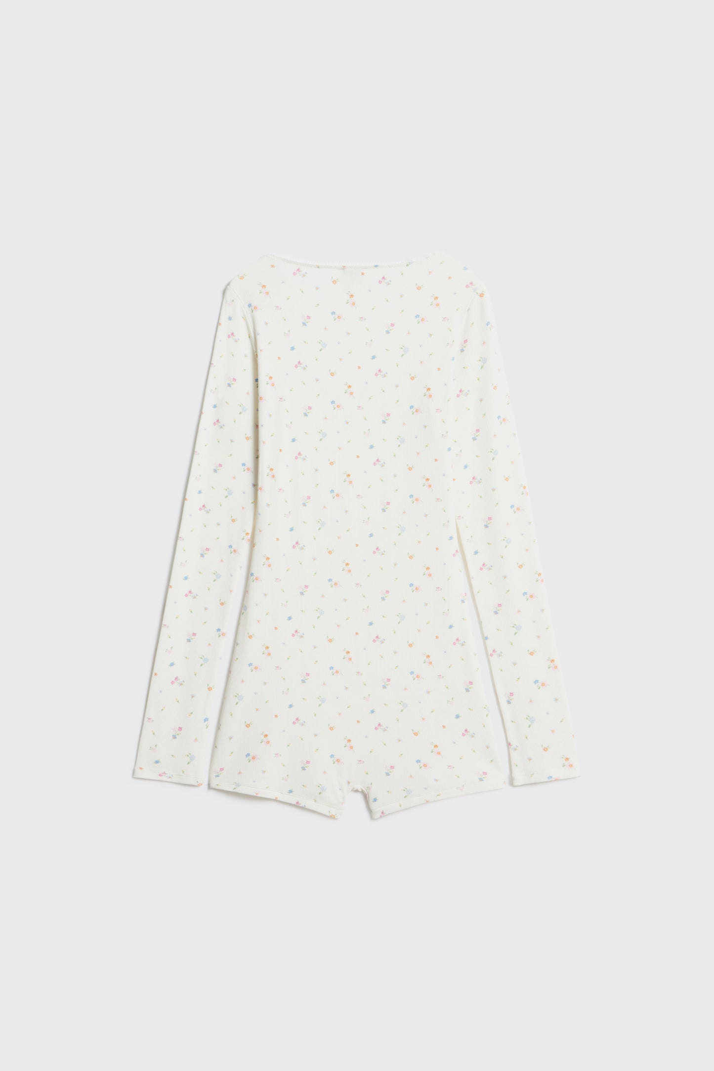 Fitted jumpsuit in soft modal jersey with a round neckline, long sleeves, short legs and a small, decorative satin rose at the front. Picot-trimmed edges.