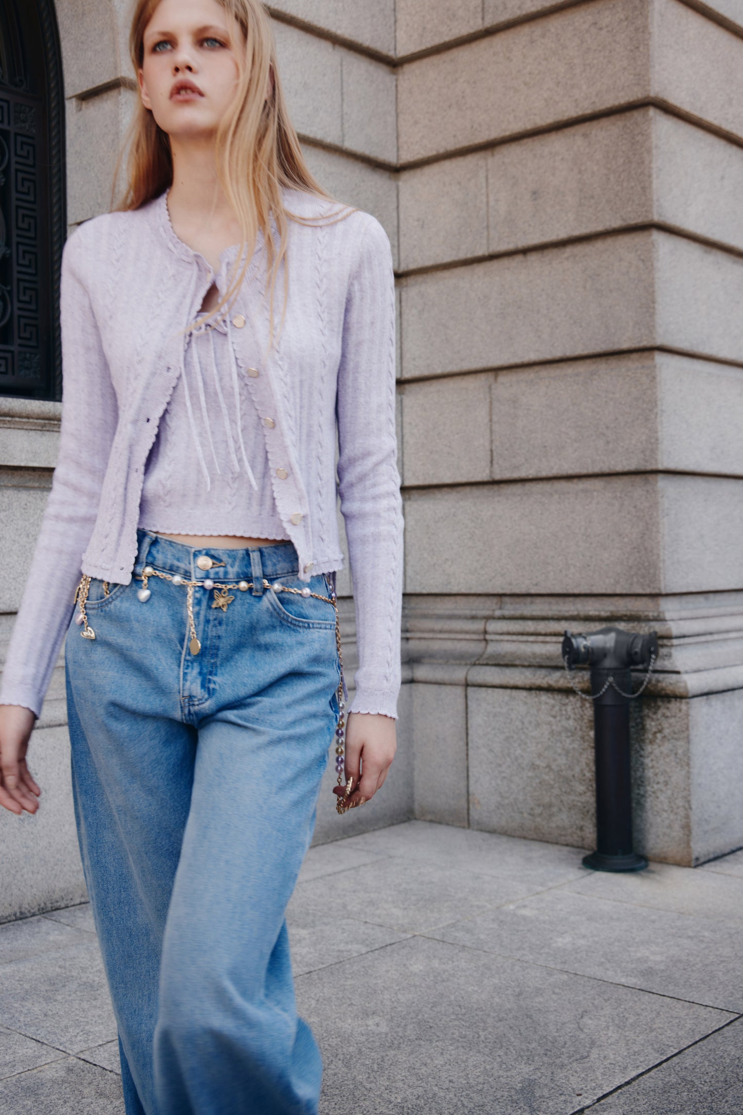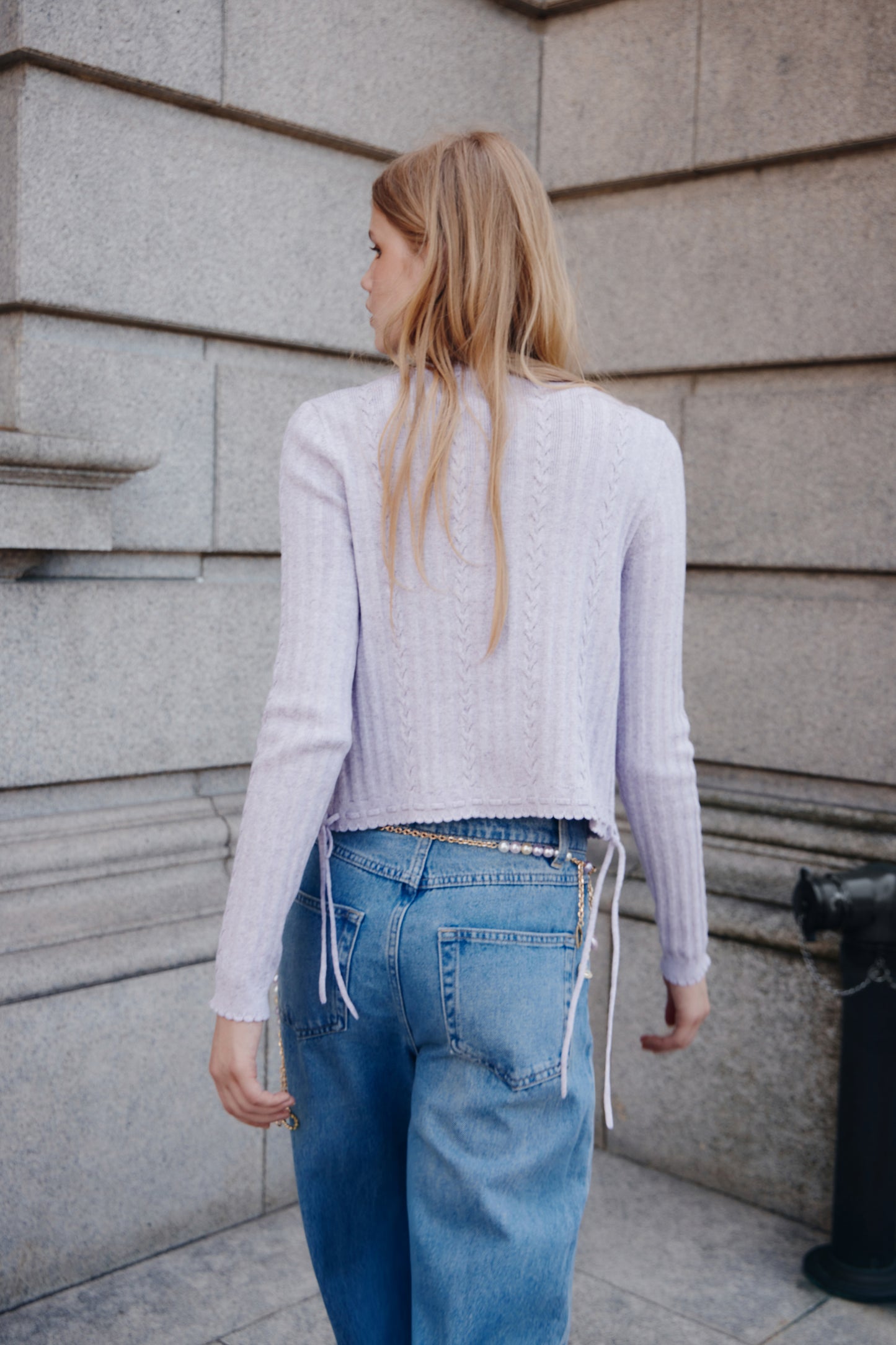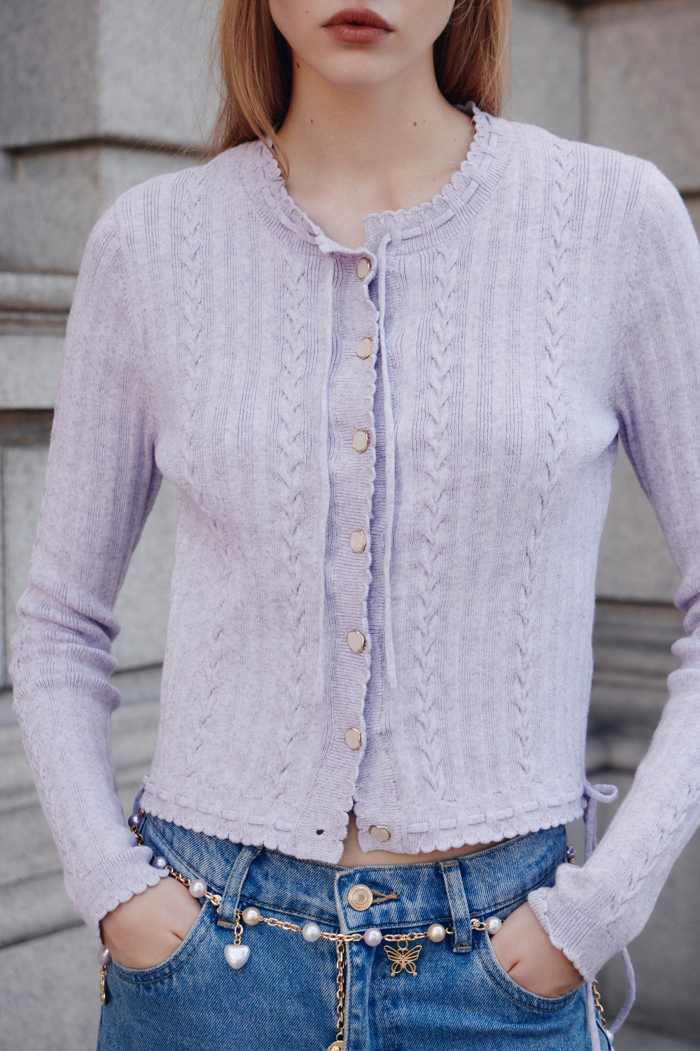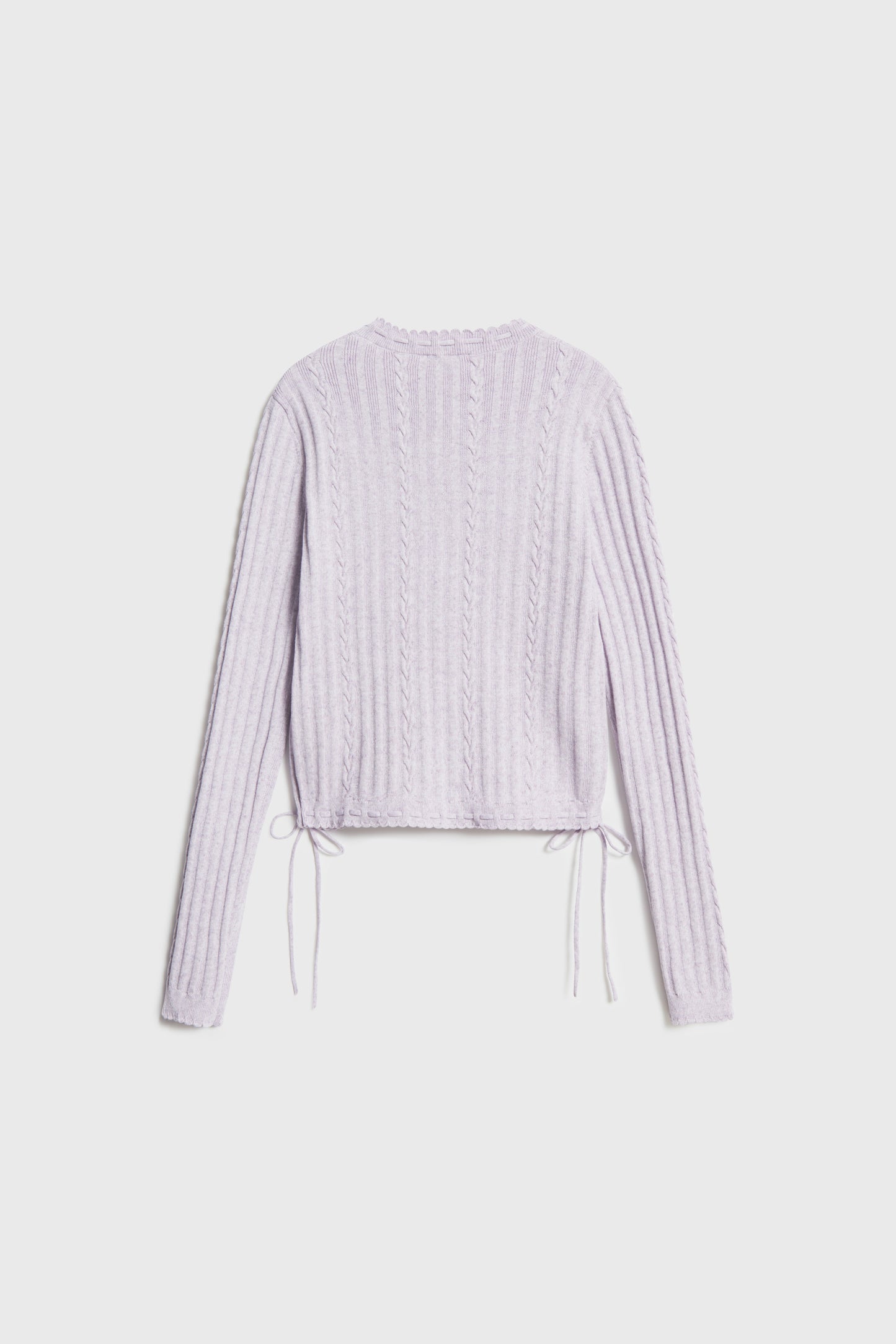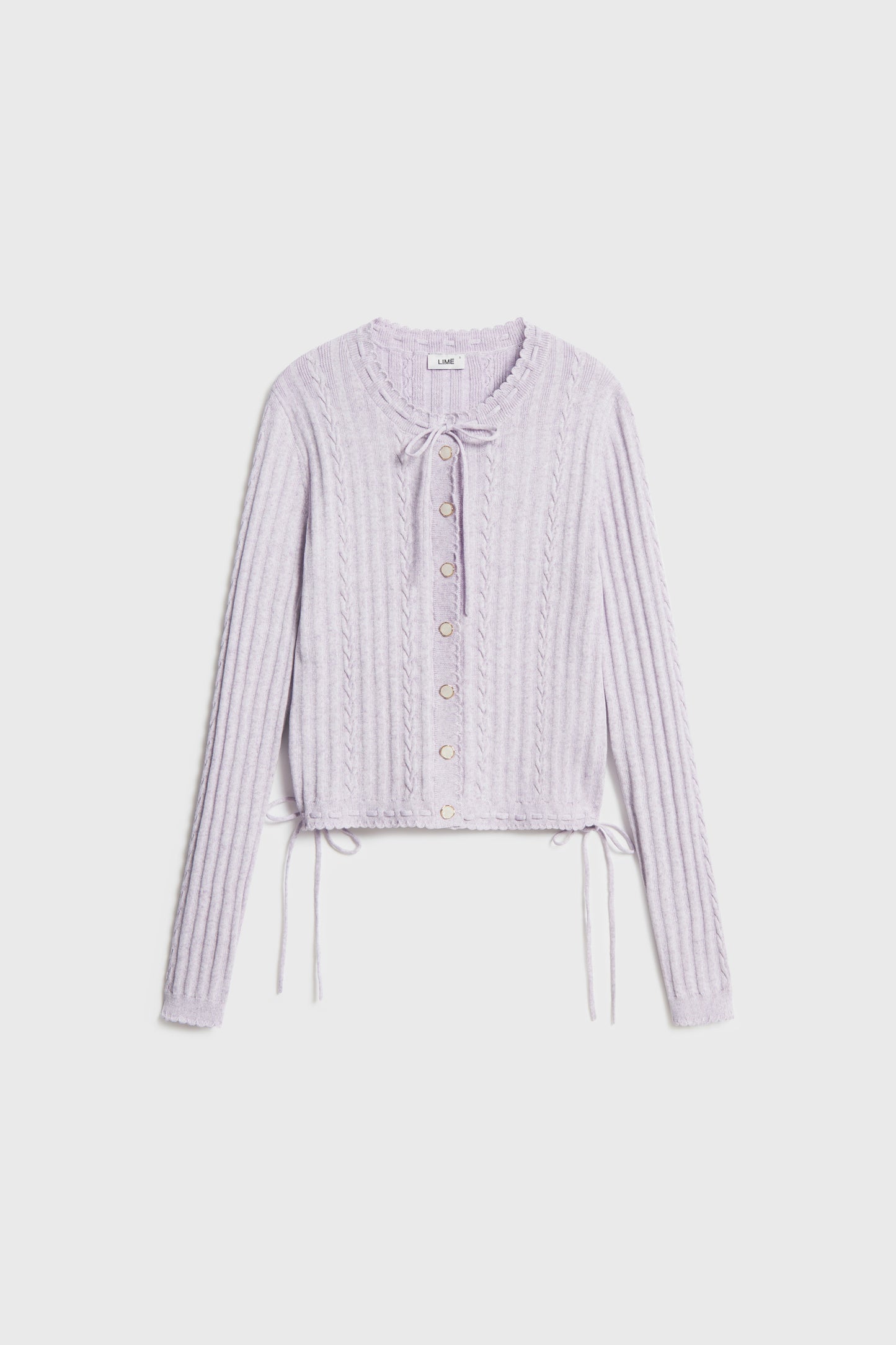 Cardigan in a soft textured knit with some linen. Round neck, metal pearly buttons, and long sleeves. Narrow ties at front and sides.