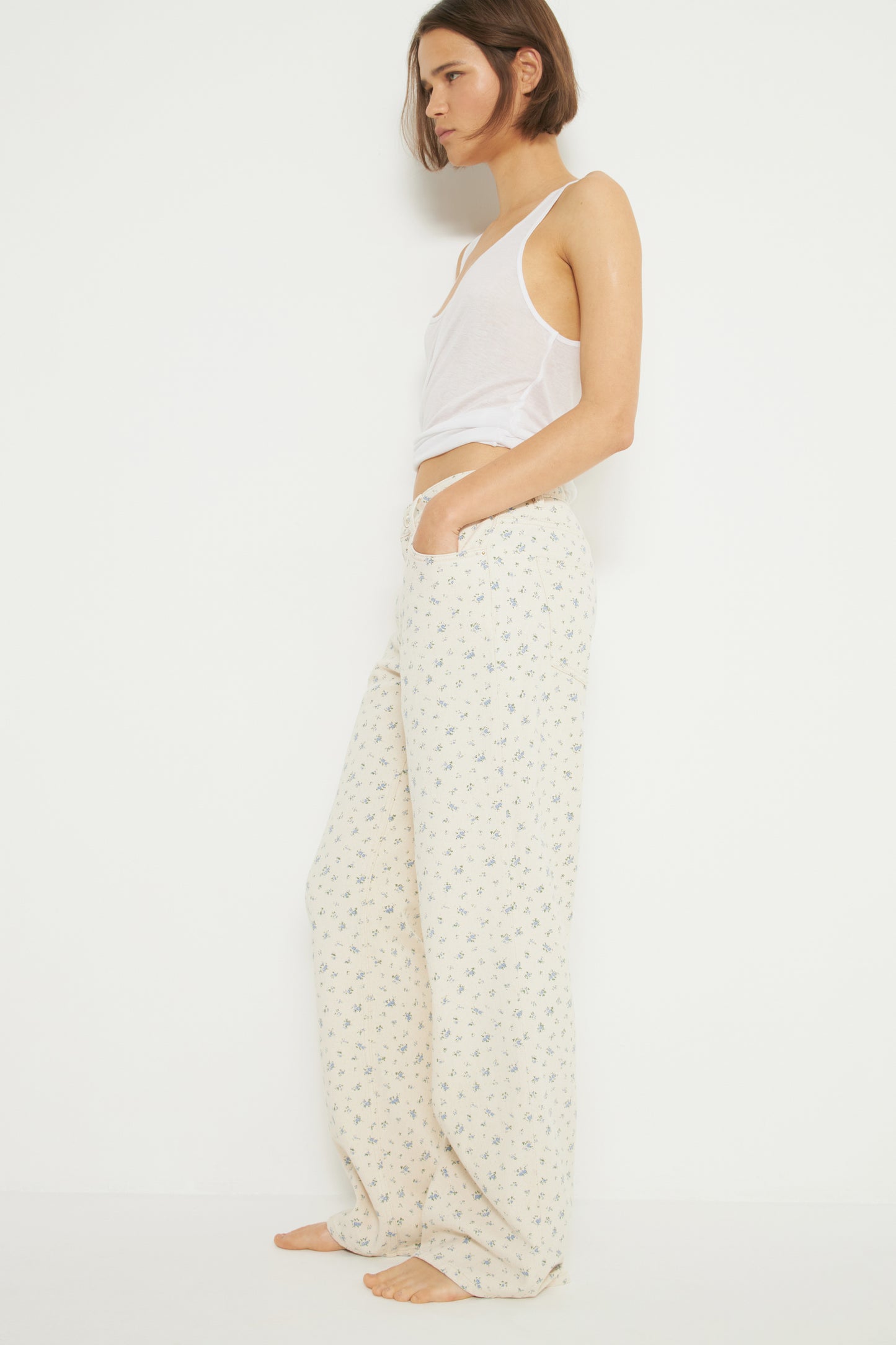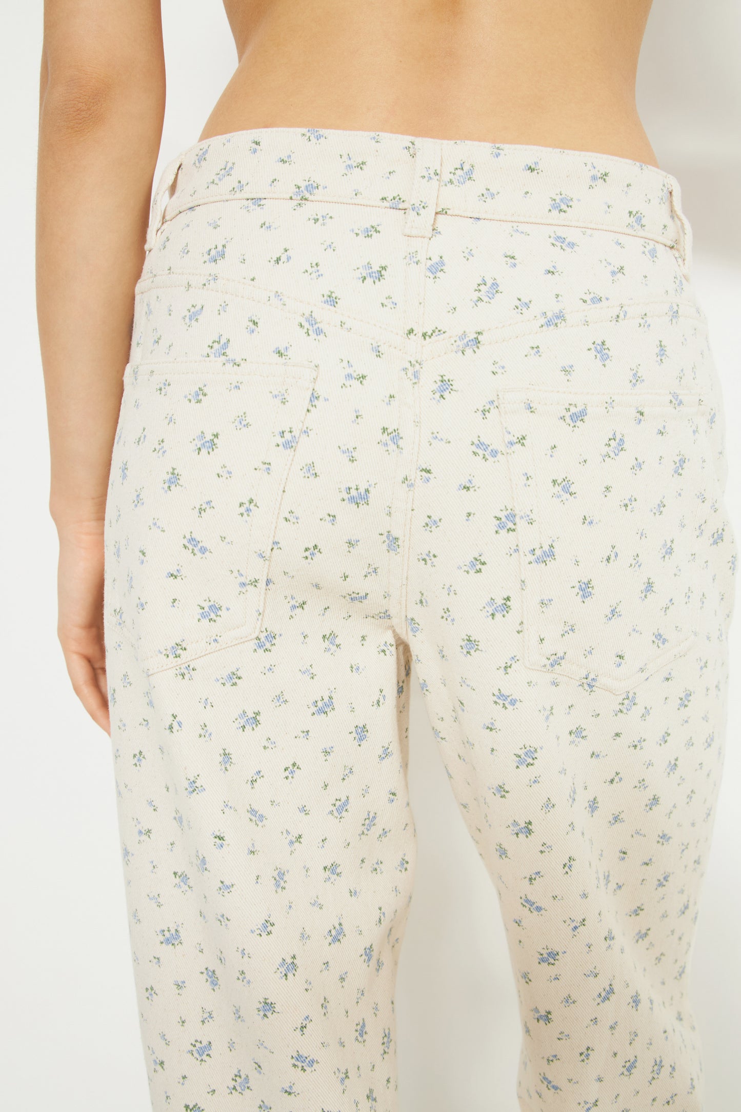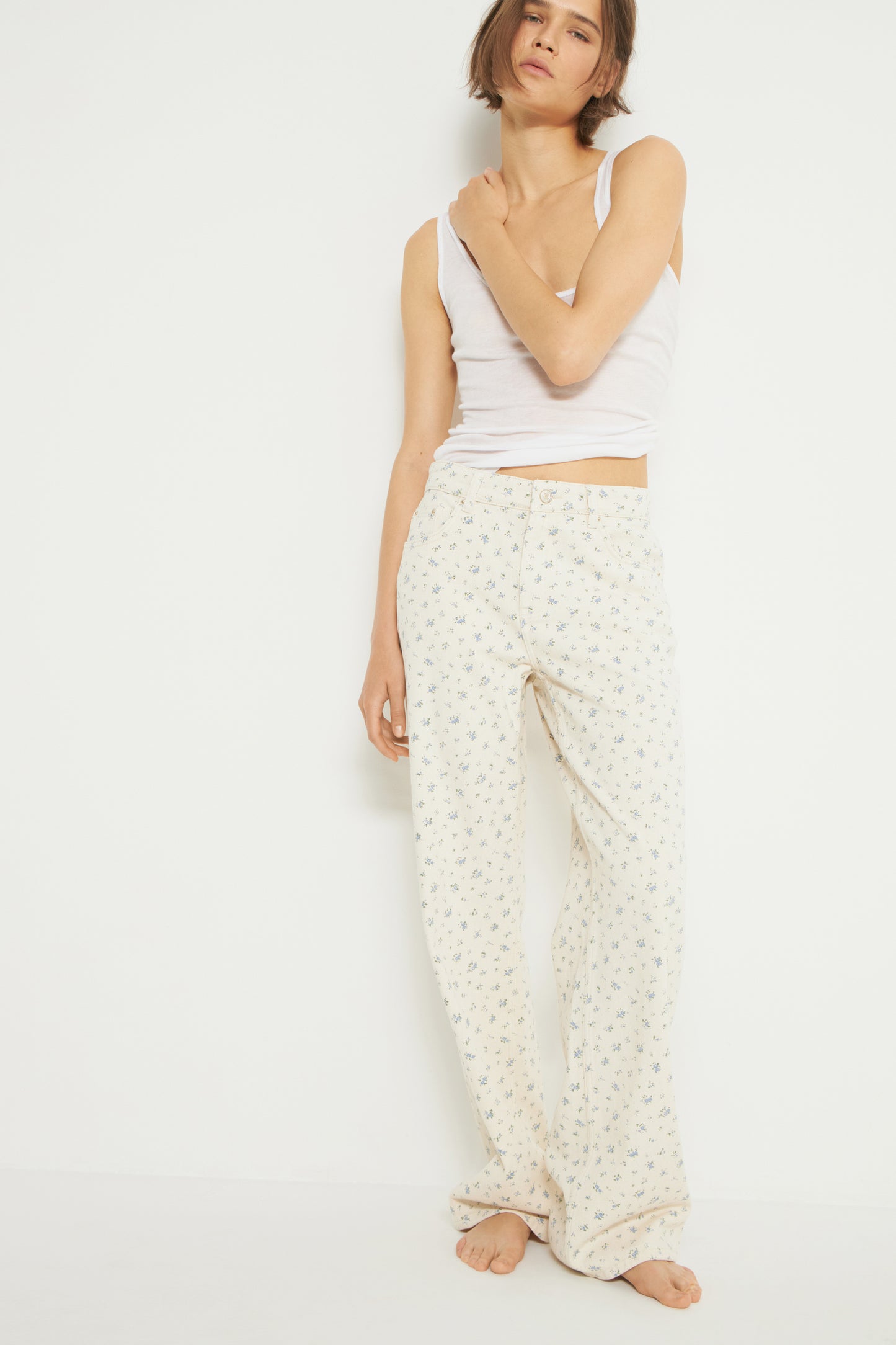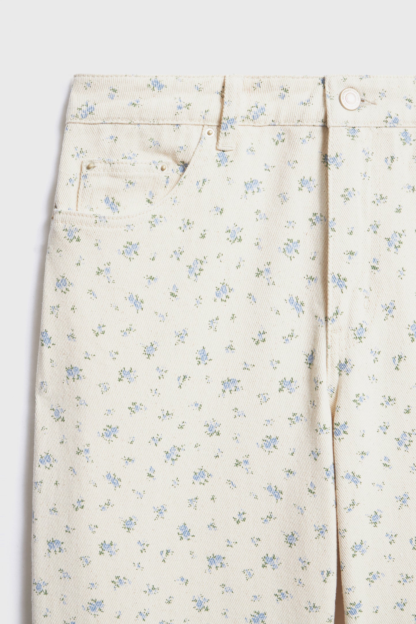 Mid-waist jeans with a five-pocket design in patterned denim. Straight leg. Front zip fly and metal button fastening.