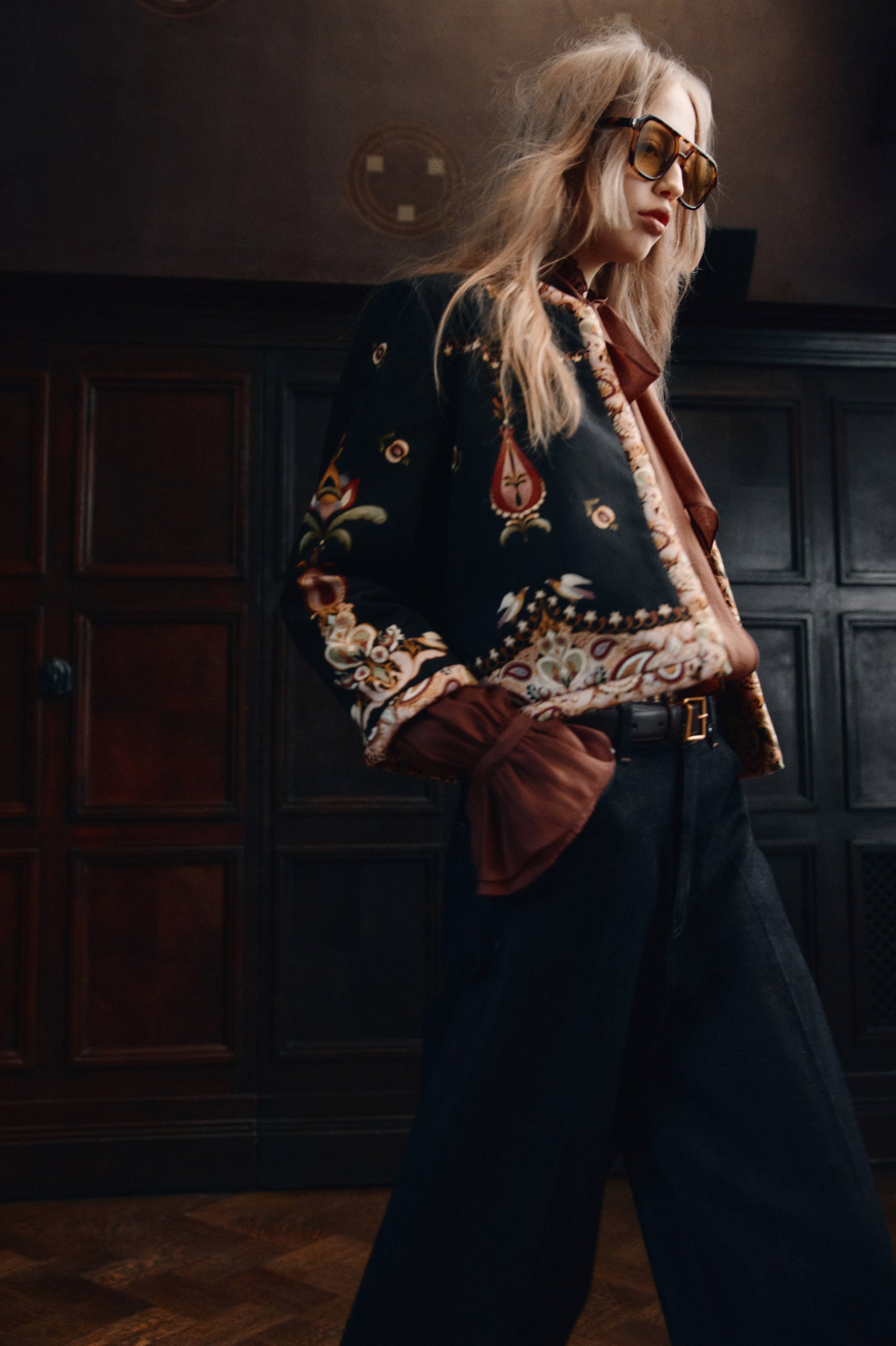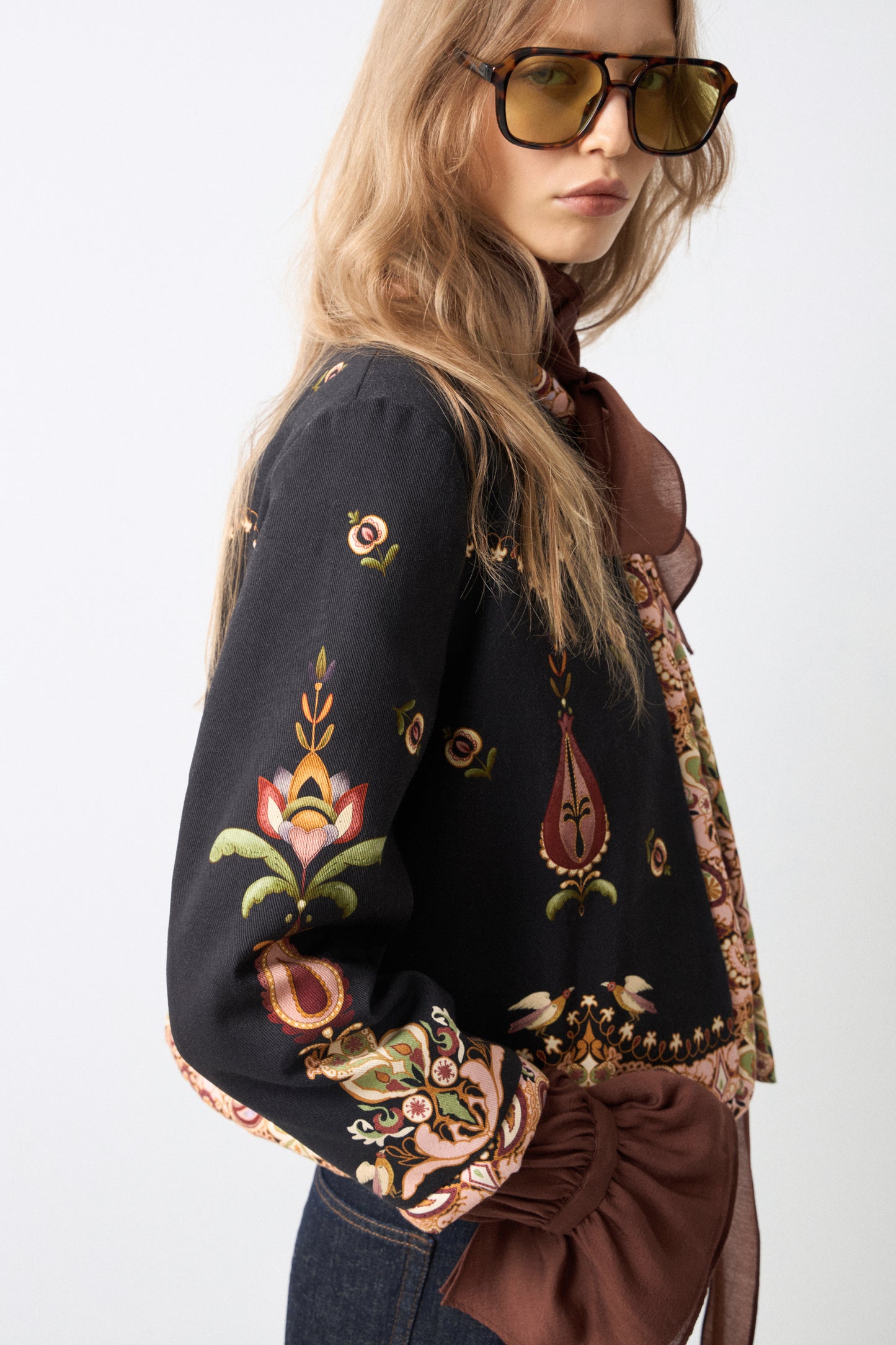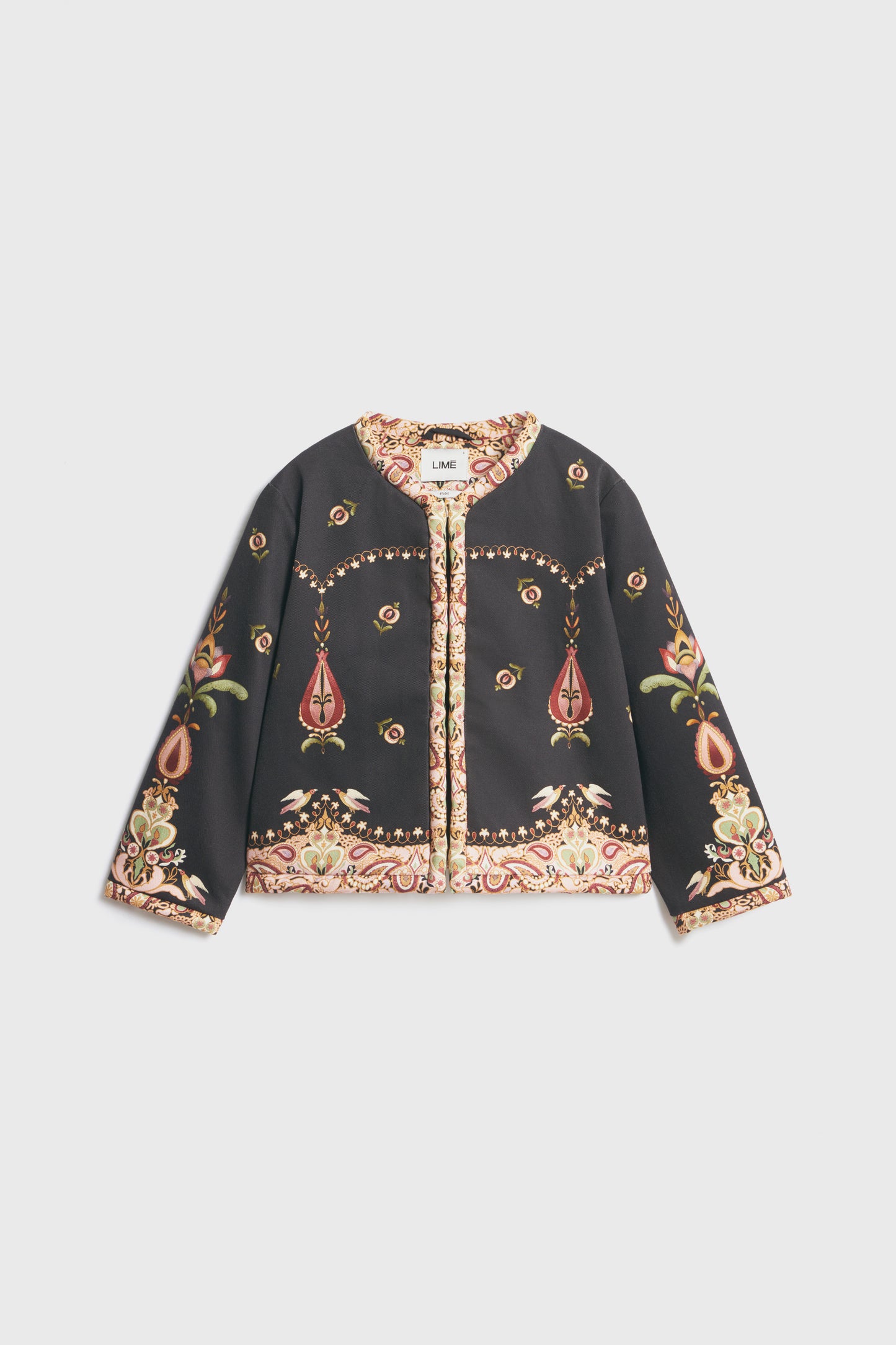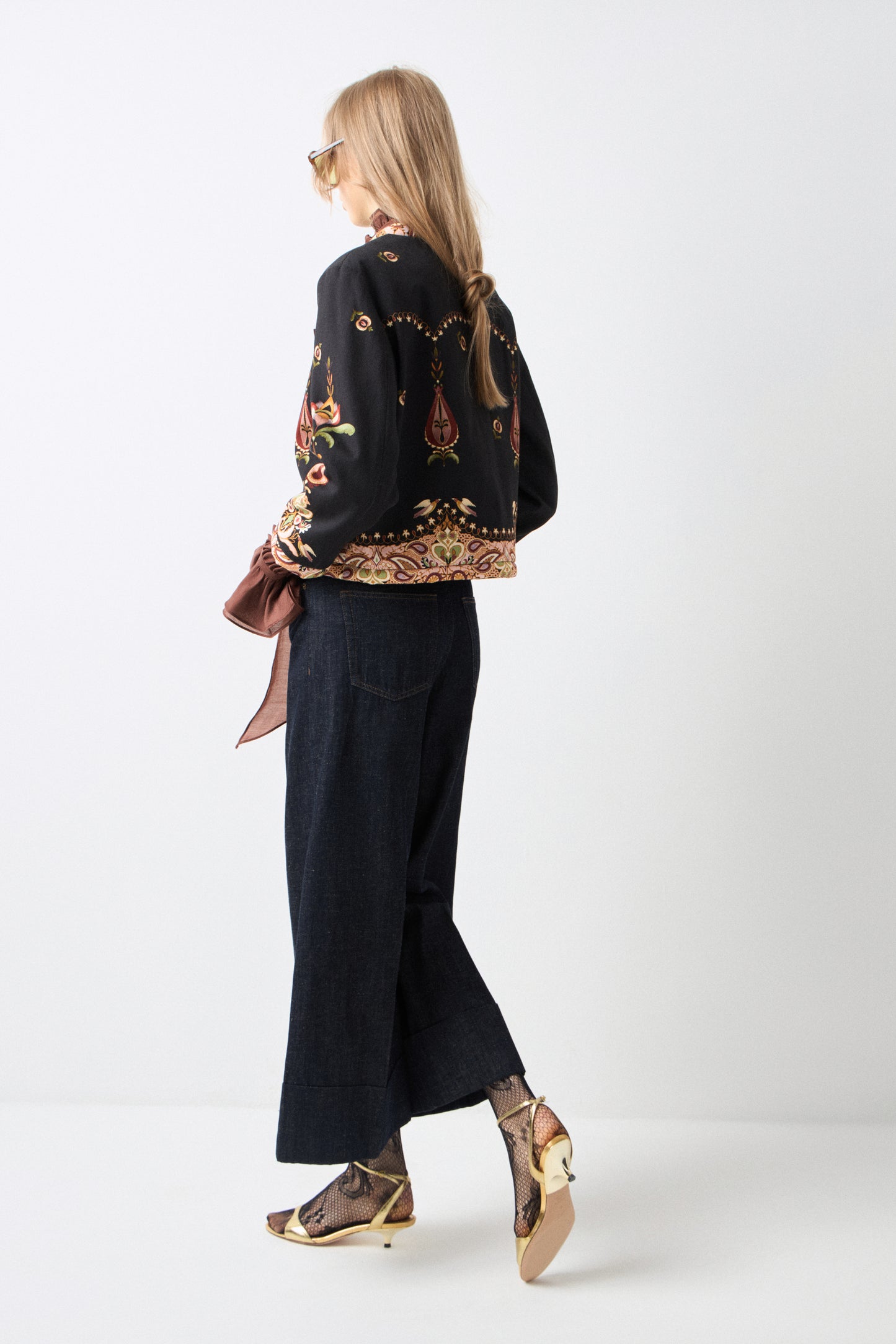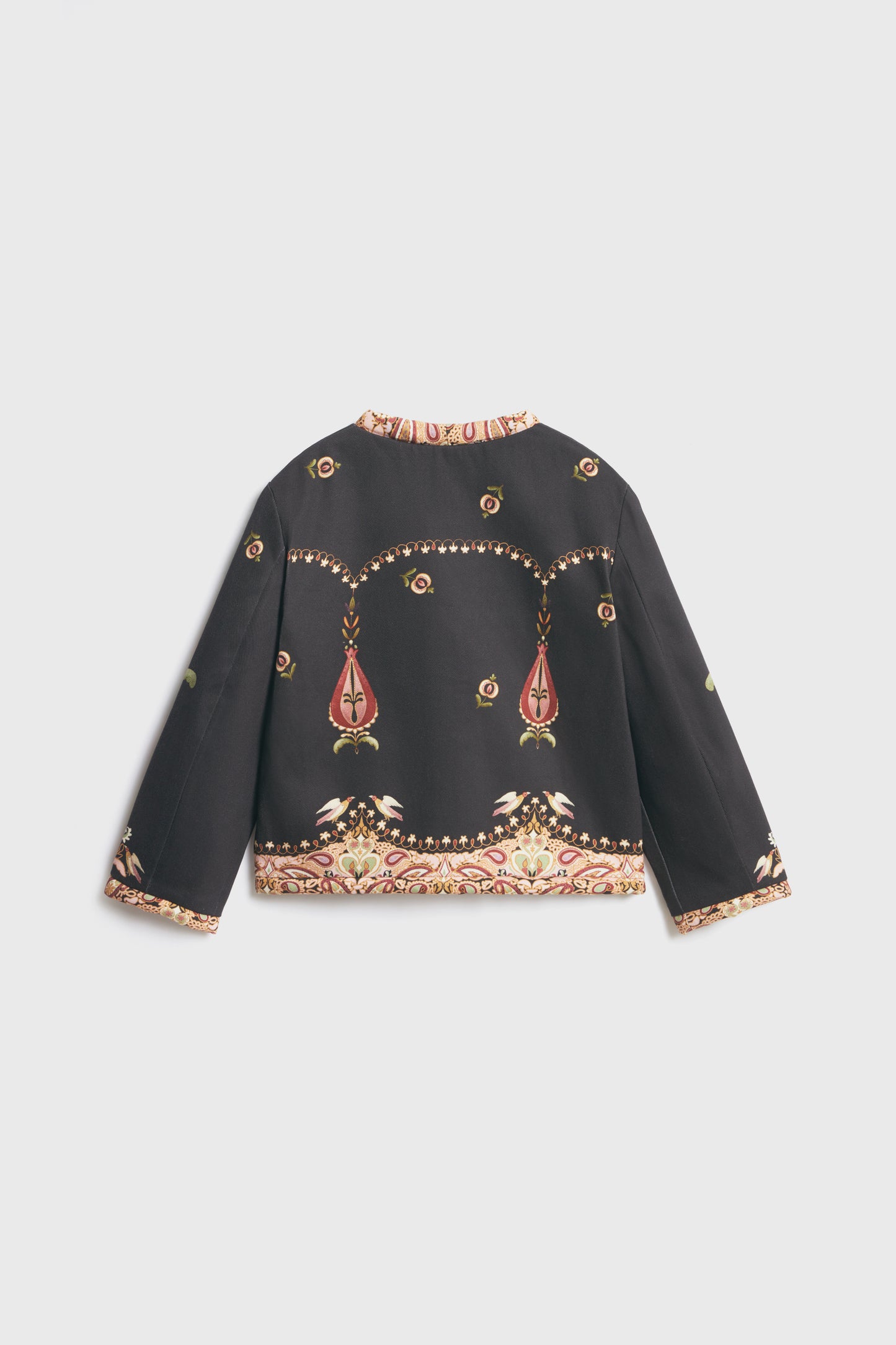 Boxy jacket in cotton made unique by its texture and precious floral motif embellishments. Round neckline, covered hooks fasteners at front and long sleeves. Lined.