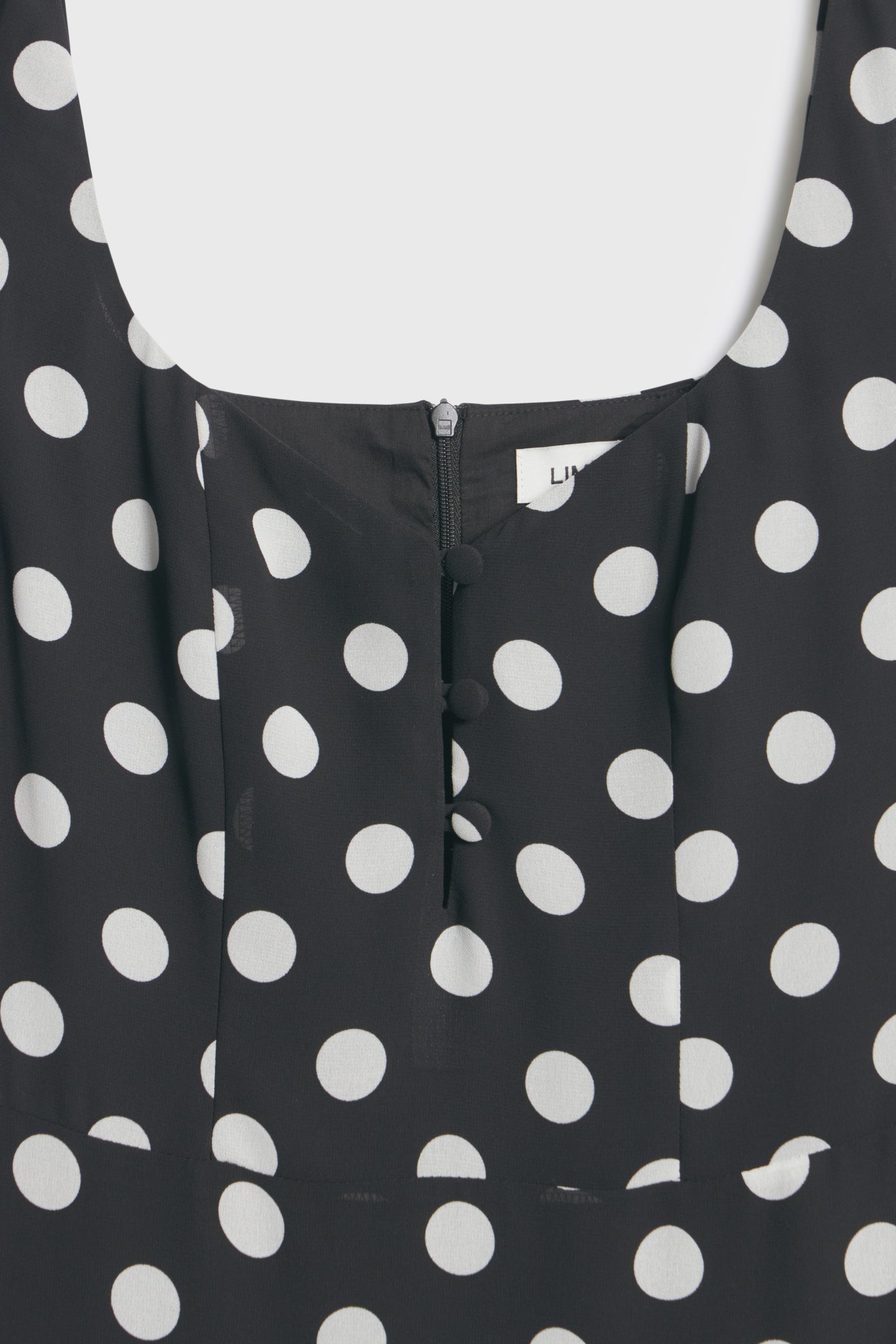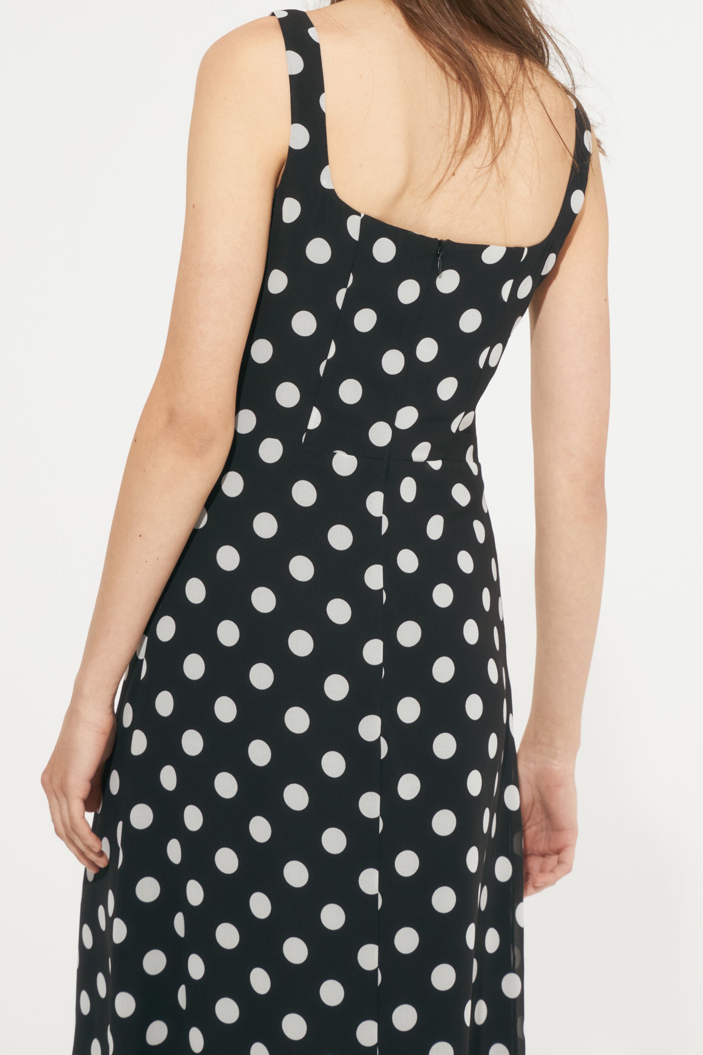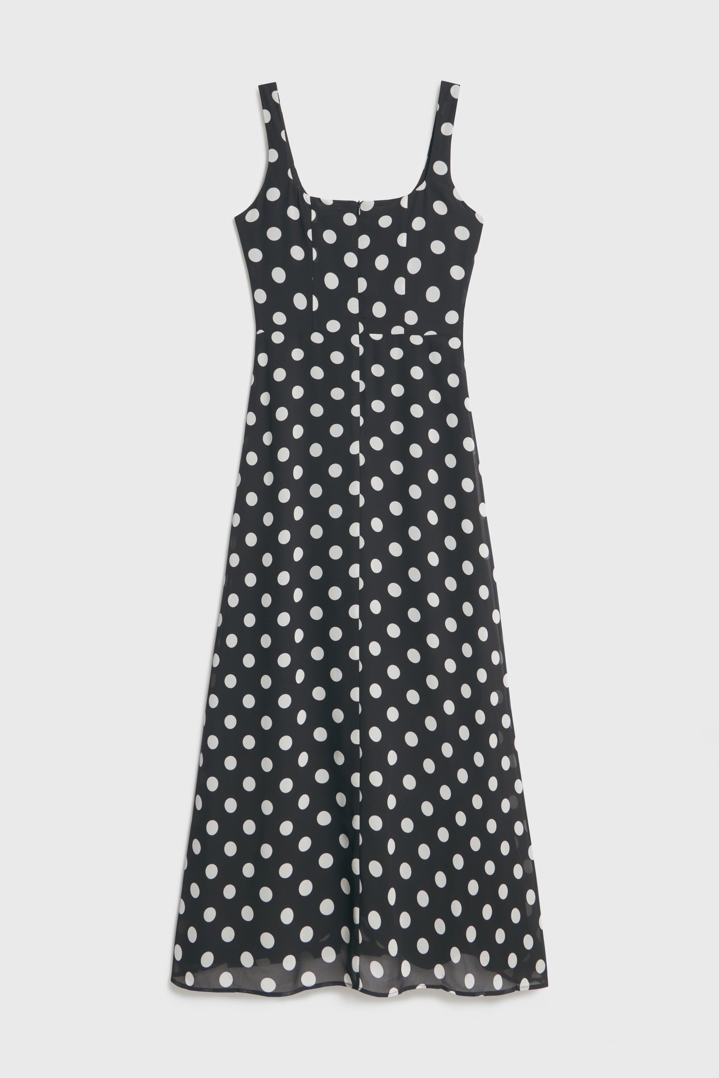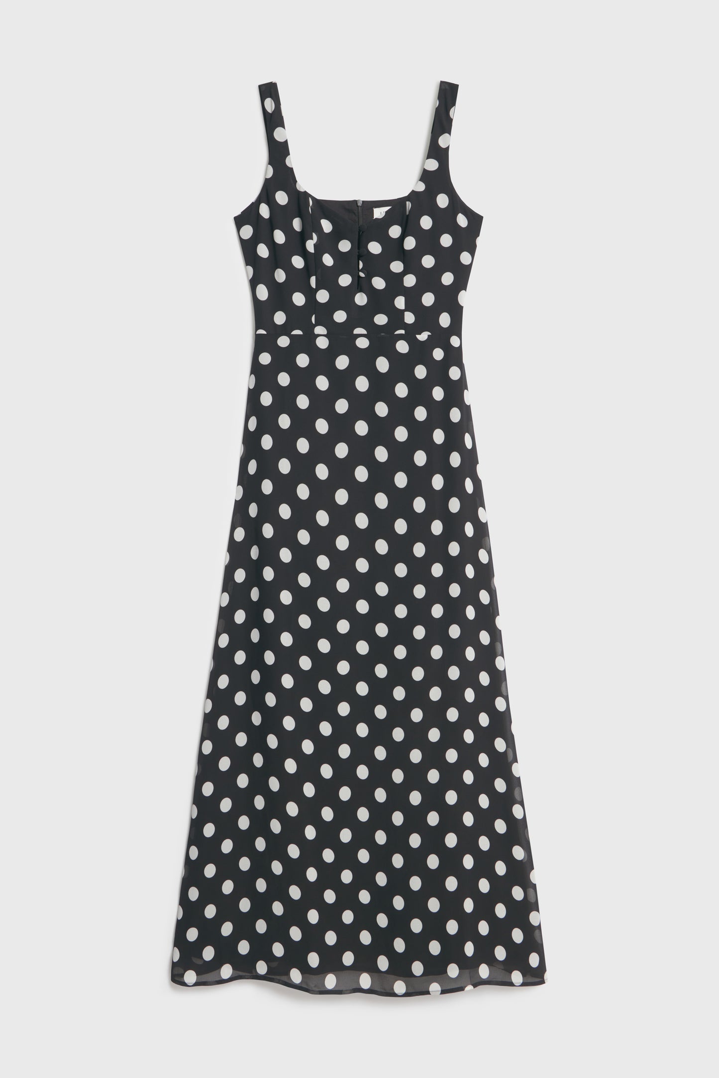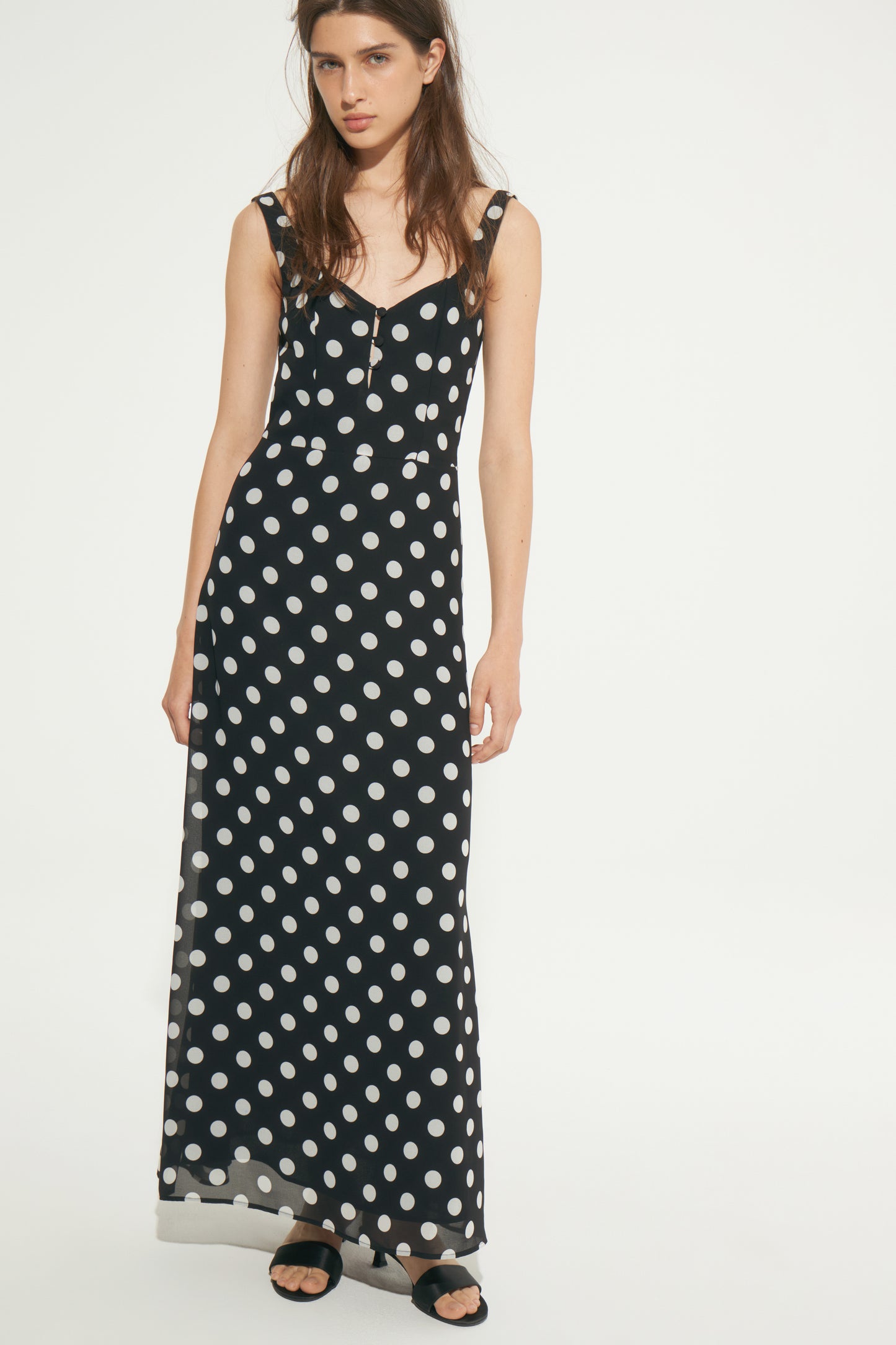 Fitted maxi dress in a printed weave with a fitted bodice, wide shoulder straps and back zip closure. Sweetheart neckline with a buttoned cutout section at the center of the bust. Lined.