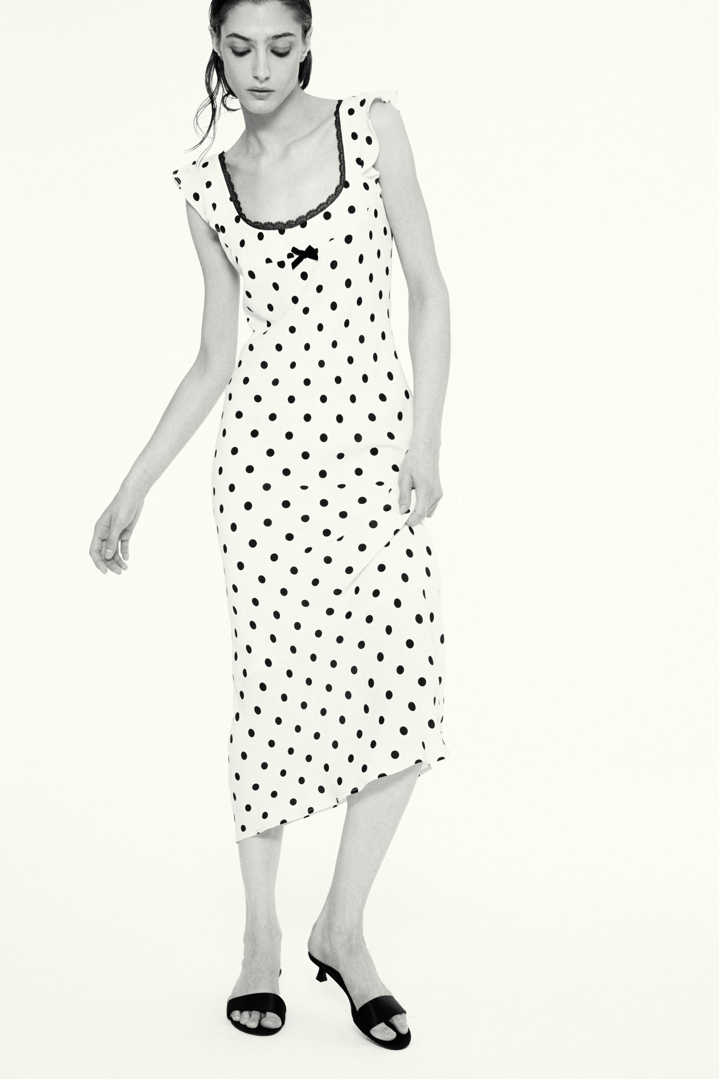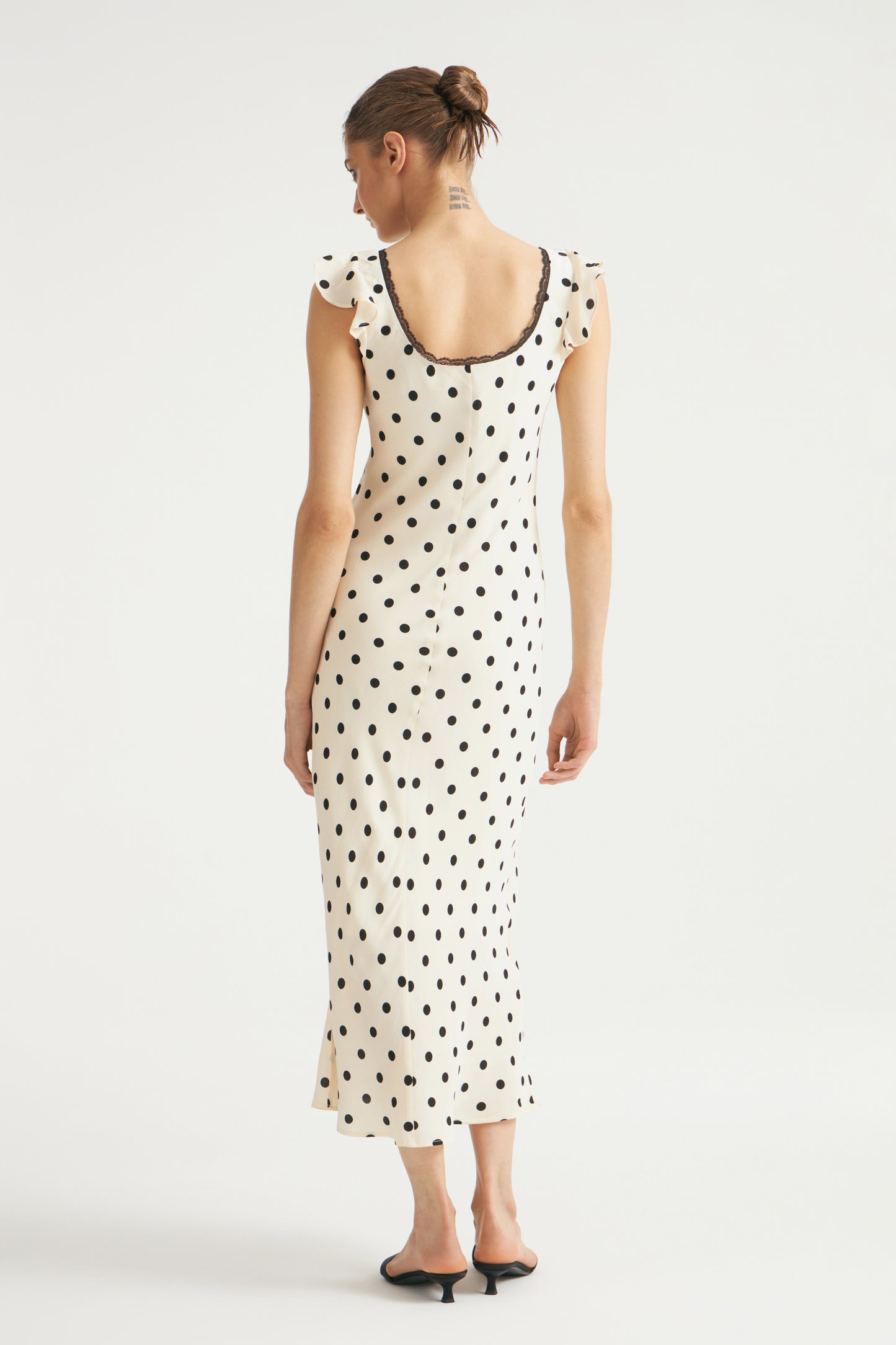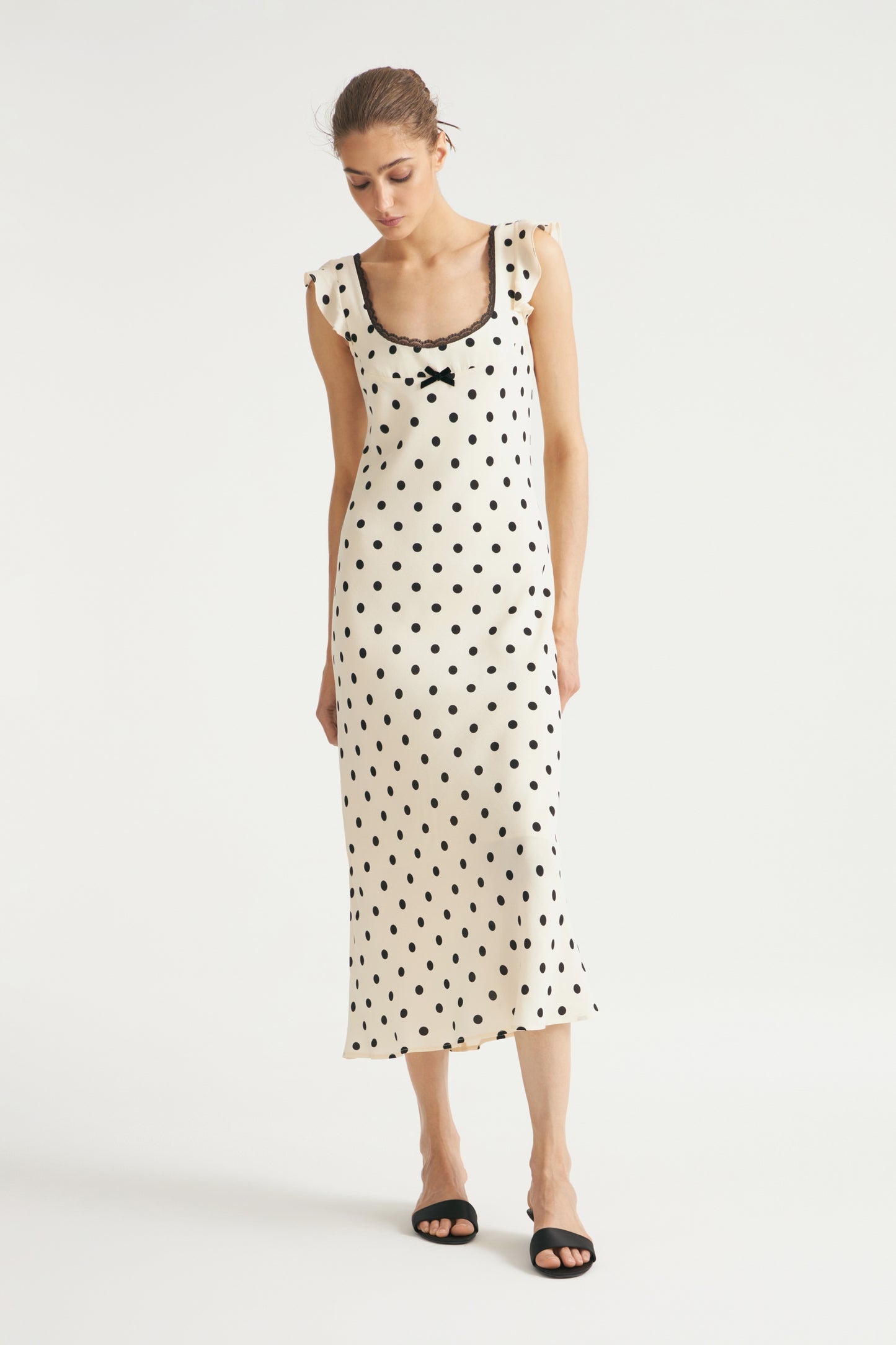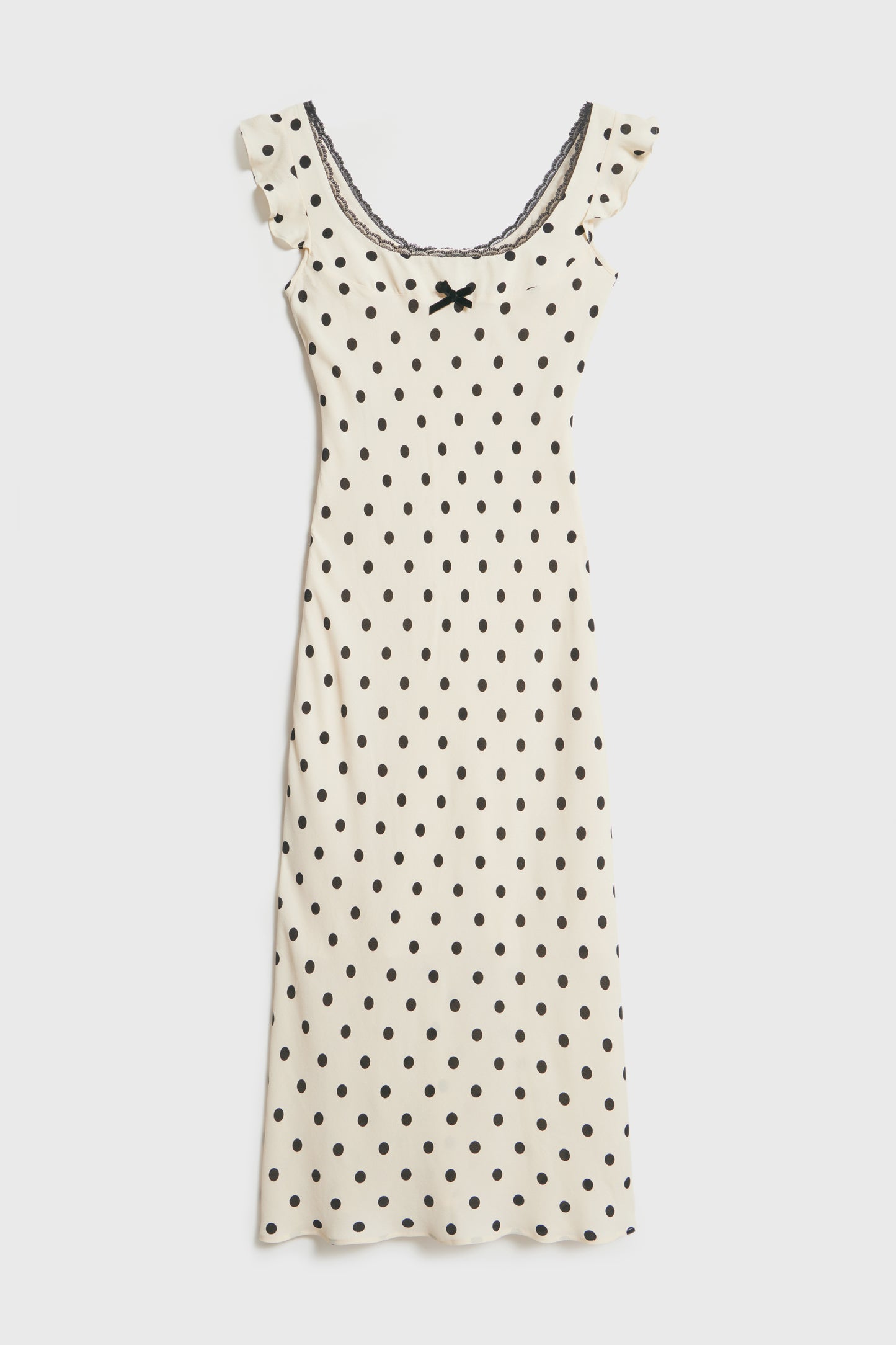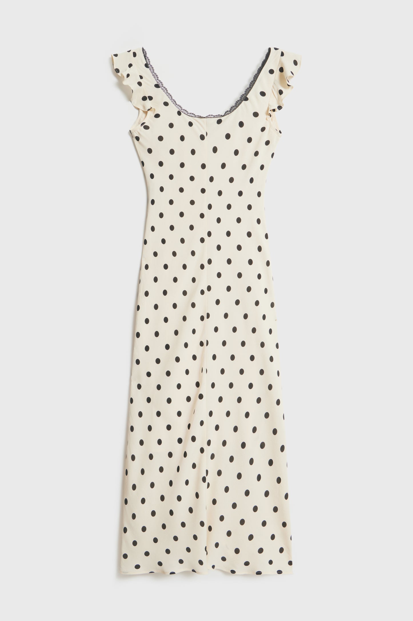 Ankle-length dress in lightweight viscose with a printed design. Rounded, deep neckline with lace trimming and small velvet bow on the front. Ruffled shoulder straps. Lined.
