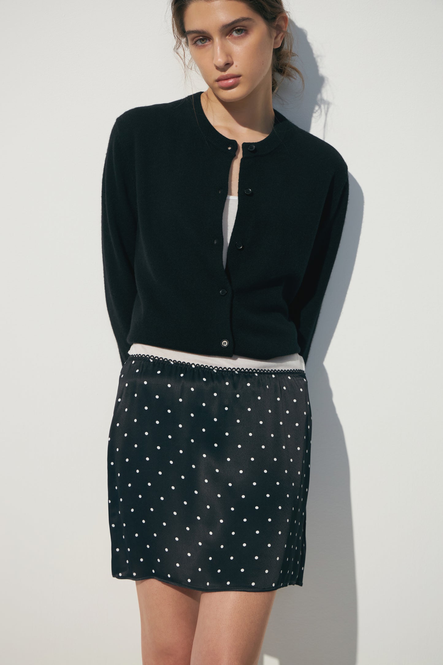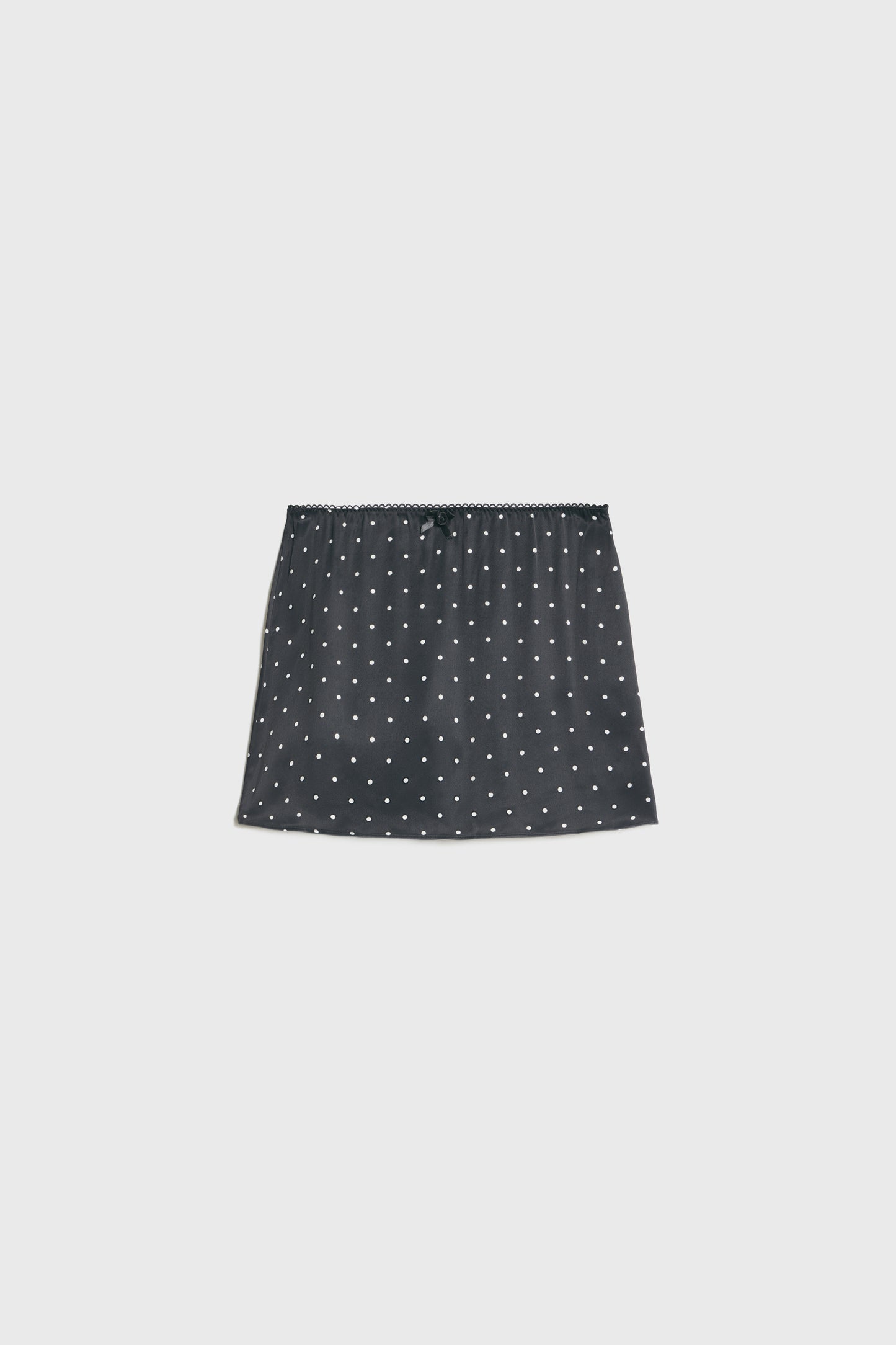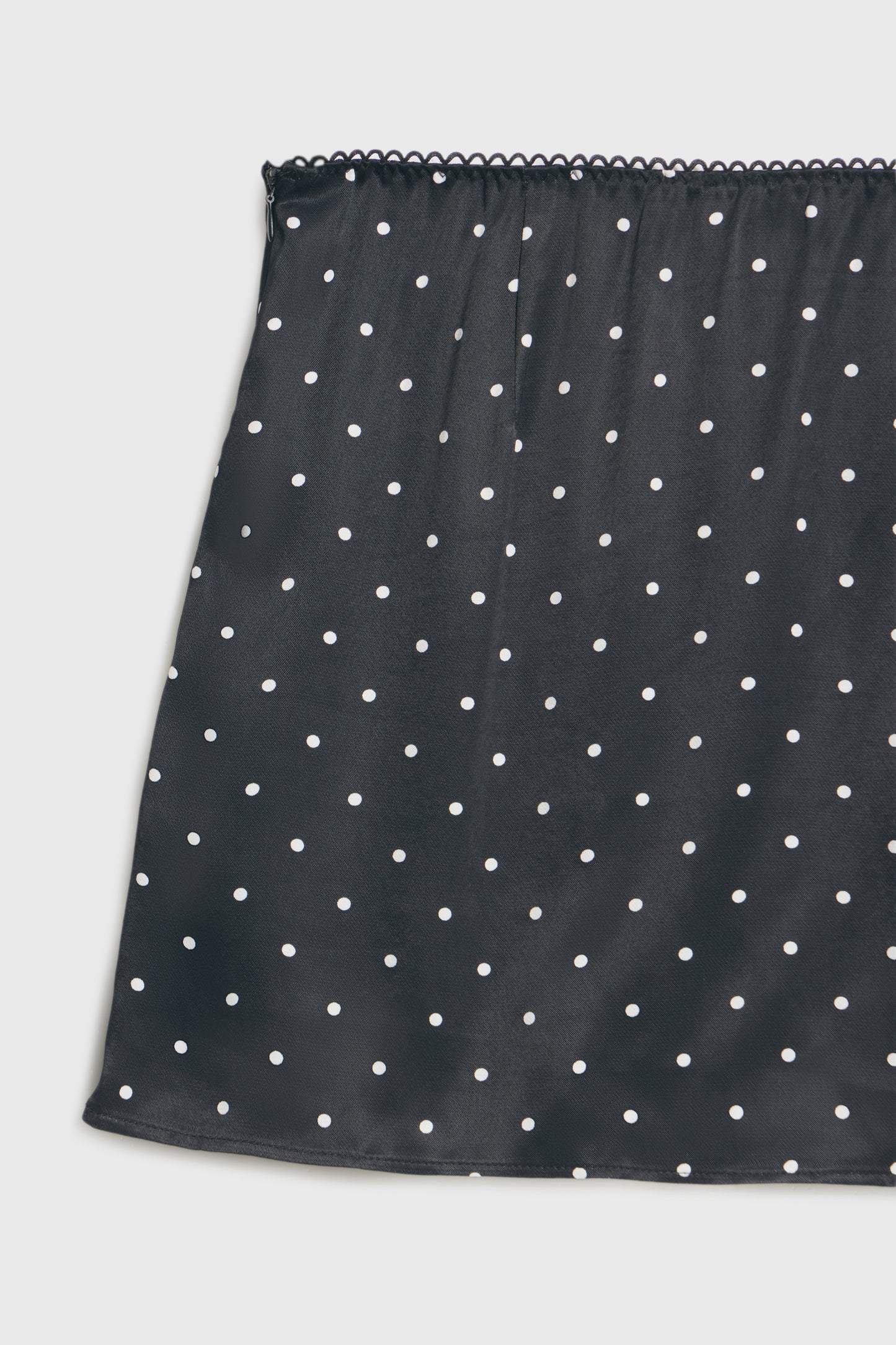 Mini skirt in woven viscose fabric with a printed design and picot trim at waist. Features a decorative satin bow. Hidden zip closure at side.