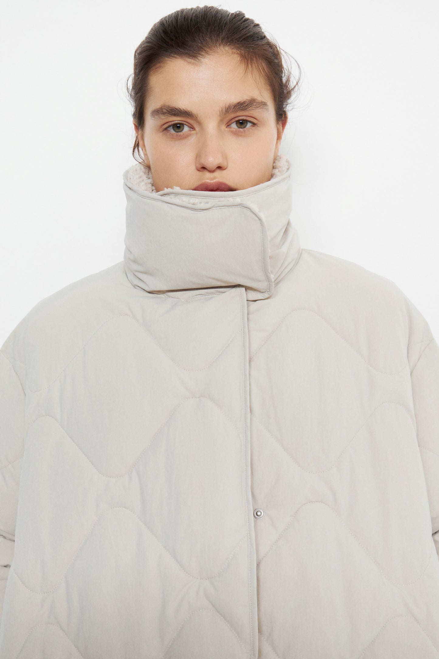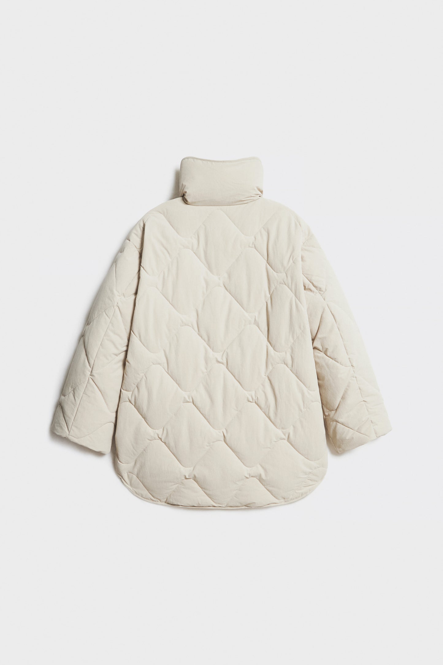 Quilted oversize waterproof jacket with a high collar and long sleeves. Front welt pockets. Asymmetric hem. Snap-buttonfront hidden by a placket. Lined and padded. Keep you warm when the temperature < -15℃
