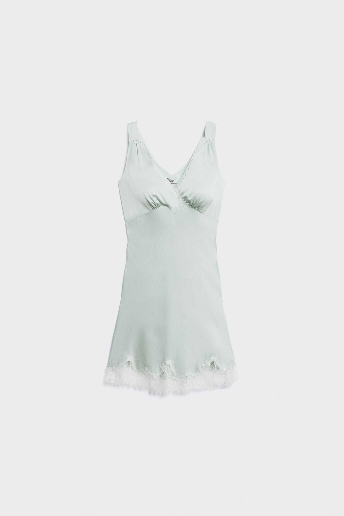 This fitted viscose satin dress embellished with sophisticated lace details at hem. V-shaped wrapover front. Wide shoulder straps.. Mini length. Top lined. Hidden zip closure at side.
