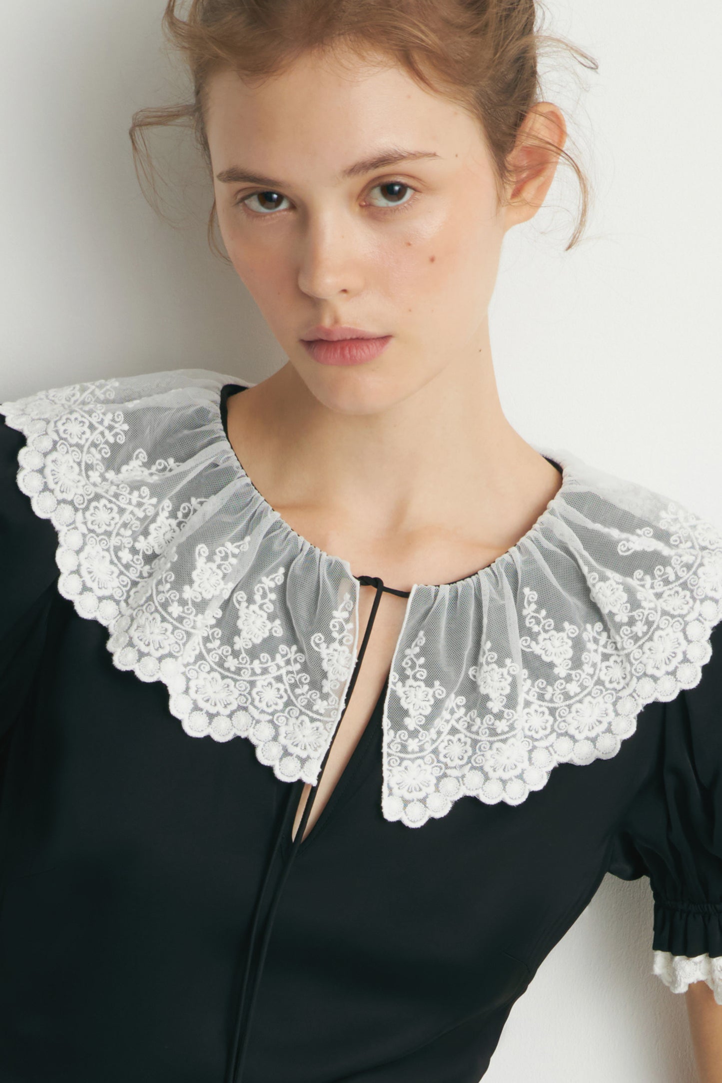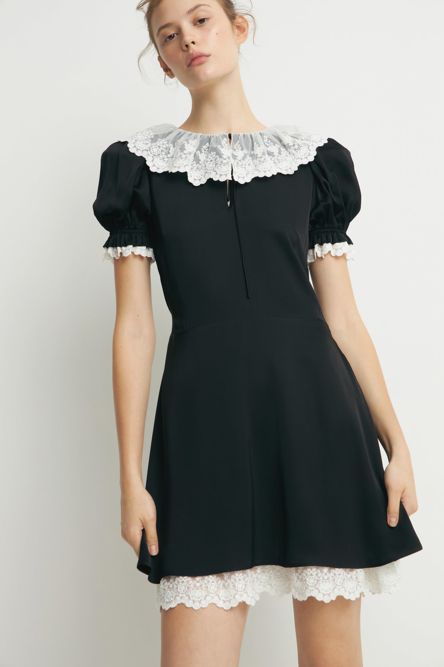Short, fitted dress in softly draped satin with scalloped lace trim. Contrast collar with ties and wide ties at back. Short sleeves with narrow trim at cuffs, and a concealed zipper at side. Lined.